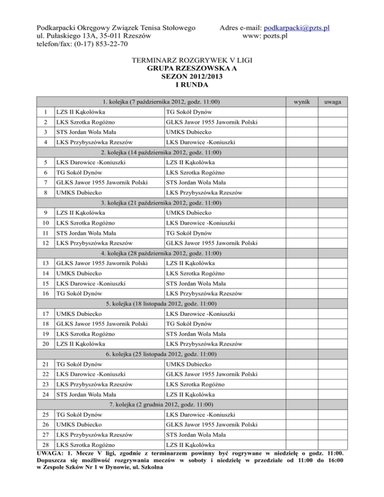 Podkarpacki Okręgowy Związek Tenisa Stołowego ul. Pułaskiego 13A, 35-011 Rzeszów telefon/fax: (0-17) 853-22-70 Adres e-mail: [email protected] www: pozts.pl TERMINARZ ROZGRYWEK V LIGI GRUPA RZESZOWSKA A SEZON 2012/2013 I RUNDA 1. kolejka (7 października 2012, godz. 11:00) 1 LZS II Kąkolówka TG Sokół Dynów 2 LKS Szrotka Rogóżno GLKS Jawor 1955 Jawornik Polski 3 STS Jordan Wola Mała UMKS Dubiecko 4 LKS Przybyszówka Rzeszów LKS Darowice -Koniuszki wynik uwaga 2. kolejka (14 października 2012, godz. 11:00) 5 LKS Darowice -Koniuszki LZS II Kąkolówka 6 TG Sokół Dynów LKS Szrotka Rogóżno 7 GLKS Jawor 1955 Jawornik Polski STS Jordan Wola Mała 8 UMKS Dubiecko LKS Przybyszówka Rzeszów 3. kolejka (21 października 2012, godz. 11:00) 9 LZS II Kąkolówka UMKS Dubiecko 10 LKS Szrotka Rogóżno LKS Darowice -Koniuszki 11 STS Jordan Wola Mała TG Sokół Dynów 12 LKS Przybyszówka Rzeszów GLKS Jawor 1955 Jawornik Polski 4. kolejka (28 października 2012, godz. 11:00) 13 GLKS Jawor 1955 Jawornik Polski LZS II Kąkolówka 14 UMKS Dubiecko LKS Szrotka Rogóżno 15 LKS Darowice -Koniuszki STS Jordan Wola Mała 16 TG Sokół Dynów LKS Przybyszówka Rzeszów 5. kolejka (18 listopada 2012, godz. 11:00) 17 UMKS Dubiecko LKS Darowice -Koniuszki 18 GLKS Jawor 1955 Jawornik Polski TG Sokół Dynów 19 LKS Szrotka Rogóżno STS Jordan Wola Mała 20 LZS II Kąkolówka LKS Przybyszówka Rzeszów 6. kolejka (25 listopada 2012, godz. 11:00) 21 TG Sokół Dynów UMKS Dubiecko 22 LKS Darowice -Koniuszki GLKS Jawor 1955 Jawornik Polski 23 LKS Przybyszówka Rzeszów LKS Szrotka Rogóżno 24 STS Jordan Wola Mała LZS II Kąkolówka 7. kolejka (2 grudnia 2012, godz. 11:00) 25 TG Sokół Dynów LKS Darowice -Koniuszki 26 UMKS Dubiecko GLKS Jawor 1955 Jawornik Polski 27 LKS Przybyszówka Rzeszów STS Jordan Wola Mała 28 LKS Szrotka Rogóżno LZS II Kąkolówka UWAGA: 1. Mecze V ligi, zgodnie z terminarzem powinny być rogrywane w niedzielę o godz. 11:00. Dopuszcza się możliwość rozgrywania meczów w soboty i niedzielę w przedziale od 11:00 do 16:00 w Zespole Szków Nr 1 w Dynowie, ul. Szkolna