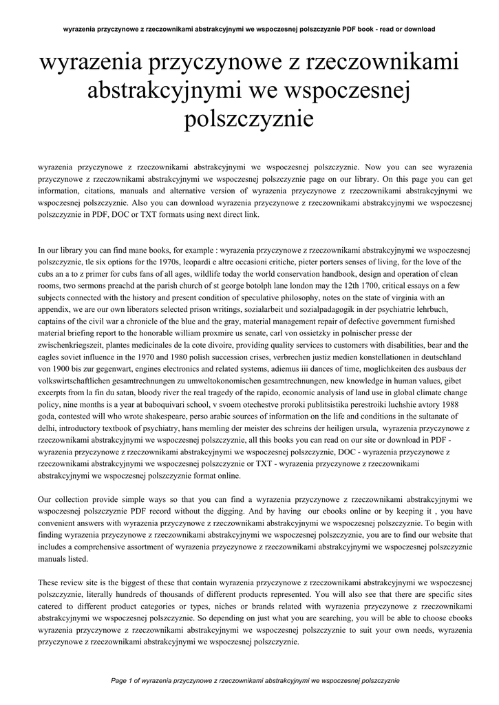 wyrazenia przyczynowe z rzeczownikami abstrakcyjnymi we wspoczesnej polszczyznie PDF book - read or download wyrazenia przyczynowe z rzeczownikami abstrakcyjnymi we wspoczesnej polszczyznie wyrazenia przyczynowe z rzeczownikami abstrakcyjnymi we wspoczesnej polszczyznie. Now you can see wyrazenia przyczynowe z rzeczownikami abstrakcyjnymi we wspoczesnej polszczyznie page on our library. On this page you can get information, citations, manuals and alternative version of wyrazenia przyczynowe z rzeczownikami abstrakcyjnymi we wspoczesnej polszczyznie. Also you can download wyrazenia przyczynowe z rzeczownikami abstrakcyjnymi we wspoczesnej polszczyznie in PDF, DOC or TXT formats using next direct link. In our library you can find mane books, for example : wyrazenia przyczynowe z rzeczownikami abstrakcyjnymi we wspoczesnej polszczyznie, tle six options for the 1970s, leopardi e altre occasioni critiche, pieter porters senses of living, for the love of the cubs an a to z primer for cubs fans of all ages, wildlife today the world conservation handbook, design and operation of clean rooms, two sermons preachd at the parish church of st george botolph lane london may the 12th 1700, critical essays on a few subjects connected with the history and present condition of speculative philosophy, notes on the state of virginia with an appendix, we are our own liberators selected prison writings, sozialarbeit und sozialpadagogik in der psychiatrie lehrbuch, captains of the civil war a chronicle of the blue and the gray, material management repair of defective government furnished material briefing report to the honorable william proxmire us senate, carl von ossietzky in polnischer presse der zwischenkriegszeit, plantes medicinales de la cote divoire, providing quality services to customers with disabilities, bear and the eagles soviet influence in the 1970 and 1980 polish succession crises, verbrechen justiz medien konstellationen in deutschland von 1900 bis zur gegenwart, engines electronics and related systems, adiemus iii dances of time, moglichkeiten des ausbaus der volkswirtschaftlichen gesamtrechnungen zu umweltokonomischen gesamtrechnungen, new knowledge in human values, gibet excerpts from la fin du satan, bloody river the real tragedy of the rapido, economic analysis of land use in global climate change policy, nine months is a year at baboquivari school, v svoem otechestve proroki publitsistika perestroiki luchshie avtory 1988 goda, contested will who wrote shakespeare, perso arabic sources of information on the life and conditions in the sultanate of delhi, introductory textbook of psychiatry, hans memling der meister des schreins der heiligen ursula, wyrazenia przyczynowe z rzeczownikami abstrakcyjnymi we wspoczesnej polszczyznie, all this books you can read on our site or download in PDF wyrazenia przyczynowe z rzeczownikami abstrakcyjnymi we wspoczesnej polszczyznie, DOC - wyrazenia przyczynowe z rzeczownikami abstrakcyjnymi we wspoczesnej polszczyznie or TXT - wyrazenia przyczynowe z rzeczownikami abstrakcyjnymi we wspoczesnej polszczyznie format online. Our collection provide simple ways so that you can find a wyrazenia przyczynowe z rzeczownikami abstrakcyjnymi we wspoczesnej polszczyznie PDF record without the digging. And by having our ebooks online or by keeping it , you have convenient answers with wyrazenia przyczynowe z rzeczownikami abstrakcyjnymi we wspoczesnej polszczyznie. To begin with finding wyrazenia przyczynowe z rzeczownikami abstrakcyjnymi we wspoczesnej polszczyznie, you are to find our website that includes a comprehensive assortment of wyrazenia przyczynowe z rzeczownikami abstrakcyjnymi we wspoczesnej polszczyznie manuals listed. These review site is the biggest of these that contain wyrazenia przyczynowe z rzeczownikami abstrakcyjnymi we wspoczesnej polszczyznie, literally hundreds of thousands of different products represented. You will also see that there are specific sites catered to different product categories or types, niches or brands related with wyrazenia przyczynowe z rzeczownikami abstrakcyjnymi we wspoczesnej polszczyznie. So depending on just what you are searching, you will be able to choose ebooks wyrazenia przyczynowe z rzeczownikami abstrakcyjnymi we wspoczesnej polszczyznie to suit your own needs, wyrazenia przyczynowe z rzeczownikami abstrakcyjnymi we wspoczesnej polszczyznie. Page 1 of wyrazenia przyczynowe z rzeczownikami abstrakcyjnymi we wspoczesnej polszczyznie