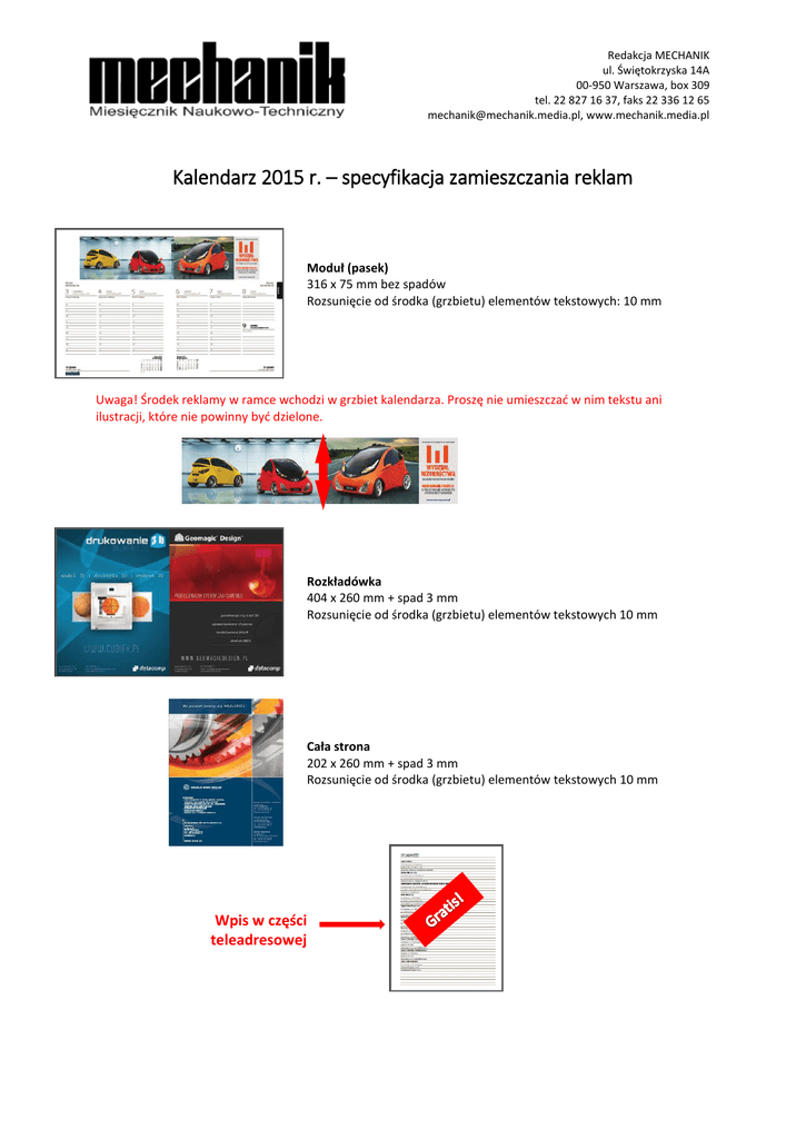 Kalendarz 2015 r. – specyfikacja zamieszczania reklam