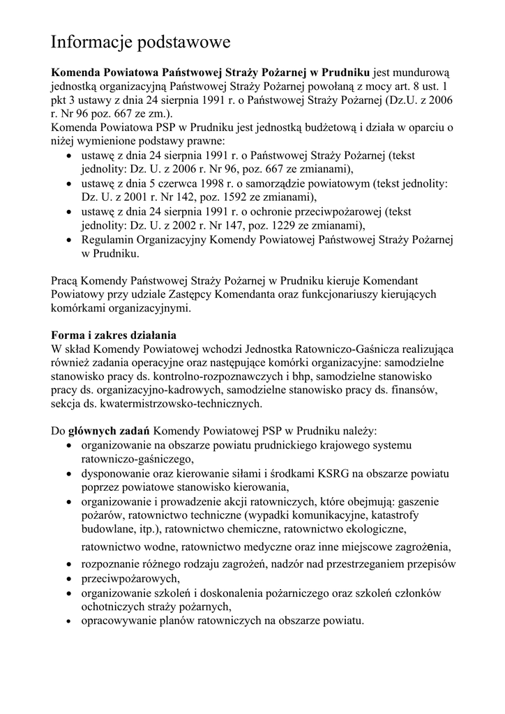 Informacje podstawowe Komenda Powiatowa Państwowej Straży Pożarnej w Prudniku jest mundurową jednostką organizacyjną Państwowej Straży Pożarnej powołaną z mocy art. 8 ust. 1 pkt 3 ustawy z dnia 24 sierpnia 1991 r. o Państwowej Straży Pożarnej (Dz.U. z 2006 r. Nr 96 poz. 667 ze zm.). Komenda Powiatowa PSP w Prudniku jest jednostką budżetową i działa w oparciu o niżej wymienione podstawy prawne: • ustawę z dnia 24 sierpnia 1991 r. o Państwowej Straży Pożarnej (tekst jednolity: Dz. U. z 2006 r. Nr 96, poz. 667 ze zmianami), • ustawę z dnia 5 czerwca 1998 r. o samorządzie powiatowym (tekst jednolity: Dz. U. z 2001 r. Nr 142, poz. 1592 ze zmianami), • ustawę z dnia 24 sierpnia 1991 r. o ochronie przeciwpożarowej (tekst jednolity: Dz. U. z 2002 r. Nr 147, poz. 1229 ze zmianami), • Regulamin Organizacyjny Komendy Powiatowej Państwowej Straży Pożarnej w Prudniku. Pracą Komendy Państwowej Straży Pożarnej w Prudniku kieruje Komendant Powiatowy przy udziale Zastępcy Komendanta oraz funkcjonariuszy kierujących komórkami organizacyjnymi. Forma i zakres działania W skład Komendy Powiatowej wchodzi Jednostka Ratowniczo-Gaśnicza realizująca również zadania operacyjne oraz następujące komórki organizacyjne: samodzielne stanowisko pracy ds. kontrolno-rozpoznawczych i bhp, samodzielne stanowisko pracy ds. organizacyjno-kadrowych, samodzielne stanowisko pracy ds. finansów, sekcja ds. kwatermistrzowsko-technicznych. Do głównych zadań Komendy Powiatowej PSP w Prudniku należy: • organizowanie na obszarze powiatu prudnickiego krajowego systemu ratowniczo-gaśniczego, • dysponowanie oraz kierowanie siłami i środkami KSRG na obszarze powiatu poprzez powiatowe stanowisko kierowania, • organizowanie i prowadzenie akcji ratowniczych, które obejmują: gaszenie pożarów, ratownictwo techniczne (wypadki komunikacyjne, katastrofy budowlane, itp.), ratownictwo chemiczne, ratownictwo ekologiczne, ratownictwo wodne, ratownictwo medyczne oraz inne miejscowe zagrożenia, • rozpoznanie różnego rodzaju zagrożeń, nadzór nad przestrzeganiem przepisów • przeciwpożarowych, • organizowanie szkoleń i doskonalenia pożarniczego oraz szkoleń członków ochotniczych straży pożarnych, • opracowywanie planów ratowniczych na obszarze powiatu.