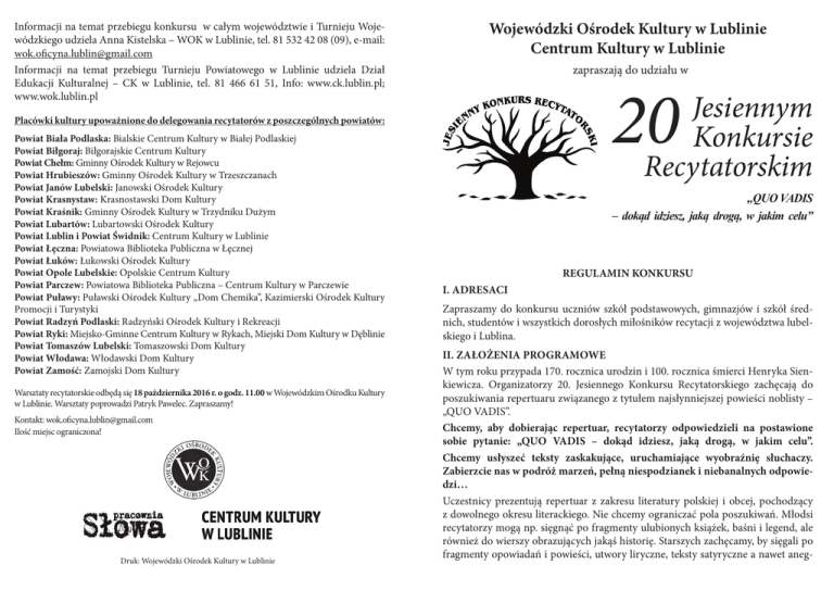 Informacji na temat przebiegu konkursu w całym województwie i Turnieju Wojewódzkiego udziela Anna Kistelska – WOK w Lublinie, tel. 81 532 42 08 (09), e-mail: [email protected] Informacji na temat przebiegu Turnieju Powiatowego w Lublinie udziela Dział Edukacji Kulturalnej – CK w Lublinie, tel. 81 466 61 51, Info: www.ck.lublin.pl; www.wok.lublin.pl Wojewódzki Ośrodek Kultury w Lublinie Centrum Kultury w Lublinie zapraszają do udziału w 20 Jesiennym Konkursie Recytatorskim Placówki kultury upoważnione do delegowania recytatorów z poszczególnych powiatów: Powiat Biała Podlaska: Bialskie Centrum Kultury w Białej Podlaskiej Powiat Biłgoraj: Biłgorajskie Centrum Kultury Powiat Chełm: Gminny Ośrodek Kultury w Rejowcu Powiat Hrubieszów: Gminny Ośrodek Kultury w Trzeszczanach Powiat Janów Lubelski: Janowski Ośrodek Kultury Powiat Krasnystaw: Krasnostawski Dom Kultury Powiat Kraśnik: Gminny Ośrodek Kultury w Trzydniku Dużym Powiat Lubartów: Lubartowski Ośrodek Kultury Powiat Lublin i Powiat Świdnik: Centrum Kultury w Lublinie Powiat Łęczna: Powiatowa Biblioteka Publiczna w Łęcznej Powiat Łuków: Łukowski Ośrodek Kultury Powiat Opole Lubelskie: Opolskie Centrum Kultury Powiat Parczew: Powiatowa Biblioteka Publiczna – Centrum Kultury w Parczewie Powiat Puławy: Puławski Ośrodek Kultury „Dom Chemika”, Kazimierski Ośrodek Kultury Promocji i Turystyki Powiat Radzyń Podlaski: Radzyński Ośrodek Kultury i Rekreacji Powiat Ryki: Miejsko-Gminne Centrum Kultury w Rykach, Miejski Dom Kultury w Dęblinie Powiat Tomaszów Lubelski: Tomaszowski Dom Kultury Powiat Włodawa: Włodawski Dom Kultury Powiat Zamość: Zamojski Dom Kultury Warsztaty recytatorskie odbędą się 18 października 2016 r. o godz. 11.00 w Wojewódzkim Ośrodku Kultury w Lublinie. Warsztaty poprowadzi Patryk Pawelec. Zapraszamy! Kontakt: [email protected] Ilość miejsc ograniczona! Druk: Wojewódzki Ośrodek Kultury w Lublinie „QUO VADIS ± GRNąG LG]LHV] MDNą GURJą Z MDNLP FHOX´ REGULAMIN KONKURSU I. ADRESACI Zapraszamy do konkursu uczniów szkół podstawowych, gimnazjów i szkół średnich, studentów i wszystkich dorosłych miłośników recytacji z województwa lubelskiego i Lublina. II. ZAŁOŻENIA PROGRAMOWE W tym roku przypada 170. rocznica urodzin i 100. rocznica śmierci Henryka Sienkiewicza. Organizatorzy 20. Jesiennego Konkursu Recytatorskiego zachęcają do poszukiwania repertuaru związanego z tytułem najsłynniejszej powieści noblisty – „QUO VADIS”. Chcemy, aby dobierając repertuar, recytatorzy odpowiedzieli na postawione sobie pytanie: „QUO VADIS – dokąd idziesz, jaką drogą, w jakim celu”. Chcemy usłyszeć teksty zaskakujące, uruchamiające wyobraźnię słuchaczy. Zabierzcie nas w podróż marzeń, pełną niespodzianek i niebanalnych odpowiedzi… Uczestnicy prezentują repertuar z zakresu literatury polskiej i obcej, pochodzący z dowolnego okresu literackiego. Nie chcemy ograniczać pola poszukiwań. Młodsi recytatorzy mogą np. sięgnąć po fragmenty ulubionych książek, baśni i legend, ale również do wierszy obrazujących jakąś historię. Starszych zachęcamy, by sięgali po fragmenty opowiadań i powieści, utwory liryczne, teksty satyryczne a nawet aneg- dotyczne, by uniknąć oczywistych skojarzeń. Niech Was w poszukiwaniach repertuarowych zainspirują słowa Jonasza Kofty: Podróżą każda miłość jest / Co różą wiatrów znaczy cel / Poniesie nas, gdzie - nie wie nikt / W jakie noce i dni. Zwracamy szczególną uwagę na przygotowanie tekstu do powiedzenia na scenie w duchu sentencji Marka Aureliusza: „Bądź zwięzły! Każde niepotrzebnie wypowiedziane słowo odpływa. Świat jest przeludniony słowami”. Wierzymy, że lepiej byłoby, gdyby recytator zostawił niedosyt, niż swoim występem ryzykował znudzenie publiczności. Jak co roku Jury krytycznie oceniać będzie wybór tekstów obecnych w podręcznikach szkolnych lub z kanonu lektur szkolnych, jeśli ich interpretacja nie będzie świadczyć o indywidualnym i osobistym podejściu do tekstu. Recytatorzy prezentują jeden dowolnie wybrany utwór prozatorski lub poetycki. Łączny nieprzekraczalny czas prezentacji: uczniowie szkół podstawowych – do 3 minut, starsi – do 5 minut. Organizator zastrzega sobie prawo do przerywania dłuższych prezentacji. Uczestnik przygotowuje repertuar nieprezentowany w innych konkursach ani w poprzednich edycjach JKR. III. Kryteria oceny Oceny prezentacji konkursowych dokona Jury powołane przez organizatora. Kryteria oceny: – wybór i dobór tekstów; – dostosowanie tekstów do możliwości wykonawczych i interpretacyjnych recytatora; – interpretacja utworów; – kultura słowa; – ogólny wyraz artystyczny. Jury przyzna nagrody rzeczowe i wyróżnienia w poszczególnych grupach wiekowych (uczniowie szkół podstawowych i starsi), wszyscy wykonawcy otrzymają pamiątkowe dyplomy. Werdykt jury jest niepodważalny. IV. Zasady organizacyjne i terminy ELIMINACJE ŚRODOWISKOWE W przypadku dużej liczby chętnych, prosimy dyrektorów szkół, domów kultury, nauczycieli i instruktorów o przeprowadzenie wstępnych eliminacji. TURNIEJE POWIATOWE Zwracamy się z prośbą o ich organizację do placówek, które już od lat nie zawiodły nas w tym trudnym zadaniu. W Turnieju Wojewódzkim może wziąć udział 5 recytatorów z każdego powiatu. O zasadach wyboru recytatorów decydują placówki upoważnione przez WOK. Eliminacje powiatowe powinny odbyć się przed 14 listopada 2016 r. (proszę pamiętać o tym, że zwykłe listy docierają do nas nawet po tygodniu od wysłania, mogą być też przesłane mailem). Nie przewidujemy bezpośrednich zgłoszeń uczestników do Konkursu Wojewódzkiego. Zaznaczamy, że organizator będzie honorował jedynie karty opatrzone pieczęcią instytucji odpowiedzialnej za kwalifikacje powiatowe. Prosimy organizatorów eliminacji powiatowych o przesłanie kart zgłoszeń 5 recytatorów w nieprz