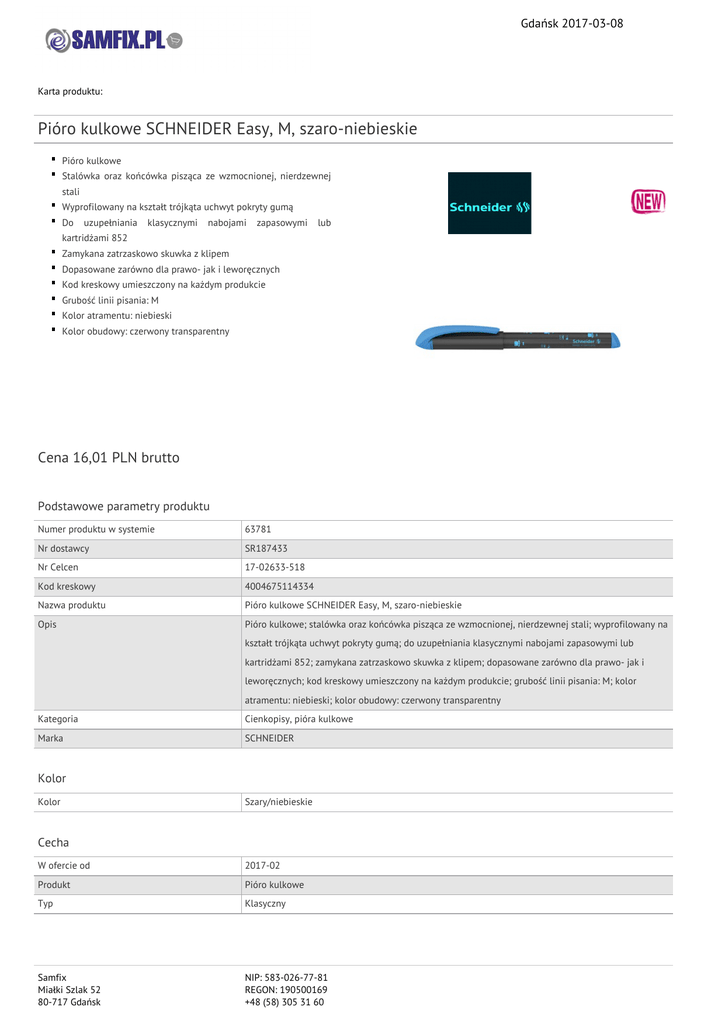 Gdańsk 2017-03-08 Karta produktu: Pióro kulkowe SCHNEIDER Easy, M, szaro-niebieskie Pióro kulkowe Stalówka oraz końcówka pisząca ze wzmocnionej, nierdzewnej stali Wyprofilowany na kształt trójkąta uchwyt pokryty gumą Do uzupełniania klasycznymi nabojami zapasowymi lub kartridżami 852 Zamykana zatrzaskowo skuwka z klipem Dopasowane zarówno dla prawo- jak i leworęcznych Kod kreskowy umieszczony na każdym produkcie Grubość linii pisania: M Kolor atramentu: niebieski Kolor obudowy: czerwony transparentny Cena 16,01 PLN brutto Podstawowe parametry produktu Numer produktu w systemie 63781 Nr dostawcy SR187433 Nr Celcen 17-02633-518 Kod kreskowy 4004675114334 Nazwa produktu Pióro kulkowe SCHNEIDER Easy, M, szaro-niebieskie Opis Pióro kulkowe; stalówka oraz końcówka pisząca ze wzmocnionej, nierdzewnej stali; wyprofilowany na kształt trójkąta uchwyt pokryty gumą; do uzupełniania klasycznymi nabojami zapasowymi lub kartridżami 852; zamykana zatrzaskowo skuwka z klipem; dopasowane zarówno dla prawo- jak i leworęcznych; kod kreskowy umieszczony na każdym produkcie; grubość linii pisania: M; kolor atramentu: niebieski; kolor obudowy: czerwony transparentny Kategoria Cienkopisy, pióra kulkowe Marka SCHNEIDER Kolor Kolor Szary/niebieskie Cecha W ofercie od 2017-02 Produkt Pióro kulkowe Typ Klasyczny Samfix Miałki Szlak 52 80-717 Gdańsk NIP: 583-026-77-81 REGON: 190500169 +48 (58) 305 31 60 Gdańsk 2017-03-08 Karta katalogowa produktu cd. Pióro kulkowe SCHNEIDER Easy, M, szaro-niebieskie Wymiary Grubość linii (mm) M Wspólny słownik zamówień CPV 30192121-5 Długopisy kulkowe Certyfikaty Hit Standard Nowy produkt w ofercie Nowość Pozostałe zdjęcia produktu Serdecznie zapraszamy do współpracy Zespół Samfix. Samfix Miałki Szlak 52 80-717 Gdańsk NIP: 583-026-77-81 REGON: 190500169 +48 (58) 305 31 60