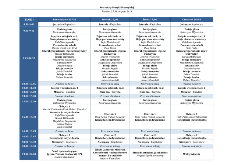 Warsztaty(Muzyki(Niezwykłej( Kraków,(25+31(sierpnia(2014(! ! (BLOK(I( Poniedziałek(25/08( Wtorek(26/08( Środa(27/08( Czwartek(28/08( 8.30F9.00( Jutrznia(F(Kapitularz( Jutrznia(F(Kapitularz( Jutrznia(F(Kapitularz( Jutrznia(F(Kapitularz( 9.00F9.45( Emisja(głosu( Katarzyna(Młynarska;( Emisja(głosu( Katarzyna(Młynarska(( Emisja(głosu( Katarzyna(Młynarska(( Emisja(głosu( Katarzyna(Młynarska( Zajęcia(w(sekcjach,(cz.1:( Moje(pierwsze(warsztaty( Rafał(Maciejewski( Prowadzenie(scholi( Marcin(Wasilewski+Kruk( Chorał(gregoriański(i(śpiew(tradycyjny( Sławek(Witkowski( Sekcja(sopranów( Magdalena(Głogowska( Sekcja(altów( Urszula(Rogala( Sekcja(tenorów( Jakub(Tomalak(( Sekcja(basów( Hubert(Kowalski* Zajęcia(w(sekcjach,(cz.(1( Moje(pierwsze(warsztaty( Rafał(Maciejewski( Prowadzenie(scholi( Piotr(Pałka( Chorał(gregoriański(i(śpiew( tradycyjny( Sławek(Witkowski( Sekcja(sopranów( Magdalena(Głogowska( Sekcja(altów( Urszula(Rogala( Sekcja(tenorów( Jakub(Tomalak(( Sekcja(basów( Hubert(Kowalski( Przerwa(na(kawę( Zajęcia(w(sekcjach,(cz.(1( Moje(pierwsze(warsztaty( Rafał(Maciejewski( Prowadzenie(scholi( Piotr(Pałka( Chorał(gregoriański(i(śpiew( tradycyjny( Sławek(Witkowski( Sekcja(sopranów( Magdalena(Głogowska( Sekcja(altów( Urszula(Rogala( Sekcja(tenorów( Jakub(Tomalak(( Sekcja(basów( Hubert(Kowalski( Przerwa(na(kawę( 10.30F10.45( Przerwa(na(kawę( Zajęcia(w(sekcjach,(cz.(1( Moje(pierwsze(warsztaty( Rafał(Maciejewski( Prowadzenie(scholi( Piotr(Pałka( Chorał(gregoriański(i(śpiew( tradycyjny( Sławek(Witkowski( Sekcja(sopranów( Magdalena(Głogowska( Sekcja(altów( Urszula(Rogala( Sekcja(tenorów( Jakub(Tomalak(( Sekcja(basów( Hubert(Kowalski* Przerwa(na(kawę( 10.45F11.30( Zajęcia(w(sekcjach,(cz.(2( Zajęcia(w(sekcjach,(cz.(2( Zajęcia(w(sekcjach,(cz.(2( Zajęcia(w(sekcjach,(cz.(2( 12.00F13.00( Msza(św.(F(Bazylika( Msza(św.(F(Bazylika( Msza(św.(F(Bazylika( Msza(św.(F(Bazylika( 13.00F15.00( Przerwa(obiadowa( Przerwa(obiadowa( Przerwa(obiadowa( Przerwa(obiadowa( Emisja(głosu( Katarzyna(Młynarska( Chór,(cz.(1( Marcin(Wasilewski+Kruk,(Hubert(Kowalski(( Konsultacje(indywidualne( Rafał(Maciejewski( Sławek(Witkowski( Magdalena(Głogowska( Urszula(Rogala( Jakub(Tomalak* Emisja(głosu( Katarzyna(Młynarska( Emisja(głosu( Katarzyna(Młynarska( Emisja(głosu( Katarzyna(Młynarska( Chór,(cz.(1( Piotr(Pałka,(Hubert(Kowalski( Konsultacje(indywidualne( Chór,(cz.(1( Piotr(Pałka,(Hubert(Kowalski( Konsultacje(indywidualne( Chór,(cz.(1( Piotr(Pałka,(Hubert(Kowalski( Konsultacje(indywidualne( 9.45F10.30( 15.00F15.30( 15.30F16.30( 16.30F16.45( Przerwa(na(kawę( Przerwa(na(kawę( Przerwa(na(kawę( Przerwa(na(kawę( 16.45F17.45( Chór,(cz.(2( Konsultacje(indywidualne( Chór,(cz.(2( Konsultacje(indywidualne( Chór,(cz.(2( Konsultacje(indywidualne( Chór,(cz.(2( Konsultacje(indywidualne( 18.00F18.30( Nieszpory*.*Kapitularz* Nieszpory*.*Kapitularz* Nieszpory*.*Kapitularz* Nieszpory*.*Kapitularz* 18.30F19.30( Przerwa(na(kolację( Przerwa(na(kolację( Przerwa(na(kolację( 19.30F22.00( Panel(z(prowadzącymi( (prow.(Tomasz(Grabowski(OP)* Miejsce:(Kapitularz* Przerwa(na(kolację( Schola(Cantorum(Minorum( Chosoviensis(–(nabożeństwo(i( koncert(ku(czci(NMP( Miejsce:(Kapitularz( Biesiada(taneczna.(Jacek(Hałas( Miejsce:(Ogród(klasztorny( Wolny(wieczór( Warsztaty(Muzyki(Niezwykłej( Kraków,(25+31(sierpnia(2014(( ! BLOK(II( Piątek(29/08( Sobota(30/08( Niedziela(31/08( 8.30F9.00( Jutrznia(F(Kapitularz( Jutrznia(F(Kapitularz( Jutrznia(F(Kapitularz( Emisja(głosu( Katarzyna(Młynarska( Zajęcia(w(sekcjach,(cz.1:( Moje(pierwsze(warsztaty( Rafał(Maciejewski( Prowadzenie(scholi( Marcin(Wasilewski+Kruk(( Chorał(gregoriański(i(śpiew(tradycyjny( Sławek(Witkowski( Sekcja(sopranów( Magdalena(Głogowska( Sekcja(altów( Paweł(Kisiel( Sekcja(tenorów( Jakub(Tomalak( Sekcja(basów( Tomasz(Rojek(OP* Emisja(głosu( Katarzyna(Młynarska( Emisja(głosu( Katarzyna(Młynarska( Zajęcia(w(sekcjach,(cz.1:( Moje(pierwsze(warsztaty( Rafał(Maciejewski( Prowadzenie(scholi( Marcin(Wasilewski+Kruk(( Chorał(gregoriański(i(śpiew(tradycyjny( Sławek(Witkowski( Sekcja(sopranów( Magdalena(Głogowska( Sekcja(altów( Paweł(Kisiel( Sekcja(tenorów( Jakub(Tomalak( Sekcja(basów( Tomasz(Rojek(OP( Chór,(cz.(1( Jakub(Tomalak,(Marcin(Wasilewski+Kruk( 10.30F10.45( Przerwa(na(kawę( Przerwa(na(kawę( Przerwa(na(kawę( 10.45F11.30( Zajęcia(w(sekcjach,(cz.(2( Zajęcia(w(sekcjach,(cz.(2( 12.00F13.00( Msza(św.(F(Bazylika( Msza(św.(F(Bazylika( 13.00F15.00( Przerwa(obiadowa( Przerwa(obiadowa( Emisja(głosu( Katarzyna(Młynarska( Chór,(cz.(1( Jakub(Tomalak,(Marcin(Wasilewski+Kruk( Konsultacje(indywidualne( Rafał(Maciejewski( Sławek(Witkowski( Magdalena(Głogowska( Paweł(Kisiel* Emisja(głosu( Katarzyna(Młynarska( 9.00F9.45( 9.45F10.30( 15.00F15.30( 15.30F16.30( Chór,(cz.(2( Msza(św.(F(Bazylika( Chór,(cz.(1( ( Konsultacje(indywidualne( 16.30F16.45( Przerwa(na(kawę( Przerwa(na(kawę( 16.45F17.45( Chór,(cz.(2( Konsultacje(indywidualne( Chór,(cz.(2( Konsultacje(indywidualne( 18.00F18.30( Nieszpory*.*Kapitularz* Nieszpory*.*Kapitularz* 18.30F19.30( Przerwa(na(kolację( Przerwa(na(kolację( 19.30F22.00( Zwiedzanie(klasztoru(i(bazyliki(oo.(dominikanów( ( ( 20:15(KONCERT:(Flores(Rosarum(&(Ensemble( Peregrina( Hildegarda(z(Bingen(Ordo(Virtutum(( Bazylika( ((