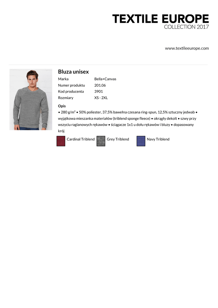 Bluza unisex Marka Bella+Canvas Numer produktu 201.06 Kod producenta 3901 Rozmiary XS - 2XL Opis • 280 g/m² • 50% poliester, 37,5% bawełna czesana ring-spun, 12,5% sztuczny jedwab • wyjątkowa mieszanka materiałów (triblend sponge fleece) • okrągły dekolt • szwy przy wszyciu raglanowych rękawów • ściągacze 1x1 u dołu rękawów i bluzy • dopasowany krój Cardinal Triblend Grey Triblend Navy Triblend