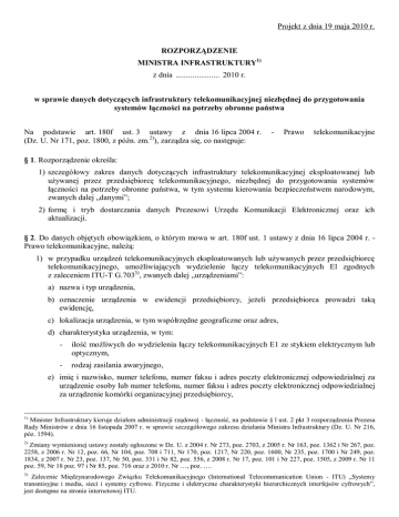 Projekt z dnia 19 maja 2010 r. ROZPORZĄDZENIE MINISTRA INFRASTRUKTURY1) z dnia ..................... 2010 r. w sprawie danych dotyczących infrastruktury telekomunikacyjnej niezbędnej do przygotowania systemów łączności na potrzeby obronne państwa Na podstawie art. 180f ust. 3 ustawy z dnia 16 lipca 2004 r. (Dz. U. Nr 171, poz. 1800, z późn. zm.2)), zarządza się, co następuje: - Prawo telekomunikacyjne § 1. Rozporządzenie określa: 1) szczegółowy zakres danych dotyczących infrastruktury telekomunikacyjnej eksploatowanej lub używanej przez przedsiębiorcę telekomunikacyjnego, niezbędnej do przygotowania systemów łączności na potrzeby obronne państwa, w tym systemu kierowania bezpieczeństwem narodowym, zwanych dalej „danymi”; 2) formę i tryb dostarczania danych Prezesowi Urzędu Komunikacji Elektronicznej oraz ich aktualizacji. § 2. Do danych objętych obowiązkiem, o którym mowa w art. 180f ust. 1 ustawy z dnia 16 lipca 2004 r. Prawo telekomunikacyjne, należą: 1) w przypadku urządzeń telekomunikacyjnych eksploatowanych lub używanych przez przedsiębiorcę telekomunikacyjnego, umożliwiających wydzielenie łączy telekomunikacyjnych El zgodnych z zaleceniem ITU-T G.7033), zwanych dalej „urządzeniami”: a) nazwa i typ urządzenia, b) oznaczenie urządzenia w ewidencji przedsiębiorcy, jeżeli przedsiębiorca prowadzi taką ewidencję, c) lokalizacja urządzenia, w tym współrzędne geograficzne oraz adres, d) charakterystyka urządzenia, w tym: - ilość możliwych do wydzielenia łączy telekomunikacyjnych E1 ze stykiem elektrycznym lub optycznym, - rodzaj zasilania awaryjnego, e) imię i nazwisko, numer telefonu, numer faksu i adres poczty elektronicznej odpowiedzialnej za urządzenie osoby lub numer telefonu, numer faksu i adres poczty elektronicznej odpowiedzialnej za urządzenie komórki organizacyjnej przedsiębiorcy, 1) Minister Infrastruktury kieruje działem administracji rządowej - łączność, na podstawie § l ust. 2 pkt 3 rozporządzenia Prezesa Rady Ministrów z dnia 16 listopada 2007 r. w sprawie szczegółowego zakresu działania Ministra Infrastruktury (Dz. U. Nr 216, póz. 1594). 2) Zmiany wymienionej ustawy zostały ogłoszone w Dz. U. z 2004 r. Nr 273, poz. 2703, z 2005 r. Nr 163, poz. 1362 i Nr 267, poz. 2258, z 2006 r. Nr 12, poz. 66, Nr 104, poz. 708 i 711, Nr 170, poz. 1217, Nr 220, poz. 1600, Nr 235, poz. 1700 i Nr 249, poz. 1834, z 2007 r. Nr 23, poz. 137, Nr 50, poz. 331 i Nr 82, poz. 556, z 2008 r. Nr 17, poz. 101 i Nr 227, poz. 1505, z 2009 r. Nr 11 poz. 59, Nr 18 poz. 97 i Nr 85, poz. 716 oraz z 2010 r. Nr …, poz. …. 3) Zalecenie Międzynarodowego Związku Telekomunikacyjnego (International Telecommunication Union - ITU) „Systemy transmisyjne i media, sieci i systemy cyfrowe. Fizyczne i elektryczne charakterystyki hierarchicznych interfejsów cyfrowych”, jest dostępne na stronie internetowej ITU. f) informacje o obiekcie, w którym urządzenie jest zamontowane, w tym: - rodzaj obiektu budowlanego, - imię i nazwisko lub nazwę oraz adres zamieszkania lub siedziby właściciela obiektu; 2) w przypadku telekomunikacyjnej sieci szkieletowej eksploatowanej lub używanej przez przedsiębiorcę telekomunikacyjnego: a) informacje o węzłach sieci, w tym: - nazwę, - oznaczenie w ewidencji przedsiębiorcy, jeżeli przedsiębiorca prowadzi taką ewidencję, - realizowane funkcje, - lokalizację, w tym współrzędne geograficzne oraz adres, b) informacje o traktach telekomunikacyjnych, w tym: - nazwę, - oznaczenie w ewidencji przedsiębiorcy, jeżeli przedsiębiorca prowadzi taką ewidencję, - rodzaj i typ medium transmisyjnego, - rodzaj stosowanego systemu transmisji, - maksymalną przepustowość, c) imię i nazwisko, numer telefonu, numer faksu lub adres poczty elektronicznej odpowiedzialnej za zarządzanie siecią osoby lub numer telefonu, numer faksu i adres poczty elektronicznej odpowiedzialnej za zarządzanie siecią komórki organizacyjnej przedsiębiorcy, d) schemat sieci szkieletowej. § 3. l. Przedsiębiorca telekomunikacyjny dostarcza dane na informatycznym nośniku danych, przedstawione za pomocą formularzy umieszczonych na stronie internetowej Urzędu Komunikacji Elektronicznej, a w przypadku braku takiej możliwości w formie papierowej. 2. Dane, o których mowa w § 2 pkt 2 lit. d, przedsiębiorca telekomunikacyjny dostarcza w postaci graficznej. 3. Dane na informatycznym nośniku danych przekazywane są zgodnie z minimalnymi wymaganiami dla rejestrów publicznych i wymiany informacji w formie elektronicznej w rozumieniu ustawy z dnia 17 lutego 2005 r. o informatyzacji działalności podmiotów realizujących zadania publiczne (Dz. U. Nr 64, poz. 565, z późn. zm.4)). § 4. 1. Przedsiębiorca telekomunikacyjny dostarcza dane w terminie 30 dni od dnia wezwania przez Prezesa Urzędu Komunikacji Elektronicznej do ich dostarczenia. 2. Aktualizacji przekazanych danych przedsiębiorca telekomunikacyjny dokonuje bez wezwania. 3. Do aktualizacji danych stosuje się przepisy § 3. § 5. Rozporządzenie wchodzi w życie po upływie 14 dni od dnia ogłoszenia. MINISTER INFRASTRUKTURY 4) Zmiany wymienionej ustawy zostały ogłoszone w Dz. U. z 2006 r. Nr 12, poz. 65 i Nr 73, poz. 501, z 2008 r. Nr 127, poz. 817 oraz z 2009 r. Nr 157, poz. 1241. UZASADNIENIE Projekt rozporządzenia Ministra Infrastruktury w sprawie danych dotyczących infrastruktury telekomunikacyjnej eksploatowanej lub używanej przez przedsiębiorców telekomunikacyjnych, niezbędnej do przygotowania systemów łączności na potrzeby obronne państwa (zwanych dalej „danymi”) stanowi wykonanie upoważnienia zawartego w art. 180f ust. 3 ustawy z dnia 16 lipca 2004 r. Prawo telekomunikacyjne (Dz. U. Nr 171, poz. 1800), zwanej dalej „ustawą”. Art. 180f ust. 2 ustawy nakłada na Prezesa Urzędu Komunikacji Elektronicznej, zwanego dalej „Prezesem UKE”, obowiązek utworzenia bazy danych, w której będą gromadzone dane o infrastruk