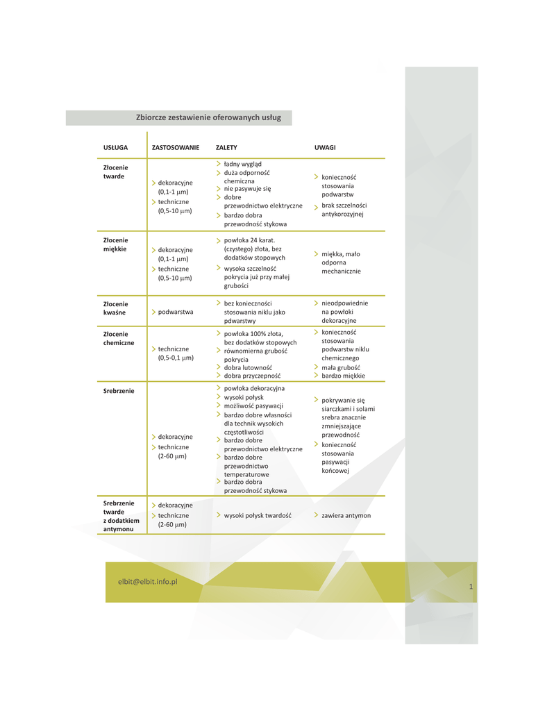 Zbiorcze zestawienie oferowanych us³ug US£UGA Z³ocenie twarde Z³ocenie miêkkie Z³ocenie kwaœne Z³ocenie chemiczne ZASTOSOWANIE dekoracyjne (0,1-1 m m) techniczne (0,5-10 m m) dekoracyjne (0,1-1 m m) techniczne (0,5-10 m m) ³adny wygl¹d du¿a odpornoœæ chemiczna nie pasywuje siê dobre przewodnictwo elektryczne bardzo dobra przewodnoœæ stykowa pow³oka 24 karat. (czystego) z³ota, bez dodatków stopowych wysoka szczelnoœæ pokrycia ju¿ przy ma³ej gruboœci UWAGI koniecznoœæ stosowania podwarstw brak szczelnoœci antykorozyjnej miêkka, ma³o odporna mechanicznie podwarstwa bez koniecznoœci stosowania niklu jako pdwarstwy nieodpowiednie na pow³oki dekoracyjne techniczne (0,5-0,1 m m) pow³oka 100% z³ota, bez dodatków stopowych równomierna gruboœæ pokrycia dobra lutownoœæ dobra przyczepnoœæ koniecznoœæ stosowania podwarstw niklu chemicznego ma³a gruboœæ bardzo miêkkie Srebrzenie dekoracyjne techniczne (2-60 m m) Srebrzenie twarde z dodatkiem antymonu ZALETY dekoracyjne techniczne (2-60 m m) [email protected] pow³oka dekoracyjna wysoki po³ysk mo¿liwoœæ pasywacji bardzo dobre w³asnoœci dla technik wysokich czêstotliwoœci bardzo dobre przewodnictwo elektryczne bardzo dobre przewodnictwo temperaturowe bardzo dobra przewodnoœæ stykowa wysoki po³ysk twardoœæ pokrywanie siê siarczkami i solami srebra znacznie zmniejszaj¹ce przewodnoœæ koniecznoœæ stosowania pasywacji koñcowej zawiera antymon 1 US£UGA Srebrzenie chemiczne ZASTOSOWANIE techniczne UWAGI ZALETY gorsza lutownoœæ ni¿ w przypadku z³ocenia chemicznego bardzo dobre w³asnoœci w technikach wysokich czêstotliwoœci dobra przyczepnoœæ wysoki po³ysk dekoracyjne Niklowanie techniczne podpow³oka (2-20 m m) Niklowanie chemiczne Nikiel czarny MiedŸ cyjankowa techniczne (5-60 m m) podpow³oka (5-10 m m) du¿a odpornoœæ na warunki atmosferyczne stosowane jako podwarstwa ze wzglêdu na w³asnoœci wyg³adzania i szczelnoœæ stosowane jako pow³oka stykowa i przewodz¹ca du¿a twardoœæ brak doprowadzenia pr¹dowego dobra przyczepnoœæ pow³oka stopowa z zawartoœci¹ fosforu (2-15%) du¿a odpornoœæ mechaniczna du¿a odpornoœæ antykorozyjna pow³oka stykowa bardzo wysoka twardoœæ wysoka odpornoœæ na œcieranie du¿a plastycznoœæ dobra przyczepnoœæ wysoki punkt topnienia dobra przewodnoœæ elektryczna i cieplna dobra lutownoœæ dobre zachowanie przy poœlizgu uczula nie stosowany do kontaktu z ¿ywnoœci¹ oraz elementami, które maja bezpoœredni kontakt z ludzk¹ skór¹ nierównomierna gruboœæ niklu na detalu brak po³ysku dekoracyjne czarny transparentny kolor ma³a odpornoœæ antykorozyjna ma³a odpornoœæ mechaniczna podpow³oka techniczne (2-20 m m) osadza siê na prawie wszystkich metalach szczelna warstwa buforowa dobrze przewodzi pr¹d i ciep³o matowa ró¿owa barwa aktywna chemicznie [email protected] 2 US£UGA MiedŸ kwaœna ZASTOSOWANIE podpow³oka techniczne (2-20 m m) dekoracyjne Cynowanie ochronne techniczne (4-20 m m) Anodowanie twarde Anodowanie miêkkie ochronne Pomiary gruboœci w niektórych œrodowiskach sprawdza siê jako pow³oka antykorozyjna pow³oka stykowa dobrze lutowna pow³oka dobrze przewodz¹ca zwiêksza poslizg du¿a wytrzyma³oœæ na korozjê niska temperatura topnienia wymaga zapewnienia dobrego po³¹czenia elektrycznego poprawia odpornoœæ mechaniczn¹ poprawia g³adkoœæ powierzchni zapewnia warstwê dielektryczn¹ nie chroni przed substancjami zasadowymi wygl¹d zale¿y w du¿ym stopniu od jakoœci stopu aluminium czarne stosowane w optyce i do barwienia radiatorów du¿y wybór kolorów wygl¹d zale¿y od jakoœci stopu wyg³adza zarysowania homogenizacja powierzchni uwypukla wady odlewów brak po³ysku dekoracyjne techniczne (10-120 m m) jednolita barwa ochrona przed korozj¹ ochrona przed zarysowaniami temperatura wygrzewania oko³o 180 C kontrola pow³ok (0,01-20 m m) metoda szybka, nieniszcz¹ca pomiar punktowy lub skan powierzchni dekoracyjne ochronne dekoracyjne techniczne Szkie³kowanie Malowanie proszkowe UWAGI szczelna b³yszcz¹ca pow³oka wolna od naprê¿eñ plastyczna techniczne (4-20 m m) techniczne (5-20 m m) Barwienie aluminium ZALETY mo¿liwoœæ pomiaru kilku warstw Wykonujemy us³ugi dla klientów indywidualnych w obszarze renowacji sztuæców, bi¿uterii oraz innych elementów ozdobnych. [email protected] 3