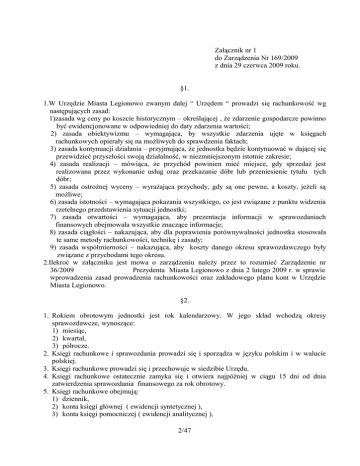 Załącznik nr 1 do Zarządzenia Nr 169/2009 z dnia 29 czerwca 2009 roku. §1. 1.W Urzędzie Miasta Legionowo zwanym dalej “ Urzędem “ prowadzi się rachunkowość wg następujących zasad: 1)zasada wg ceny po koszcie historycznym – określającej , że zdarzenie gospodarcze powinno być ewidencjonowane w odpowiedniej do daty zdarzenia wartości; 2) zasada obiektywizmu – wymagająca, by wszystkie zdarzenia ujęte w księgach rachunkowych opierały się na możliwych do sprawdzenia faktach; 3) zasada kontynuacji działania – przyjmująca, że jednostka będzie kontynuować w dającej się przewidzieć przyszłości swoją działalność, w niezmniejszonym istotnie zakresie; 4) zasada realizacji – mówiąca, że przychód powinien mieć miejsce, gdy sprzedaż jest realizowana przez wykonanie usług oraz przekazanie dóbr lub przeniesienie tytułu tych dóbr; 5) zasada ostrożnej wyceny – wyrażająca przychody, gdy są one pewne, a koszty, jeżeli są możliwe; 6) zasada istotności – wymagająca pokazania wszystkiego, co jest związane z punktu widzenia rzetelnego przedstawienia sytuacji jednostki; 7) zasada otwartości – wymagająca, aby prezentacja informacji w sprawozdaniach finansowych obejmowała wszystkie znaczące informacje; 8) zasada ciągłości – nakazująca, aby dla poprawienia porównywalności jednostka stosowała te same metody rachunkowości, technikę i zasady; 9) zasada współmierności – nakazująca, aby koszty danego okresu sprawozdawczego były związane z przychodami tego okresu. 2.Ilekroć w załączniku jest mowa o zarządzeniu należy przez to rozumieć Zarządzenie nr 36/2009 Prezydenta Miasta Legionowo z dnia 2 lutego 2009 r. w sprawie wprowadzenia zasad prowadzenia rachunkowości oraz zakładowego planu kont w Urzędzie Miasta Legionowo. §2. 1. Rokiem obrotowym jednostki jest rok kalendarzowy. W jego skład wchodzą okresy sprawozdawcze, wynoszące: 1) miesiąc, 2) kwartał, 3) półrocze. 2. Księgi rachunkowe i sprawozdania prowadzi się i sporządza w języku polskim i w walucie polskiej. 3. Księgi rachunkowe prowadzi się i przechowuje w siedzibie Urzędu. 4. Księgi rachunkowe ostatecznie zamyka się i otwiera najpóźniej w ciągu 15 dni od dnia zatwierdzenia sprawozdania finansowego za rok obrotowy. 5. Księgi rachunkowe obejmują: 1) dziennik, 2) konta księgi głównej ( ewidencji syntetycznej ), 3) konta księgi pomocniczej ( ewidencji analitycznej ), 2/47 4) wykaz składników aktywów i pasywów ( inwentarz ), 5) zestawienie obrotów i sald kont księgi głównej oraz zestawienie sald ksiąg pomocniczych . 6.Księgi rachunkowe powinny być: 1) trwale oznaczone pełną nazwą jednostki oraz zrozumiałą nazwą danego rodzaju księgi rachunkowej; 2) wyraźnie oznaczone co do roku obrotowego, a wydruki komputerowe także co do miesiąca i daty sporządzenia; 3) przechowywane starannie w ustalonej kolejności. 7.Wydruki komputerowe składają się z automatycznie numerowanych stron, z oznaczeniem pierwszej i ostatniej oraz są sumowane na kolejnych stronach w sposób ciągły w roku obrotowym i oznaczone nazwą programu przetwarzania. 8.Wydruk, oprócz wymienionych w ust. 6 elementów zawiera również : 1) określenie jednostki, której księgi rachunkowe są drukowane, 2) datę sporządzenia, 3) miesiąc i rok obrotowy, którego dotyczy wydruk. W przypadku tabulogramów kolumny kwotowe są sumowane na kolejnych stronach. 9.Wydruki komputerowe sporządza się z następującą częstotliwością: 1) dziennik – nie rzadziej niż na koniec każdego miesiąca, 2) zapisy dokonane na kontach księgi głównej – nie rzadziej niż raz – na koniec roku obrotowego, 3) zestawienie obrotów i sald kont księgi głównej – na koniec każdego miesiąca, 4) zestawienie sald wszystkich kont ksiąg pomocniczych – na dzień zamknięcia ksiąg rachunkowych, 5) zestawienie sald inwentaryzowanej grupy składników majątkowych – na dzień inwentaryzacji , 6) wydruk poświadczający kompletność i aktualność danych określających parametry przetwarzania danych – w zależności od potrzeby. §3. 1. Wykaz i opis ksiąg rachunkowych. Księgi rachunkowe prowadzi się przy użyciu komputera i obejmują: 1) zbiory systemu KBiP (system księgowo – finansowy): a) dziennik:zbiór B_KSIEGA – wykaz wszystkich operacji księgowych, b) konta księgi głównej, w której obowiązuje ujęcie każdej operacji zgodnie z zasadą podwójnego zapisu na kontach bilansowych oraz możliwość dokonywania zapisów jednostronnych na kontach pozabilansowych oraz przy wprowadzaniu bilansu otwarcia: - zbiór B_KSIEGA - całość konta księgowego, szczegółowość analityczna, - zbiór B_BILANS – bilans otwarcia, szczegółowość analityczna, - zbiór B_PLAN – plan w ujęciu analitycznym. c) konta ksiąg pomocniczych: jw. w postaci wyodrębnionych rejestrów systemu oraz wyodrębnionych systemów dziedzinowych d) zestawienie obrotów i sald kont księgi głównej oraz zestawienia sald kont ksiąg pomocniczych. 2)zbiory systemu dziedzinowego Środki Trwałe: a) zbiór ST_SRODEK – wykaz środków trwałych, b) zbiór ST_SR_DOK – wykaz dokumentów i wynikających z nich umorzeń i amortyzacji dotyczących środków trwałych, 3/47 c) zbiór ST_W_WYP – wykaz wyposażenia, d) zbiór ST_W_WYP_DOK – wykaz dokumentów dotyczących wyposażenia. 3)zbiory systemu dziedzinowego Podatki, 4)zbiory systemu dziedzinowego Rejestr VAT. 2.Wyjaśnienia dodatkowe. 1) Dziennik Dziennik w systemie KBiP służy wprowadzeniu zapisów, w postaci dekretacji księgowej, na konta księgi głównej o rozbudowanej strukturze syntetyczno-analitycznej. Wprowadzone do systemu dane o operacjach gospodarczych (dekretowane ręcznie i automatycznie), pochodzące ze wszystkich programów, są pierwotnie zestawiane w zbiorze B_KSIEGA ze statusem Niezatwierdzone. Przy przetwarzaniu dane są zapisywane, ze statusem Zatwierdzone, kompletnie i kolejno w dzienniku. 2)Konta księgi g
