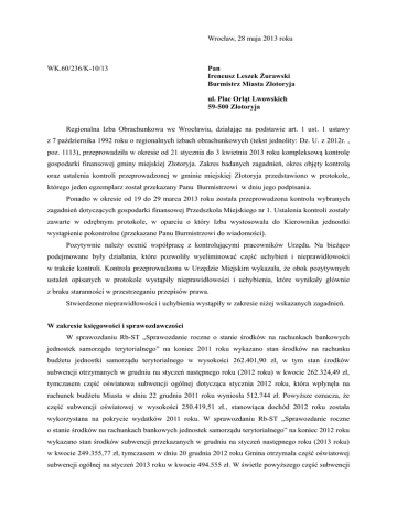 Wrocław, 28 maja 2013 roku WK.60/236/K-10/13 Pan Ireneusz Leszek Żurawski Burmistrz Miasta Złotoryja ul. Plac Orląt Lwowskich 59-500 Złotoryja Regionalna Izba Obrachunkowa we Wrocławiu, działając na podstawie art. 1 ust. 1 ustawy z 7 października 1992 roku o regionalnych izbach obrachunkowych (tekst jednolity: Dz. U. z 2012r. , poz. 1113), przeprowadziła w okresie od 21 stycznia do 3 kwietnia 2013 roku kompleksową kontrolę gospodarki finansowej gminy miejskiej Złotoryja. Zakres badanych zagadnień, okres objęty kontrolą oraz ustalenia kontroli przeprowadzonej w gminie miejskiej Złotoryja przedstawiono w protokole, którego jeden egzemplarz został przekazany Panu Burmistrzowi w dniu jego podpisania. Ponadto w okresie od 19 do 29 marca 2013 roku została przeprowadzona kontrola wybranych zagadnień dotyczących gospodarki finansowej Przedszkola Miejskiego nr 1. Ustalenia kontroli zostały zawarte w odrębnym protokole, w oparciu o który Izba wystosowała do Kierownika jednostki wystąpienie pokontrolne (przekazane Panu Burmistrzowi do wiadomości). Pozytywnie należy ocenić współpracę z kontrolującymi pracowników Urzędu. Na bieżąco podejmowane były działania, które pozwoliły wyeliminować część uchybień i nieprawidłowości w trakcie kontroli. Kontrola przeprowadzona w Urzędzie Miejskim wykazała, że obok pozytywnych ustaleń opisanych w protokole wystąpiły nieprawidłowości i uchybienia, które wynikały głównie z braku staranności w przestrzeganiu przepisów prawa. Stwierdzone nieprawidłowości i uchybienia wystąpiły w zakresie niżej wskazanych zagadnień. W zakresie księgowości i sprawozdawczości W sprawozdaniu Rb-ST „Sprawozdanie roczne o stanie środków na rachunkach bankowych jednostek samorządu terytorialnego” na koniec 2011 roku wykazano stan środków na rachunku budżetu jednostki samorządu terytorialnego w wysokości 262.401,90 zł, w tym stan środków subwencji otrzymanych w grudniu na styczeń następnego roku (2012 roku) w kwocie 262.324,49 zł, tymczasem część oświatowa subwencji ogólnej dotycząca stycznia 2012 roku, która wpłynęła na rachunek budżetu Miasta w dniu 22 grudnia 2011 roku wyniosła 512.744 zł. Powyższe oznacza, że część subwencji oświatowej w wysokości 250.419,51 zł., stanowiąca dochód 2012 roku została wykorzystana na pokrycie wydatków 2011 roku. W sprawozdaniu Rb-ST „Sprawozdanie roczne o stanie środków na rachunkach bankowych jednostek samorządu terytorialnego” na koniec 2012 roku wykazano stan środków subwencji przekazanych w grudniu na styczeń następnego roku (2013 roku) w kwocie 249.355,77 zł, tymczasem w dniu 20 grudnia 2012 roku Gmina otrzymała część oświatowej subwencji ogólnej na styczeń 2013 roku w kwocie 494.555 zł. W świetle powyższego część subwencji oświatowej, stanowiąca dochód 2013 roku, w wysokości 202.535,61 zł została przeznaczona na pokrycie wydatków 2012 roku. Tymczasem z art. 217 ust. 2 ustawy z 27 sierpnia 2009 roku o finansach publicznych (Dz. U. nr 157, poz. 1240 ze zm.) wynika, że deficyt budżetu jednostki samorządu terytorialnego może być sfinansowany przychodami pochodzącymi ze sprzedaży papierów wartościowych wyemitowanych przez jednostkę samorządu terytorialnego, kredytów, pożyczek; prywatyzacji majątku jednostki samorządu terytorialnego, nadwyżki budżetu jednostki samorządu terytorialnego z lat ubiegłych, wolnych środków jako nadwyżki środków pieniężnych na rachunku bieżącym budżetu jednostki samorządu terytorialnego, wynikających z rozliczeń wyemitowanych papierów wartościowych, kredytów i pożyczek z lat ubiegłych. W sprawozdaniu Rb-NDS kwartalne sprawozdania o nadwyżce/deficycie jednostki samorządu terytorialnego za okres od początku roku do 30 września 2012 roku w pozycji D11 „kredyty i pożyczki” wykazano po stronie wykonania przychody z tytułu kredytów i pożyczek w kwocie 1.757.394,40 zł. Tymczasem według ewidencji księgowej do konta 133 „Rachunek budżetu” oraz wyciągu bankowego wysokość kredytu zaciągniętego w rachunku bieżącym na 30 września 2012 roku wyniosła 1.754.230,23 zł. Ponadto w dniu 25 lipca 2012 roku na rachunek budżetu Miasta wpłynęła pożyczka w kwocie 100.600 zł (w związku z umową pożyczki nr 69/P/OW/LG/2012 zawartą 29 maja 2012 roku). W świetle powyższego w sprawozdaniu Rb-NDS na 30 września 2012 roku zaniżono przychody z tytułu kredytów i pożyczek o 97.435,83 zł. Zgodnie z treścią §10 pkt 6 lit. a załącznika nr 39 do rozporządzenia Ministra Finansów z 3 lutego 2010 roku w sprawie sprawozdawczości budżetowej (Dz.U. nr 20, poz. 103), w sprawozdaniu o nadwyżce/deficycie jednostki samorządu terytorialnego dane po stronie wykonania dotyczące przychodów z tytułu kredytów, pożyczek oraz wyemitowanych obligacji - zawierają łączne kwoty zobowiązań dla poszczególnych tytułów i powinny być zgodne z danymi wynikającymi z urządzeń księgowych za dany okres sprawozdawczy. Wyciąg bankowy nr 219/2012 z 8 listopada 2012 roku w ewidencji konta 133 „Rachunek budżetu” został zaewidencjonowany pod datą 31 października 2012 roku, co spowodowało niezgodność obrotów i salda tego konta o 38.220,03 zł z zapisami w księgowości banku na dzień 31 października 2012 roku. Wykazano obroty i saldo konta o 38.220,03 zł niższe niż faktyczne na 31 października 2012 roku. Według ewidencji konta 133 „Rachunek budżetu” saldo na dzień 31 października 2012 roku wyniosło minus 1.530.686,26 zł, a według wyciągu bankowego nr 214/2012 z 31 października 2012 roku wyniosło minus 1.492.466,23 zł. Zgodnie z zasadami funkcjonowania konta 133 „Rachunek budżetu”, zawartymi w przepisach rozporządzenia Ministra Finansów z 5 lipca 2010 roku w sprawie szczególnych zasad rachunkowości oraz planów kont dla budżetu państwa, budżetów jednostek samorządu terytorialnego, jednostek budżetowych, sa