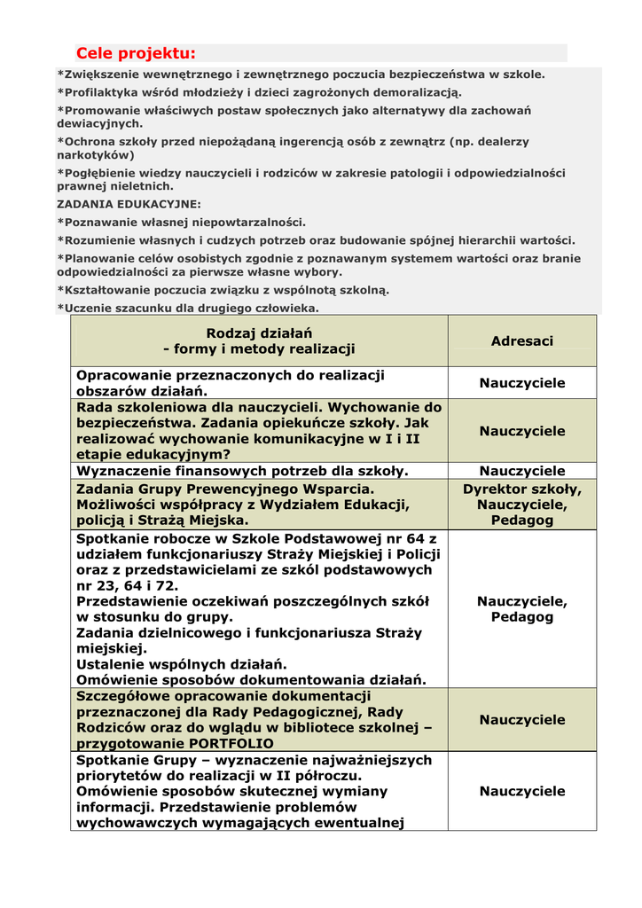 Cele projektu: *Zwiększenie wewnętrznego i zewnętrznego poczucia bezpieczeństwa w szkole. *Profilaktyka wśród młodzieży i dzieci zagrożonych demoralizacją. *Promowanie właściwych postaw społecznych jako alternatywy dla zachowań dewiacyjnych. *Ochrona szkoły przed niepożądaną ingerencją osób z zewnątrz (np. dealerzy narkotyków) *Pogłębienie wiedzy nauczycieli i rodziców w zakresie patologii i odpowiedzialności prawnej nieletnich. ZADANIA EDUKACYJNE: *Poznawanie własnej niepowtarzalności. *Rozumienie własnych i cudzych potrzeb oraz budowanie spójnej hierarchii wartości. *Planowanie celów osobistych zgodnie z poznawanym systemem wartości oraz branie odpowiedzialności za pierwsze własne wybory. *Kształtowanie poczucia związku z wspólnotą szkolną. *Uczenie szacunku dla drugiego człowieka. Rodzaj działań - formy i metody realizacji Opracowanie przeznaczonych do realizacji obszarów działań. Rada szkoleniowa dla nauczycieli. Wychowanie do bezpieczeństwa. Zadania opiekuńcze szkoły. Jak realizować wychowanie komunikacyjne w I i II etapie edukacyjnym? Wyznaczenie finansowych potrzeb dla szkoły. Zadania Grupy Prewencyjnego Wsparcia. Możliwości współpracy z Wydziałem Edukacji, policją i Strażą Miejska. Spotkanie robocze w Szkole Podstawowej nr 64 z udziałem funkcjonariuszy Straży Miejskiej i Policji oraz z przedstawicielami ze szkól podstawowych nr 23, 64 i 72. Przedstawienie oczekiwań poszczególnych szkół w stosunku do grupy. Zadania dzielnicowego i funkcjonariusza Straży miejskiej. Ustalenie wspólnych działań. Omówienie sposobów dokumentowania działań. Szczegółowe opracowanie dokumentacji przeznaczonej dla Rady Pedagogicznej, Rady Rodziców oraz do wglądu w bibliotece szkolnej – przygotowanie PORTFOLIO Spotkanie Grupy – wyznaczenie najważniejszych priorytetów do realizacji w II półroczu. Omówienie sposobów skutecznej wymiany informacji. Przedstawienie problemów wychowawczych wymagających ewentualnej Adresaci Nauczyciele Nauczyciele Nauczyciele Dyrektor szkoły, Nauczyciele, Pedagog Nauczyciele, Pedagog Nauczyciele Nauczyciele interwencji służb mundurowych. Ustalenie sposobu spożytkowania otrzymanych środków finansowych. Omówienie sposobu komunikowania się pomiędzy szkołami należącymi do GPW. Wyznaczenie prelegenta na Warsztaty integracyjne. Spotkanie Grupy – zaproszenie do współpracy przedstawicieli Rady Osiedla „Huby”, wskazanie na potrzebę współpracy z Trenerem Osiedlowym. Prelekcja dla rodziców na temat sekt i cyberprzemocy. Spotkanie z funkcjonariuszem Policji odpowiedzialność cywilno-prawna ucznia. Spotkanie Grupy – przygotowanie materiałów informacyjnych dla ucznia dotyczących bezpiecznych wakacji. Podział obowiązków w czasie organizacji FESTYNU. Warsztaty związane z uzależnieniami i profilaktyką. Udział dzieci w zajęciach edukacjino-sprtowych na terenie Szkoły Podstawowej nr 64 - w ramach współpracy Grup Prewencyjnego Wsparcia. Warsztaty INTEGRACYJNO – EDUKACYJNE dla wrocławskich szkół podstawowych pod hasłem „Bezpieczeństwo moje i moich bliskich” Spotkanie z funkcjonariuszem Policji – bezpieczne wakacje Szkolny FESTYN Nauczyciele Nauczyciele Społeczność lokalna Nauczyciele Rodzice Uczniowie kl. VI Nauczyciele Uczniowie kl. VI Uczniowie Społeczność szkolna i lokalna Uczniowie kl. IV - VI Społeczność szkolna i lokalna