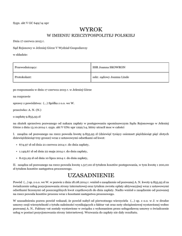 Sygn. akt V GC 649/14 upr WYROK W IMIENIU RZECZYPOSPOLITEJ POLSKIEJ Dnia 17 czerwca 2015 r. Sąd Rejonowy w Jeleniej Górze V Wydział Gospodarczy w składzie: Przewodniczący: SSR Joanna SKOWRON Protokolant: sekr. sądowy Joanna Linde po rozpoznaniu w dniu 17 czerwca 2015 r. w Jeleniej Górze na rozprawie sprawy z powództwa: (...) Spółka z o.o. we W. przeciwko: A. N. (N.) o zapłatę 9.855,93 zł na skutek sprzeciwu pozwanego od nakazu zapłaty w postępowaniu upominawczym Sądu Rejonowego w Jeleniej Górze z dnia 13.10.2014 r. sygn. akt V GNc upr 1292/14, który utracił moc w całości I. zasądza od pozwanego na rzecz powoda kwotę 9.855,93 zł (dziewięć tysięcy osiemset pięćdziesiąt pięć złotych dziewięćdziesiąt trzy grosze) wraz z ustawowymi odsetkami od kwot: • 674,97 zł od dnia 21 czerwca 2014 r. do dnia zapłaty, • 1.149,67 zł od dnia 22 maja 2014 r. do dnia zapłaty, • 8.031,29 zł od dnia 10 lipca 2014 r. do dnia zapłaty, II. zasądza od pozwanego na rzecz powoda kwotę 1.517,00 zł tytułem kosztów postępowania, w tym kwotę 1 200,00 zł tytułem kosztów zastępstwa procesowego. UZASADNIENIE Powód (...) sp. z o.o. we W. w pozwie z dnia 18.08.2014 r. wniósł o zasądzenie od pozwanej A. N. kwoty 9.855,93 zł za świadczenie usług pozycjonowania strony internetowej oraz tytułem zwrotu opłaty aktywacyjnej wraz z ustawowymi odsetkami liczonymi od poszczególnych kwot cząstkowych do dnia zapłaty. Nadto wniósł o zasądzenie od pozwanej na rzecz powoda kosztów procesu wraz z kosztami zastępstwa procesowego. W uzasadnieniu pozwu powód wskazał, że powód nabył od pierwotnego wierzyciela (...) sp. z o.o. w J. w drodze umowy cesji wierzytelność z tytułu należności wynikających z faktur vat oraz noty obciążeniowej wystawionej wobec pozwanej A. N.. Faktury vat zostały wystawione w związku z wykonaniem przez usługodawcę umowy o świadczenie usług w postaci pozycjonowania strony internetowej. Wezwania do zapłaty nie dały rezultatu. Sąd wydał nakaz zapłaty w postępowaniu upominawczym zgodnie z żądaniem pozwu (k. 35). W ustawowym terminie pozwana wniosła sprzeciw (k. 47) od nakazu zapłaty w postępowaniu upominawczym w całości i domagała się oddalenia powództwa w całości i zasądzenia od powoda na jej rzecz zwrotu kosztów procesu według norm przepisanych. Uzasadniając swoje stanowisko pozwana wskazała, że w dniu 07.03.2014 r. zawarła z (...) sp. z o.o. w J. umowę o pozycjonowanie na okres od 14.03.2014 – 13.04.2015 r. było to okres testowy, z możliwością wypowiedzenia umowy w tym okresie bez ponoszenia żadnych opłat. Podniosła, że w terminie dokonała wypowiedzenia umowy, wysyłając w dniu 10.04.2014 r. oświadczenie w tym zakresie listem poleconym. W dniu 14.04.2014 r. listonosz podjął próbę doręczenia i pozostawił awizo. Przesyłka z oświadczeniem została odebrana przez usługodawcę w dniu 16.04.2014 r. o wypowiedzeniu umowy pozwana poinformowała (...) sp. z o.o. również w korespondencji e-mailowej. Wskazała, że skoro ostatni dzień terminu okresu testowego umowy przypadał w niedzielę (13.04.2014 r.), to termin ten na podstawie art. 115 kc przypadał na dzień następny-14.04.2014 r., kiedy to doręczyciel podjął próbę doręczenia. Zdaniem pozwanej termin do wypowiedzenia umowy w okresie testowym został zachowany. Zarzuciła, że usługodawca jeśli świadczył jakieś usługi to czynił to w sposób bezumowny i nie może z tego tytułu domagać się wynagrodzenia. W replice (k. 60) powód zaprzeczył, aby pozwana skutecznie wypowiedziała umowę w okresie testowym, zatem usługodawca kontynuował świadczenie usług, jednak po upływie dwóch okresów rozliczeniowych zachodziły podstawy do wypowiedzenia umowy ze skutkiem natychmiastowym przez usługodawcę i do żądania zwrotu opłaty aktywacyjnej. Powołując się z treść § 7 ust. 7 umowy podał, że dopiero z chwilą doręczenia oświadczenia jest ono skuteczne, skoro zatem doręczenie w odpowiedniej formie nastąpiło w dniu 16.04.2014 r., to oświadczenie pozwanej zostało złożone po okresie testowym i umowa uległa przedłużeniu na czas nieokreślony. W zakresie podstaw żądania opłaty aktywacyjnej powód wskazał, że wynika ona z § 7 ust. 5 umowy i w dniu wypowiedzenia umowy przez cedenta pozwany posiadał zaległości płatnicze wynikające z faktur i przekraczające 30 dni. Sąd ustalił następujący stan faktyczny: Obie strony są przedsiębiorcami, powód jako spółka prawa handlowego, pozwany w oparciu o wpis do ewidencji działalności gospodarczej. /bezsporne, wydruk z CEIDG, wydruk z CI KRS k. 10-12, 16/ Bezsporne było, że pozwana A. N. w dniu 07.03.2014 zawarła z (...) sp. z o.o. w organizacji z siedzibą w J. umowę o świadczenie usług polegających na aktywacji usługi i pozycjonowaniu serwisu www. o oznaczonej domenie w wyszukiwarce google.pl na wyrażenia kluczowe określone w załączniku do umowy. Umowa została zawarta na okres testowy 14.03.2014 r. - 13.04.2014 r. z możliwością jej natychmiastowego wypowiedzenia w okresie testowym bez jakichkolwiek opłat (§ 7 ust. 3). W razie jej niewypowiedzenia w okresie testowym umowa była uznawana przez strony za zawartą na czas nieokreślony z możliwością jej rozwiązania po upływie trzymiesięcznego okresu wypowiedzenia (§ 7 ust. 4). Ponadto strony ustaliły, że oświadczenie o wypowiedzeniu umowy kierowane do drugiej strony uznaje się pod rygorem nieważności za skuteczne wyłącznie jeżeli zostanie sporządzone na piśmie i dostarczone drugiej stronie osobiście, za pośrednictwem Poczty Polskiej (zaleca się list polecony) lub kuriera na aktualny adres drugiej strony zgodnie z wpisem w ewidencji działalności gospodarczej. Oświadczenie o wypowiedzeniu umowy złożone w innej formie (w szczególności za pośrednictwem poczty elektronicznej lub fax) ze względu pewności obrotu prawnego nie wywołują skutków prawnych.(§ 7 ust. 