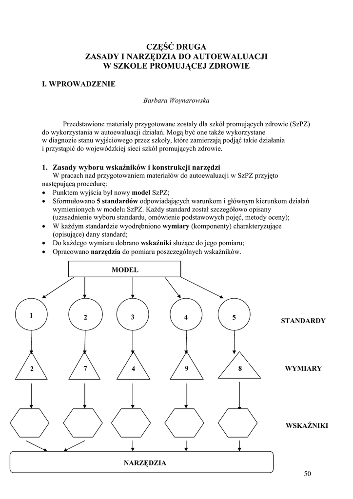 CZĘŚĆ DRUGA ZASADY I NARZĘDZIA DO AUTOEWALUACJI W SZKOLE PROMUJĄCEJ ZDROWIE I. WPROWADZENIE Barbara Woynarowska Przedstawione materiały przygotowane zostały dla szkół promujących zdrowie (SzPZ) do wykorzystania w autoewaluacji działań. Mogą być one takŜe wykorzystane w diagnozie stanu wyjściowego przez szkoły, które zamierzają podjąć takie działania i przystąpić do wojewódzkiej sieci szkół promujących zdrowie. 1. Zasady wyboru wskaźników i konstrukcji narzędzi W pracach nad przygotowaniem materiałów do autoewaluacji w SzPZ przyjęto następującą procedurę: • Punktem wyjścia był nowy model SzPZ; • Sformułowano 5 standardów odpowiadających warunkom i głównym kierunkom działań wymienionych w modelu SzPZ. KaŜdy standard został szczegółowo opisany (uzasadnienie wyboru standardu, omówienie podstawowych pojęć, metody oceny); • W kaŜdym standardzie wyodrębniono wymiary (komponenty) charakteryzujące (opisujące) dany standard; • Do kaŜdego wymiaru dobrano wskaźniki słuŜące do jego pomiaru; • Opracowano narzędzia do pomiaru poszczególnych wskaźników. MODEL 1 2 3 4 2 7 4 9 5 STANDARDY 8 WYMIARY WSKAŹNIKI NARZĘDZIA 50 Ryc. 9. Schemat ilustrujący prace nad opracowaniem wskaźników i narzędzi do ich pomiaru 2. Zasady przeprowadzania autoewaluacji Kiedy naleŜy dokonać autoewaluacji? Decyzję o przeprowadzeniu autoewaluacji podejmuje szkolny koordynator promocji zdrowia w porozumieniu ze szkolnym zespołem ds. promocji zdrowia i dyrekcją szkoły. Wskazane jest, aby przeprowadzać ją co 3 lata, co umoŜliwi śledzenie zmian i postępu w osiąganiu standardów SzPZ (zbliŜaniu się do „optimum”). Najlepszym okresem do przeprowadzenia ewaluacji (w tym wszystkich badań i analiz) są ostatnie miesiące roku szkolnego np. kwiecień i maj. Kto dokonuje autoewaluacji? Termin autoewaluacja oznacza, Ŝe dokonują jej członkowie społeczności szkolnej. Prace związane z ewaluacją organizuje i koordynuje szkolny koordynator promocji zdrowia. NaleŜy powołać szkolny zespół ewaluacyjny, którego członkami powinni być przedstawiciele róŜnych grup społeczności szkolnej, w tym uczniowie. Liczba osób zaleŜy od tego ile standardów będzie przedmiotem badania. WaŜny jest odpowiedni podział zadań i czas na ich wykonanie, aby ludzie nie czuli się przeciąŜeni, a badania wykonane i przeanalizowane rzetelnie. NaleŜy zaprosić do współpracy nauczyciela informatyki, który moŜe pomóc w analizie danych z ankiet oraz graficznej prezentacji wyników. NaleŜy takŜe włączyć uczniów, którzy mogą uczestniczyć w analizie wyników badań ankietowych ich dotyczących. Jak dokonywać autoewaluacji? W kaŜdym standardzie znajduje się instrukcja organizacji i przebiegu całości badań oraz instrukcje dotyczące poszczególnych ich elementów (np. badań ankietowych, zbierania opinii uczniów o edukacji zdrowotnej, wykorzystania techniki „Narysuj i napisz” w badaniu klimatu społecznego klasy itd.). Procedura badań ewaluacyjnych w poszczególnych standardach róŜni się: • • • W standardach 1, 2 i 3 są dwie fazy pracy: − Badania ankietowe róŜnych grup społeczności szkolnej i analiza ich wyników, stanowiących podstawę do wypełnienia arkuszy zbiorczych. W przypadku uwzględnienia w ewaluacji wszystkich standardów pytania zawarte w kwestionariuszach moŜna połączyć tworząc jedną ankietę (oszczędność czasu i papieru); − Wypełnianie arkuszy zbiorczych (poziomych), dokonywanie oceny punktowej dla kaŜdego wskaźnika (stwierdzenia) uzasadnienie oceny oraz określenie, co naleŜy poprawić. Standard 4 obejmuje dwie grupy metod: − Badanie klimatu społecznego klasy – technika „Narysuj i napisz” w klasach III i wypracowanie w klasach V szkoły podstawowej; − Badania ankietowe uczniów (klasa VI szkoły podstawowej oraz klasy II gimnazjum i szkół ponadgimnazjalnych), nauczycieli, innych pracowników szkoły. W standardzie tym nie ma arkuszy zbiorczych (poziomych). W standardzie 5 są dwie fazy pracy − Sprawdzenie stanu poszczególnych elementów środowiska fizycznego szkoły (obserwacja, wizja lokalna, analiza protokołów pokontrolnych itd.) przez członków 51 zespołu ewaluacyjnego (dane te stanowią podstawę do wypełnienia arkuszy zbiorczych); − Wypełnianie arkuszy zbiorczych (poziomych), dokonywanie oceny punktowej dla kaŜdego wskaźnika (stwierdzenia) uzasadnienie oceny oraz określenie, co naleŜy poprawić. Po zakończeniu oceny naleŜy wypełnić raport z ewaluacji dla kaŜdego standardu. Ocena punktowa moŜe być podana w liczbach lub przedstawiona, jako „profil” dla kaŜdego standardu, graficznie na wykresach. Ich przykłady podano w tekście, ale moŜna wykorzystać inne formy prezentacji graficznej posługując się np. programem Excel. Wyniki ewaluacji naleŜy upowszechnić i przedyskutować w społeczności szkolnej. Stanowić powinny one podstawę do planowania dalszych działań. Inne uwagi praktyczne • NaleŜy unikać zawyŜania ocen punktowych. Autoewaluacja słuŜy społeczności szkolnej i warto jest dokonać oceny obiektywnej („spojrzeć prawdzie w oczy”). • W przypadku, gdy w autoewaluacji uwzględnia się wszystkie standardy naleŜy zestawić dane liczbowe i profile graficzne wszystkich standardów, co daje pełniejszy obraz sytuacji i pokazuje, jakie są mocne i słabe strony, jakie działania naleŜy podjąć. • NaleŜy zachować dokumentację tzn. wypełnione raporty z ewaluacji, arkusze zbiorcze (poziome), wzory ankiet, przykłady prac plastycznych uczniów, wypracowań. NaleŜy takŜe odnotować: jakie były zasady doboru oraz liczba poszczególnych grup osób uczestniczących w badaniach ankietowych oraz ewentualne odstępstwa od instrukcji badania. Dane te mogą być przydatne przy dokonywaniu następnej autoewaluacji. Wyniki są porównywalne tylko wówczas, gdy stosuje się podobne narzędzia i procedurę badania. 52 STANDARD PIE