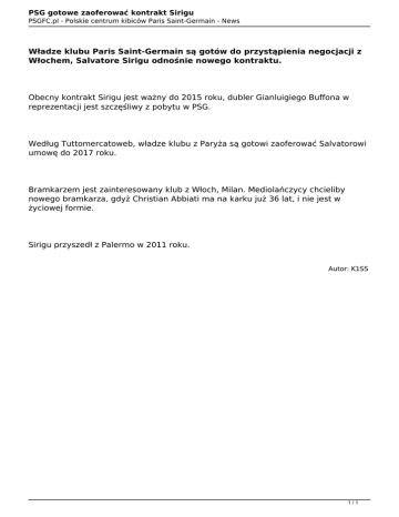PSG gotowe zaoferować kontrakt Sirigu PSGFC.pl - Polskie centrum kibiców Paris Saint-Germain - News Władze klubu Paris Saint-Germain są gotów do przystąpienia negocjacji z Włochem, Salvatore Sirigu odnośnie nowego kontraktu. Obecny kontrakt Sirigu jest ważny do 2015 roku, dubler Gianluigiego Buffona w reprezentacji jest szczęśliwy z pobytu w PSG. Według Tuttomercatoweb, władze klubu z Paryża są gotowi zaoferować Salvatorowi umowę do 2017 roku. Bramkarzem jest zainteresowany klub z Włoch, Milan. Mediolańczycy chcieliby nowego bramkarza, gdyż Christian Abbiati ma na karku już 36 lat, i nie jest w życiowej formie. Sirigu przyszedł z Palermo w 2011 roku. Autor: K1SS 1/1 Powered by TCPDF (www.tcpdf.org)