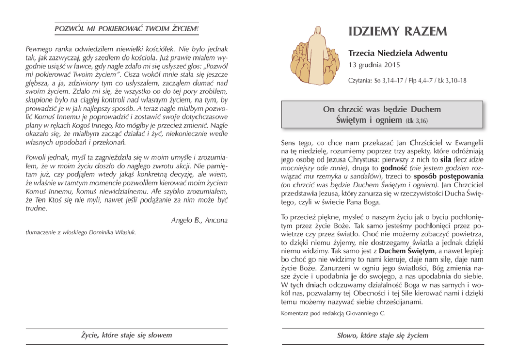POZWÓL MI POKIEROWAĆ TWOIM ŻYCIEM! Idziemy razem Pewnego ranka odwiedziłem niewielki kościółek. Nie było jednak tak, jak zazwyczaj, gdy szedłem do kościoła. Już prawie miałem wygodnie usiąść w ławce, gdy nagle zdało mi się usłyszeć głos: „Pozwól mi pokierować Twoim życiem”. Cisza wokół mnie stała się jeszcze głębsza, a ja, zdziwiony tym co usłyszałem, zacząłem dumać nad swoim życiem. Zdało mi się, że wszystko co do tej pory zrobiłem, skupione było na ciągłej kontroli nad własnym życiem, na tym, by prowadzić je w jak najlepszy sposób. A teraz nagle miałbym pozwolić Komuś Innemu je poprowadzić i zostawić swoje dotychczasowe plany w rękach Kogoś Innego, kto mógłby je przecież zmienić. Nagle okazało się, że miałbym zacząć działać i żyć, niekoniecznie wedle własnych upodobań i przekonań. Trzecia Niedziela Adwentu Powoli jednak, myśl ta zagnieździła się w moim umyśle i zrozumiałem, że w moim życiu doszło do nagłego zwrotu akcji. Nie pamiętam już, czy podjąłem wtedy jakąś konkretną decyzję, ale wiem, że właśnie w tamtym momencie pozwoliłem kierować moim życiem Komuś Innemu, komuś niewidzialnemu. Ale szybko zrozumiałem, że Ten Ktoś się nie myli, nawet jeśli podążanie za nim może być trudne. Angelo B., Ancona tłumaczenie z włoskiego Dominika Własiuk. 13 grudnia 2015 Czytania: So 3,14–17 / Flp 4,4–7 / Łk 3,10–18 On chrzcić was będzie Duchem Świętym i ogniem (Łk 3,16) Sens tego, co chce nam przekazać Jan Chrzściciel w Ewangelii na tę niedzielę, rozumiemy poprzez trzy aspekty, które odróżniają jego osobę od Jezusa Chrystusa: pierwszy z nich to siła (lecz idzie mocniejszy ode mnie), druga to godność (nie jestem godzien rozwiązać mu rzemyka u sandałów), trzeci to sposób postępowania (on chrzcić was będzie Duchem Świętym i ogniem). Jan Chrzciciel przedstawia Jezusa, który zanurza się w rzeczywistości Ducha Świętego, czyli w świecie Pana Boga. To przecież piękne, mysleć o naszym życiu jak o byciu pochłoniętym przez życie Boże. Tak samo jesteśmy pochłonięci przez powietrze czy przez światło. Choć nie możemy zobaczyć powietrza, to dzięki niemu żyjemy, nie dostrzegamy światła a jednak dzięki niemu widzimy. Tak samo jest z Duchem Świętym, a nawet lepiej: bo choć go nie widzimy to nami kieruje, daje nam siłę, daje nam życie Boże. Zanurzeni w ogniu jego światłości, Bóg zmienia nasze życie i upodabnia je do swojego, a nas upodabnia do siebie. W tych dniach odczuwamy działalność Boga w nas samych i wokół nas, pozwalamy tej Obecności i tej Sile kierować nami i dzięki temu możemy nazywać siebie chrześcijanami. Komentarz pod redakcją Giovanniego C. Życie, które staje się słowem Słowo, które staje się życiem