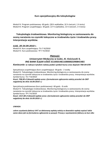Kurs specjalizacyjny dla toksykologów Moduł IV. Program podstawowy- 60 godz. (28 h wykładów, 32 h ćwiczeń, 1 h testu) Moduł III. Program uzupełniający- 30 godz. (17 h wykładów, 13 h ćwiczeń, 1 h testu) Toksykologia środowiskowa. Monitoring biologiczny w zastosowaniu do oceny narażenia na czynniki toksyczne w środowisku życia i środowisku pracy. Interpretacja wyników. Łódź, 20-24.09.2010 r. Moduł III. Kurs uzupełniający- TU-7 III/2010 Moduł IV. Kurs podstawowy- TP-7 IV/2010 Płatnośd: Uniwersytet Medyczny w Łodzi, Al. Kościuszki 4, ING BANK ŚLĄSKI ŁÓDŹ 31105014611000002290841481 Koniecznie: w rubryce tytułem należy podad symbol kursu oraz dopisek 708-04-078 Specjalizacja uzupełniająca (kurs uzupełniający)- 30 godz.- 2 osoby Moduł III. Toksykologia środowiskowa. Monitoring biologiczny w zastosowaniu do oceny narażenia na czynniki toksyczne w środowisku życia i środowisku pracy. Interpretacja wyników. Symbol kursu: TU-7 III/2010 Koszt: 708,90 zł (dowód wpłaty wraz z formularzem zgłoszenia należy przesład do OKP najpóźniej do dnia 16.09.2010 r.) Specjalizacja podstawowa (kurs podstawowy)- 60 godz.- 8 osób Moduł IV. Toksykologia środowiskowa. Monitoring biologiczny w zastosowaniu do oceny narażenia na czynniki toksyczne w środowisku życia i środowisku pracy. Interpretacja wyników. Symbol kursu: TP-7 IV/2010 Koszt: 1417,80 zł (dowód wpłaty wraz z formularzem zgłoszenia należy przesład do OKP najpóźniej do dnia 16.09.2010 r.) UWAGA: celem uzyskania faktury VAT za dokonaną wpłatę należy w dowodzie wpłaty wpisad takie same dane jak na formularzu zgłoszenia w pozycji: Proszę o wystawienie faktury za kurs dla: