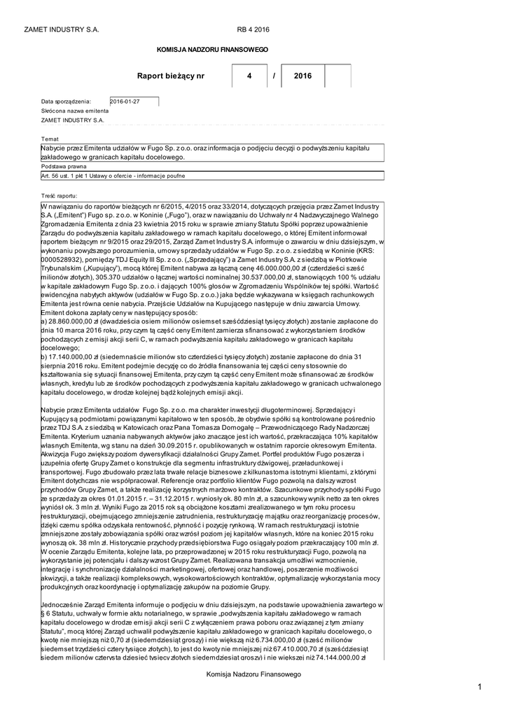 ZAMET INDUSTRY S.A. RB 4 2016 KOMISJA NADZORU FINANSOWEGO Raport bieżący nr Data sporządzenia: 4 / 2016 2016-01-27 Skróc ona nazwa emitenta ZAMET INDUSTRY S.A. Temat Nabycie przez Emitenta udziałów w Fugo Sp. z o.o. oraz informacja o podjęciu decyzji o podwyższeniu kapitału zakładowego w granicach kapitału docelowego. Podstawa prawna Art. 56 ust. 1 pkt 1 Ustawy o oferc ie - informac je poufne Treść raportu: W nawiązaniu do raportów bieżących nr 6/2015, 4/2015 oraz 33/2014, dotyczących przejęcia przez Zamet Industry S.A. („Emitent”) Fugo sp. z o.o. w Koninie („Fugo”), oraz w nawiązaniu do Uchwały nr 4 Nadzwyczajnego Walnego Zgromadzenia Emitenta z dnia 23 kwietnia 2015 roku w sprawie zmiany Statutu Spółki poprzez upoważnienie Zarządu do podwyższenia kapitału zakładowego w ramach kapitału docelowego, o której Emitent informował raportem bieżącym nr 9/2015 oraz 29/2015, Zarząd Zamet Industry S.A. informuje o zawarciu w dniu dzisiejszym, w wykonaniu powyższego porozumienia, umowy sprzedaży udziałów w Fugo Sp. z o.o. z siedzibą w Koninie (KRS: 0000528932), pomiędzy TDJ Equity III Sp. z o.o. („Sprzedający”) a Zamet Industry S.A. z siedzibą w Piotrkowie Trybunalskim („Kupujący”), mocą której Emitent nabywa za łączną cenę 46.000.000,00 zł (czterdzieści sześć milionów złotych), 305.370 udziałów o łącznej wartości nominalnej 30.537.000,00 zł, stanowiących 100 % udziału w kapitale zakładowym Fugo Sp. z o.o. i dających 100% głosów w Zgromadzeniu Wspólników tej spółki. Wartość ewidencyjna nabytych aktywów (udziałów w Fugo Sp. z o.o.) jaka będzie wykazywana w księgach rachunkowych Emitenta jest równa cenie nabycia. Przejście Udziałów na Kupującego następuje w dniu zawarcia Umowy. Emitent dokona zapłaty ceny w następujący sposób: a) 28.860.000,00 zł (dwadzieścia osiem milionów osiemset sześćdziesiąt tysięcy złotych) zostanie zapłacone do dnia 10 marca 2016 roku, przy czym tą część ceny Emitent zamierza sfinansować z wykorzystaniem środków pochodzących z emisji akcji serii C, w ramach podwyższenia kapitału zakładowego w granicach kapitału docelowego; b) 17.140.000,00 zł (siedemnaście milionów sto czterdzieści tysięcy złotych) zostanie zapłacone do dnia 31 sierpnia 2016 roku. Emitent podejmie decyzję co do źródła finansowania tej części ceny stosownie do kształtowania się sytuacji finansowej Emitenta, przy czym tą część ceny Emitent może sfinansować ze środków własnych, kredytu lub ze środków pochodzących z podwyższenia kapitału zakładowego w granicach uchwalonego kapitału docelowego, w drodze kolejnej bądź kolejnych emisji akcji. Nabycie przez Emitenta udziałów Fugo Sp. z o.o. ma charakter inwestycji długoterminowej. Sprzedający i Kupujący są podmiotami powiązanymi kapitałowo w ten sposób, że obydwie spółki są kontrolowane pośrednio przez TDJ S.A. z siedzibą w Katowicach oraz Pana Tomasza Domogałę – Przewodniczącego Rady Nadzorczej Emitenta. Kryterium uznania nabywanych aktywów jako znaczące jest ich wartość, przekraczająca 10% kapitałów własnych Emitenta, wg stanu na dzień 30.09.2015 r. opublikowanych w ostatnim raporcie okresowym Emitenta. Akwizycja Fugo zwiększy poziom dywersyfikacji działalności Grupy Zamet. Portfel produktów Fugo poszerza i uzupełnia ofertę Grupy Zamet o konstrukcje dla segmentu infrastruktury dźwigowej, przeładunkowej i transportowej. Fugo zbudowało przez lata trwałe relacje biznesowe z kilkunastoma istotnymi klientami, z którymi Emitent dotychczas nie współpracował. Referencje oraz portfolio klientów Fugo pozwolą na dalszy wzrost przychodów Grupy Zamet, a także realizację korzystnych marżowo kontraktów. Szacunkowe przychody spółki Fugo ze sprzedaży za okres 01.01.2015 r. – 31.12.2015 r. wyniosły ok. 80 mln zł, a szacunkowy wynik netto za ten okres wyniósł ok. 3 mln zł. Wyniki Fugo za 2015 rok są obciążone kosztami zrealizowanego w tym roku procesu restrukturyzacji, obejmującego zmniejszenie zatrudnienia, restrukturyzację majątku oraz reorganizację procesów, dzięki czemu spółka odzyskała rentowność, płynność i pozycję rynkową. W ramach restrukturyzacji istotnie zmniejszone zostały zobowiązania spółki oraz wzrósł poziom jej kapitałów własnych, które na koniec 2015 roku wynoszą ok. 38 mln zł. Historycznie przychody przedsiębiorstwa Fugo osiągały poziom przekraczający 100 mln zł. W ocenie Zarządu Emitenta, kolejne lata, po przeprowadzonej w 2015 roku restrukturyzacji Fugo, pozwolą na wykorzystanie jej potencjału i dalszy wzrost Grupy Zamet. Realizowana transakcja umożliwi wzmocnienie, integrację i synchronizację działalności marketingowej, ofertowej oraz handlowej, poszerzenie możliwości akwizycji, a także realizacji kompleksowych, wysokowartościowych kontraktów, optymalizację wykorzystania mocy produkcyjnych oraz koordynację i optymalizację zakupów na poziomie Grupy. Jednocześnie Zarząd Emitenta informuje o podjęciu w dniu dzisiejszym, na podstawie upoważnienia zawartego w § 6 Statutu, uchwały w formie aktu notarialnego, w sprawie „podwyższenia kapitału zakładowego w ramach kapitału docelowego w drodze emisji akcji serii C z wyłączeniem prawa poboru oraz związanej z tym zmiany Statutu”, mocą której Zarząd uchwalił podwyższenie kapitału zakładowego w granicach kapitału docelowego, o kwotę nie mniejszą niż 0,70 zł (siedemdziesiąt groszy) i nie większą niż 6.734.000,00 zł (sześć milionów siedemset trzydzieści cztery tysiące złotych), to jest do kwoty nie mniejszej niż 67.410.000,70 zł (sześćdziesiąt siedem milionów czterysta dziesięć tysięcy złotych siedemdziesiąt groszy) i nie większej niż 74.144.000,00 zł Komisja Nadzoru Finansowego 1 ZAMET INDUSTRY S.A. RB 4 2016 siedem milionów czterysta dziesięć tysięcy złotych siedemdziesiąt groszy) i nie większej niż 7