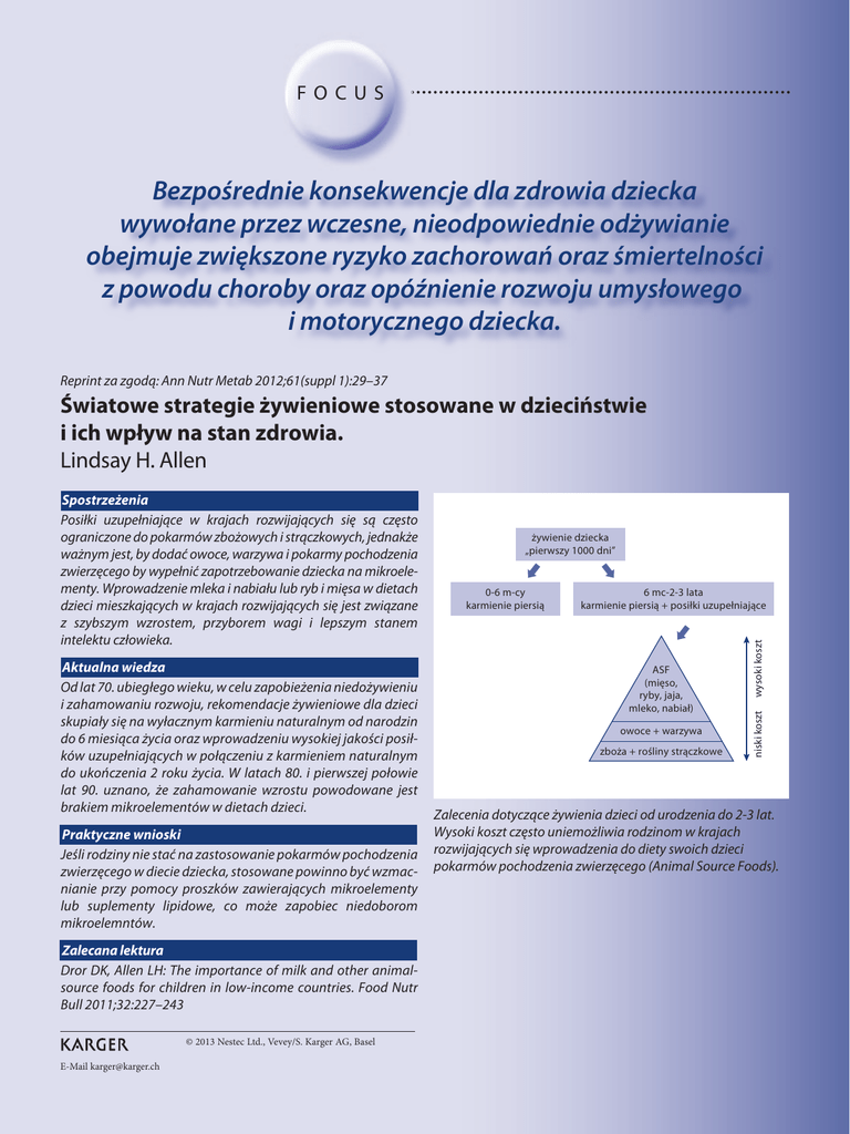 FOCUS Bezpośrednie konsekwencje dla zdrowia dziecka wywołane przez wczesne, nieodpowiednie odżywianie obejmuje zwiększone ryzyko zachorowań oraz śmiertelności z powodu choroby oraz opóźnienie rozwoju umysłowego i motorycznego dziecka. Reprint za zgodą: Ann Nutr Metab 2012;61(suppl 1):29–37 Światowe strategie żywieniowe stosowane w dzieciństwie i ich wpływ na stan zdrowia. Lindsay H. Allen Praktyczne wnioski Jeśli rodziny nie stać na zastosowanie pokarmów pochodzenia zwierzęcego w diecie dziecka, stosowane powinno być wzmacnianie przy pomocy proszków zawierających mikroelementy lub suplementy lipidowe, co może zapobiec niedoborom mikroelemntów. Zalecana lektura Dror DK, Allen LH: The importance of milk and other animalsource foods for children in low-income countries. Food Nutr Bull 2011;32:227–243 © 2013 Nestec Ltd., Vevey/S. Karger AG, Basel E-Mail [email protected] 0-6 m-cy karmienie piersią 6 mc-2-3 lata karmienie piersią + posiłki uzupełniające ASF (mięso, ryby, jaja, mleko, nabiał) owoce + warzywa zboża + rośliny strączkowe wysoki koszt Aktualna wiedza Od lat 70. ubiegłego wieku, w celu zapobieżenia niedożywieniu i zahamowaniu rozwoju, rekomendacje żywieniowe dla dzieci skupiały się na wyłacznym karmieniu naturalnym od narodzin do 6 miesiąca życia oraz wprowadzeniu wysokiej jakości posiłków uzupełniających w połączeniu z karmieniem naturalnym do ukończenia 2 roku życia. W latach 80. i pierwszej połowie lat 90. uznano, że zahamowanie wzrostu powodowane jest brakiem mikroelementów w dietach dzieci. żywienie dziecka „pierwszy 1000 dni” niski koszt Spostrzeżenia Posiłki uzupełniające w krajach rozwijających się są często ograniczone do pokarmów zbożowych i strączkowych, jednakże ważnym jest, by dodać owoce, warzywa i pokarmy pochodzenia zwierzęcego by wypełnić zapotrzebowanie dziecka na mikroelementy. Wprowadzenie mleka i nabiału lub ryb i mięsa w dietach dzieci mieszkających w krajach rozwijających się jest związane z szybszym wzrostem, przyborem wagi i lepszym stanem intelektu człowieka. Zalecenia dotyczące żywienia dzieci od urodzenia do 2-3 lat. Wysoki koszt często uniemożliwia rodzinom w krajach rozwijających się wprowadzenia do diety swoich dzieci pokarmów pochodzenia zwierzęcego (Animal Source Foods).
