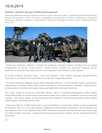 10.III.2014 Premier i minister obrony w NDR w Siemirowicach "NATO jest najbezpieczniejszym sojuszem w historii, w jakim uczestniczy Polska" - powiedział w poniedziałek premier Donald Tusk, goszcząc z okazji 15. rocznicy przystąpienia naszego kraju do NATO w Nadbrzeżnym Dywizjonie Rakietowym Marynarki Wojennej w Siemirowicach. Premierowi towarzyszył minister obrony narodowej Tomasz Siemoniak. - Polska jest rzetelnym, solidnym i zdolnym do poświęceń członkiem Sojuszu. Jesteśmy też coraz lepiej przygotowani do obrony naszych granic - dodał premier. Donald Tusk zaznaczył, odnosząc się do wydarzeń za naszą wschodnią granicą, że nie ma zagrożenia dla Polaków i polskich granic. W ocenie premiera Donalda Tuska - NATO jest jednym z kilku filarów polskiego bezpieczeństwa; pozostałe to nasi żołnierze, ich wyszkolenie i sprzęt jakim mogą dysponować. - Kluczowe znaczenie odgrywa dzisiaj jakość polskiego żołnierza - to jest żołnierz dobrze wyszkolony i wykształcony. Chciałbym oddać ukłon polskim żołnierzom – ich determinacji i odwadze - mówił premier podczas wizyty w Siemirowicach, gdzie stacjonuje Nadbrzeżny Dywizjon Rakietowy. Szef rządu dodał, że ponad sto miliardów złotych, jakie w 10-letniej perspektywie polskie władze postanowiły wydać na modernizację wyposażenia naszej armii stają się szczególnie istotne w obecnych czasach. - Tym, którzy pytają, czy nie szkoda pieniędzy mówię, że nasze bezpieczeństwo zawsze będzie najważniejsze - podkreślił premier Tusk. - Polska jest liderem w NATO jeśli chodzi o wzrost wydatków na obronność. Wojsko zawsze jest gotowe do działania. Nie ma w tej chwili żadnych odstępstw od planowanych aktywności. Nie obudziliśmy się dwa tygodnie temu, że są zagrożenia dla Polski. Od dawna pracujemy nad zdolnościami obronnymi, stąd ten wielki wysiłek finansowy - podkreśił towarzyszący premierowi minister obrony narodowej Tomasz Siemoniak. *** Strona 1 Nadbrzeżny Dywizjon Rakietowy Marynarki Wojennej rozpoczął formalne funkcjonowanie 1 stycznia 2011 roku. W połowie 2013 roku, po zakończeniu testów poligonowych, osiągnął gotowość techniczną do działań. Do czasu osiągnięcia przez dywizjon pełnej gotowości do działania realizowany jest proces szkolenia oraz dostawy kolejnych rakiet NSM. Miejscem stałej dyslokacji dywizjonu są Siemirowice, jednak jego podstawową cechą ma być wysoka mobilność, a co za tym idzie będzie posiadał zdolność operowania wzdłuż całego polskiego wybrzeża. Ze względu na duże możliwości operacyjne związane z wysoką mobilnością i siłą ognia Nadbrzeżny Dywizjon Rakietowy będzie odgrywał znaczącą rolę w zapewnieniu swobody pływania polskim siłom okrętowym na Morzu Bałtyckim. Do zasadniczych zadań, które będzie mógł realizować należy zaliczyć przede wszystkim osłonę głównych baz morskich oraz punków manewrowego bazowania Marynarki Wojennej przed uderzeniami nawodnych sił okrętowych przeciwnika. Obrona przeciwokrętowa będzie również realizowana w odniesieniu do ważnych obiektów wojskowych i przemysłowych rozmieszczonych na naszym wybrzeżu. Jako jednostka typowo defensywna dywizjon będzie dodatkowo zapewniał osłonę i wsparcie własnych sił okrętowych prowadzących działania w strefie przybrzeżnej. Zadanie to dotyczy przede wszystkim rejonów załadowania, formowania i przejścia jednostek nawodnych. Nadbrzeżny Dywizjon Rakietowy będzie także zabezpieczał przybrzeżne morskie szlaki komunikacyjne. Będzie ponadto odpowiadał za osłonę od strony morza skrzydła obrony Wojsk Lądowych przed uderzeniami nawodnych sił okrętowych przeciwnika. Jedną z najważniejszych funkcji jednostki będzie udział w obronie przeciwdesantowej wybrzeża polskiego. Galeria ... Strona 2