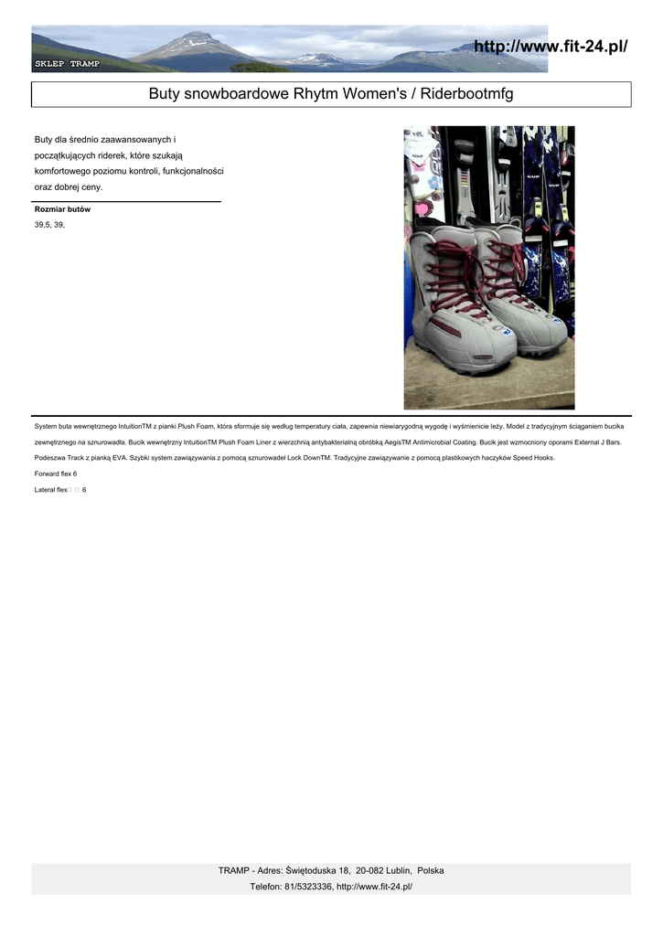 http://www.fit-24.pl/ Buty snowboardowe Rhytm Women's / Riderbootmfg Buty dla średnio zaawansowanych i początkujących riderek, które szukają komfortowego poziomu kontroli, funkcjonalności oraz dobrej ceny. Rozmiar butów 39,5, 39, System buta wewnętrznego IntuitionTM z pianki Plush Foam, która sformuje się według temperatury ciała, zapewnia niewiarygodną wygodę i wyśmienicie leży. Model z tradycyjnym ściąganiem bucika zewnętrznego na sznurowadła. Bucik wewnętrzny IntuitionTM Plush Foam Liner z wierzchnią antybakterialną obróbką AegisTM Antimicrobial Coating. Bucik jest wzmocniony oporami External J Bars. Podeszwa Track z pianką EVA. Szybki system zawiązywania z pomocą sznurowadeł Lock DownTM. Tradycyjne zawiązywanie z pomocą plastikowych haczyków Speed Hooks. Forward flex 6 Lateral flex 6 TRAMP - Adres: Świętoduska 18, 20-082 Lublin, Polska Telefon: 81/5323336, http://www.fit-24.pl/ http://www.fit-24.pl/ TRAMP - Adres: Świętoduska 18, 20-082 Lublin, Polska Telefon: 81/5323336, http://www.fit-24.pl/