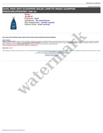 Informacje o produkcie Utworzono 08-03-2017 GUHL MAN ANTI-SCHUPPEN WILDE LIMETTE MĘSKI SZAMPON PRZECIWŁUPIEŻOWY 200 ml. Cena : 26,00 zł Producent : Guhl Dostępność : Na zamówienie Stan magazynowy : bardzo wysoki Średnia ocena : brak recenzji er m ar k GUHL MAN ANTI-SCHUPPEN WILDE LIMETTE DZIKA LIMETKA MĘSKI SZAMPON PRZECIWŁUPIEŻOWY Opis produktu: Marka szamponów Guhl to siła naturalnych składników. Wyjątkowe rozwiązania w pielęgnacji włosów, specjalnie dostosowane do każdego rodzaju włosów. Szeroki asortyment, innowacyjne produkty doskonała jakość od wielu lat. Guhl nowy męski szampon przeciwłupieżowy z dzikiej limetki i kompleksem Hydra Pyrox z cynkiem uwalnia od łupieżu, reguluje równowagę mikroflory na skórze głowy, zapobiega ponownemu powstawaniu łupieżu, jednoczenie wzmacnia włosy, nadaje im energii i świeżości. Produkt oryginalny niemiecki jest nowy i fabrycznie zapakowany Pojemność: 200 ml w at JEŚLI ZNAJDUJĄ SIĘ PAŃSTWO NA NASZYM SKLEPIE, A W OFERCIE BRAKUJE PRODUKTU KTÓREGO POSZUKUJECIE LUB JEST GO ZA MAŁO TO SERDECZNIE PROSIMY O INFORMACJE, PONIEWAŻ NASZ ASORTYMENT JEST O WIELE WIĘKSZY Z MOŻLIWOŚCIĄ ZAMÓWIENIA GO NA ŻYCZENIE. NA PEWNO COŚ PORADZIMY, GDYŻ KLIENT JEST DLA NAS NAJWAŻNIEJSZY. CZEKAMY NA WASZE MAILE: [email protected] Wygenerowano w programie www.oscGold.com