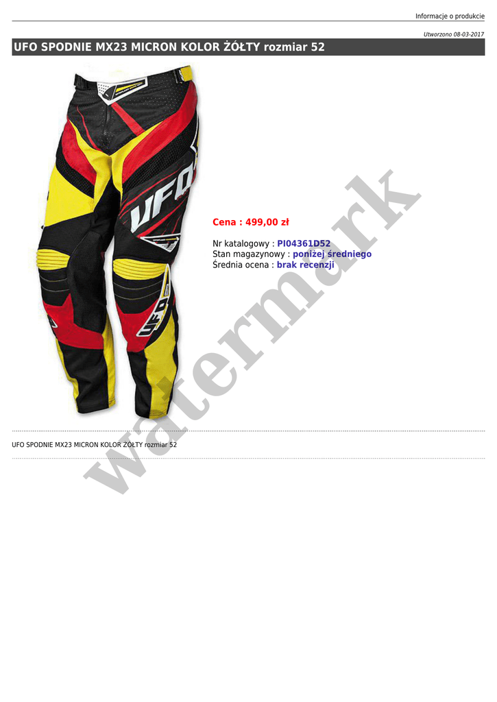 Informacje o produkcie Utworzono 08-03-2017 er m ar k UFO SPODNIE MX23 MICRON KOLOR ŻÓŁTY rozmiar 52 Cena : 499,00 zł at Nr katalogowy : PI04361D52 Stan magazynowy : poniżej średniego Średnia ocena : brak recenzji w UFO SPODNIE MX23 MICRON KOLOR ŻÓŁTY rozmiar 52