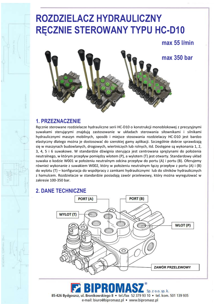 ROZDZIELACZ HYDRAULICZNY RĘCZNIE STEROWANY TYPU HC-D10 max 55 l/min max 350 bar 1. PRZEZNACZENIE Ręcznie sterowane rozdzielacze hydrauliczne serii HC-D10 o konstrukcji monoblokowej z precyzyjnymi suwakami sterującymi znajdują zastosowanie w układach sterowania siłownikami i silnikami hydraulicznymi maszyn mobilnych, sposób i miejsce stosowania rozdzielaczy HC-D10 jest bardzo elastyczny dlatego można je dostosować do szerokiej gamy aplikacji. Szczególnie dobrze sprawdzają się w maszynach budowlanych, drogowych, wiertniczych lub rolnych, itd. Dostępne są wykonania 1, 2, 3, 4, 5 i 6 suwakowe. W standardzie dźwignia sterująca jest centrowana sprężynami do położenia neutralnego, w którym przepływ pomiędzy wlotem (P), a wylotem (T) jest otwarty. Standardowy układ suwaka o kodzie W001 w położeniu neutralnym odcina przepływ do portu (A) i portu (B). Oferujemy również wykonanie z suwakiem W002, który w położeniu neutralnym łączy przepływ z portu (A) i (B) do wylotu (T) – konfiguracja do współpracy z zamkami hydraulicznymi lub do silników hydraulicznych z hamulcem. Rozdzielacze w standardzie posiadają zawór przelewowy, który można wyregulować w zakresie 100-350 bar. 2. DANE TECHNICZNE ZAWÓR PRZELEWOWY Max przepływ: 55 l/min Max ciśnienie na portach P, A, B, HPCO: 350 bar Max ciśnienie na porcie T: 20 bar Ilość suwaków: 1 - 2 - 3 – 4 - 5 - 6 Masa rozdzielacza [kg]: 1/2,90 – 2/4,30 – 3/5,50 – 4/6,70 – 5/7,90 – 6/9,10 Porty przyłączeniowe G3/8 wg ISO 228 Ciecz robocza: olej hydrauliczny o lepkości 10-460 cSt Klasa czystości oleju: 19/16 wg ISO 4406 Przesuw suwaka: 5 mm do przodu - 5 mm do tyłu Rozstaw między suwakami: 35 mm 3. WYMIARY 4. TYPY SUWAKÓW W001 – 3 pozycyjny podwójnego działania, porty A i B odcięte w położeniu neutralnym W002 – 3 pozycyjny podwójnego działania, porty A i B połączone do wylotu T w położeniu neutralnym W012 – 4 pozycyjny podwójnego działania z czteroma położeniami pływającymi 5. SCHEMATY ROZDZIELACZA (na przykładzie rozdzielacza 3 sekcyjnego) - standard ZAWÓR PRZELEWOWY - z wyjściem wysokociśnieniowym HPCO do szeregowego podłączenia kolejnego rozdzielacza 6. STEROWANIE Sterowanie ręczne - dźwigniowe Możliwość ustawienia dźwigni sterującej w różnych płaszczyznach: H001 – dźwignia z ochroną, H001 – dźwignia z ochroną obrócona o 180o Standardowa dźwigania ZA-M8-210 (L=210 mm) Sterowanie ręczne – cięgnowe H128 – adapter do sterowania linką H148 – zestaw do sterowania linką CF – linki pchająco-ciągnące długości L=1000÷5000 mm (co 250 mm) oznaczenie: np. dla długości L=2500mm – CF 2500 Joystick – pozwala na sterowanie cięgnowe (za pomocą linki) dwoma sekcjami rozdzielacza. Wybór tylnej kopułki do sterowania dźwigniowego: F001 - z mechanizmem centrującym do neutralnego położenia za pomocą sprężyn (standard) F002 – z mechanizmem centrującym do neutralnego położenia za pomocą sprężyn i z zatrzaskami w skrajnych położeniach F005 – z mechanizmem centrującym do neutralnego położenia za pomocą sprężyn i z zatrzaskiem w położeniu 4 (tylko dla suwaka W012) F020 –sterowanie pneumatyczne ON-OF Sterowanie elektromagnetyczne Ograniczenia wydajności w stosunku do przyrostu ciśnienia H036 - sterowanie elektryczne 12Vdc (45W-3,75 A) H037 - sterowanie elektryczne 24Vdc (45W-1,88 A) Sterowanie elektrohydrauliczne ON-OFF F0600 – sterowanie elektrohydrauliczne ON-OF 12Vdc F0610 – sterowanie elektrohydrauliczne ON-OF 24Vdc Sterowanie elektrohydrauliczne proporcjonalne F1600 – sterowanie elektrohydrauliczne proporcjonalne 12Vdc F1610 – sterowanie elektrohydrauliczne proporcjonalne 24Vdc CVPH-4-NM – elektryczny sterownik proporcjonalny (link) TOC02 – elektryczny sterownik proporcjonalny (link) 7. OZNACZENIE Przykład HC-D10/3-W001.F001-W001.F002-W002.F001-HPCO 1 sekcja: suwak W001, sterowanie F001 2 sekcja: suwak W001, sterowanie F002 3 sekcja: suwak W002, sterowanie F001 z wyjściem wysokociśnieniowym HPCO - dźwignie należy zamawiać oddzielnie Np. Dźwignia ZA-M8-210 – szt. 3