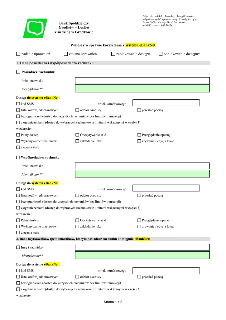 Załącznik nr 4.4 do „Instrukcji obsługi klientów indywidualnych” wprowadzonej Uchwałą Zarządu Banku Spółdzielczego Grodków Łosiów nr 96/12 z dnia 13.09.2012r. Bank Spółdzielczy Grodków – Łosiów z siedzibą w Grodkowie Wniosek w sprawie korzystania z systemu eBankNet nadanie uprawnień zmiana uprawnień zablokowanie dostępu odblokowanie dostępu* 1. Dane posiadacza i współposiadacza rachunku Posiadacz rachunku: Imię i nazwisko Identyfikator** Dostęp do systemu eBankNet: kod SMS lista kodów jednorazowych nr tel. komórkowego odbiór osobisty przesłać pocztą bez ograniczeń (dostęp do wszystkich rachunków bez limitów transakcji) z ograniczeniami (dostęp do wybranych rachunków z limitami wskazanymi w części 3) w zakresie: Pełny dostęp Odczytywanie sald Przeglądanie operacji Wykonywanie przelewów zakładanie lokat zrywanie / edycja lokat zlecenia stałe Współposiadacz rachunku: Imię i nazwisko Identyfikator** Dostęp do systemu eBankNet: kod SMS lista kodów jednorazowych nr tel. komórkowego odbiór osobisty przesłać pocztą bez ograniczeń (dostęp do wszystkich rachunków bez limitów transakcji) z ograniczeniami (dostęp do wybranych rachunków z limitami wskazanymi w części 3) w zakresie: Pełny dostęp Odczytywanie sald Przeglądanie operacji Wykonywanie przelewów zakładanie lokat zrywanie / edycja lokat zlecenia stałe 2. Dane użytkowników (pełnomocników, którym posiadacz rachunku udostępnia eBankNet) Imię i nazwisko Identyfikator** Dostęp do systemu eBankNet: kod SMS lista kodów jednorazowych nr tel. komórkowego odbiór osobisty przesłać pocztą bez ograniczeń (dostęp do wszystkich rachunków bez limitów transakcji) z ograniczeniami (dostęp do wybranych rachunków z limitami wskazanymi w części 3) w zakresie: Strona 1 z 2 Pełny dostęp Odczytywanie sald Przeglądanie operacji Wykonywanie przelewów zakładanie lokat zrywanie / edycja lokat zlecenia stałe Imię i nazwisko Identyfikator** Dostęp do systemu eBankNet: nr tel. komórkowego kod SMS lista kodów jednorazowych odbiór osobisty przesłać pocztą bez ograniczeń (dostęp do wszystkich rachunków bez limitów transakcji) z ograniczeniami (dostęp do wybranych rachunków z limitami wskazanymi w części 3) w zakresie: Pełny dostęp Odczytywanie sald Przeglądanie operacji Wykonywanie przelewów zakładanie lokat zrywanie / edycja lokat zlecenia stałe 3. Ograniczenia dostępu Jeżeli poszczególne osoby (posiadacz rachunku, współposiadacz rachunku, użytkownicy) mają uzyskać dostęp do różnych rachunków lub mają mieć określone różne limity, dla każdej osoby należy wypełnić oddzielny wniosek. Proszę o udostępnienie wszystkich rachunków bez limitów transakcji z limitami transakcji maksymalna kwota dzienna wszystkich przelewów ____________________ maksymalna kwota miesięczna wszystkich przelewów ____________________ Proszę o udostępnienie niżej wymienionych rachunków bez limitów transakcji bez limitów transakcji z limitami transakcji maksymalna kwota dzienna wszystkich przelewów ____________________ maksymalna kwota miesięczna wszystkich przelewów ____________________ z limitami transakcji maksymalna kwota dzienna wszystkich przelewów ____________________ maksymalna kwota miesięczna wszystkich przelewów ____________________ data, godzina stempel kasowo-memoriałowy i podpis pracownika Bank data, podpis Posiadacza rachunku / przedstawiciela ustawowego osoby małoletniej / Użytkownika * Zaznaczyć właściwe ** Identyfikator nie dotyczy sytuacji nadania uprawnień Strona 2 z 2