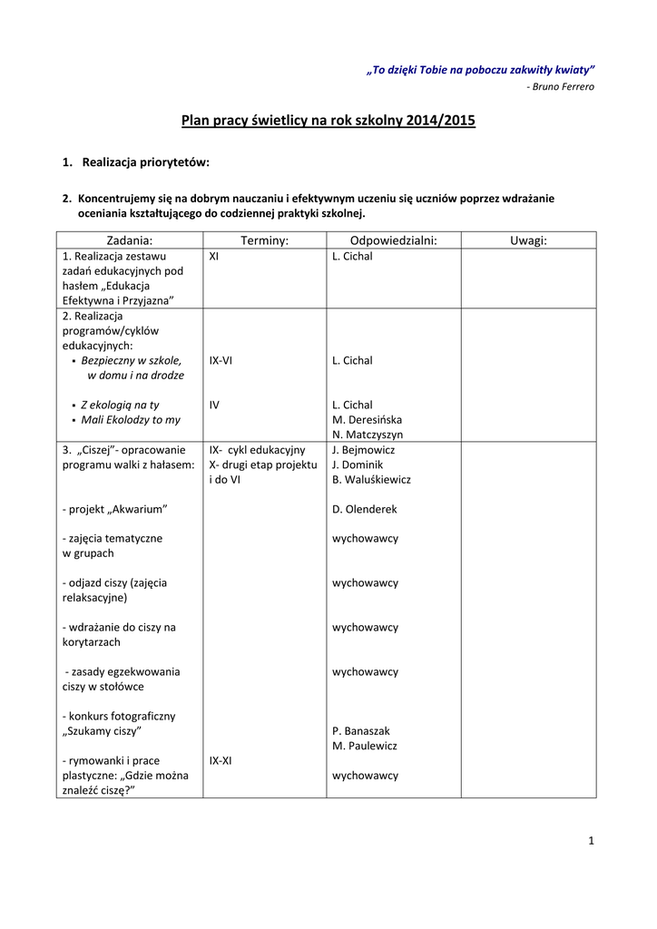 „To dzięki Tobie na poboczu zakwitły kwiaty” - Bruno Ferrero Plan pracy świetlicy na rok szkolny 2014/2015 1. Realizacja priorytetów: 2. Koncentrujemy się na dobrym nauczaniu i efektywnym uczeniu się uczniów poprzez wdrażanie oceniania kształtującego do codziennej praktyki szkolnej. Zadania: 1. Realizacja zestawu zadań edukacyjnych pod hasłem „Edukacja Efektywna i Przyjazna” 2. Realizacja programów/cyklów edukacyjnych: Bezpieczny w szkole, w domu i na drodze Z ekologią na ty Mali Ekolodzy to my 3. „Ciszej”- opracowanie programu walki z hałasem: Terminy: Odpowiedzialni: XI L. Cichal IX-VI L. Cichal IV L. Cichal M. Deresińska N. Matczyszyn J. Bejmowicz J. Dominik B. Waluśkiewicz IX- cykl edukacyjny X- drugi etap projektu i do VI - projekt „Akwarium” D. Olenderek - zajęcia tematyczne w grupach wychowawcy - odjazd ciszy (zajęcia relaksacyjne) wychowawcy - wdrażanie do ciszy na korytarzach wychowawcy - zasady egzekwowania ciszy w stołówce wychowawcy - konkurs fotograficzny „Szukamy ciszy” - rymowanki i prace plastyczne: „Gdzie można znaleźć ciszę?” Uwagi: P. Banaszak M. Paulewicz IX-XI wychowawcy 1 4. Omnibus „Zdrowy styl życia” III-IV 5. Święto Pluszowego Misia, czyli Dzień Życzliwości i Pozdrowień XI 6. Tydzień europejski V 7.„Szanujmy uczucia” II kl. I- J. Skotnicka J. Dominik Kl. II i III- P. Banaszak K. Chyc A. LechWawrzynkowska M. Paulewicz kl. I- J. Skotnicka J. Dominik J. Bejmowicz Kl. II i III- P. Banaszak K. Chyc M. Paulewicz Wszyscy wychowawcy L. Cichal D. Kozińska 3. Odkrywamy i rozwijamy uzdolnienia, poszukujemy skutecznych metod pracy , aby każdy uczeń miał szansę „zakwitnąć”, celebrujemy i promujemy sukcesy naszych uczniów. Zadania: Terminy: Odpowiedzialni: 1. „Konkurs tańca” VI 2. „Portret w stylu Arcimboldo” XI 3. „Konkurs misiowy” XI 4. „Świat wyobraźni” II semestr 5. „Uważny słuchacz”, konkursy towarzyszące akcji „Cała świetlica czyta dzieciom” 6. „Piosenki z dawnych lat” III J. Jarek J. Dominik II kl. I- N. Matczyszyn M. Deresińska kl. II i III- K. Chyc A. LechWawrzynkowska P. Banaszak 7. „Czarodziejskie słowa” - realizacja programu świetlicowego 8. „Psychologiczne gry i zabawy integracyjne IX-VI IX-X kl. I M. Deresińska B. Waluśkiewicz D. Olenderek M. Pawlina kl. I- J. Skotnicka J. Dominik J. Bejmowicz Kl. II i III- P. Banaszak K. Chyc M. Paulewicz D. Olenderek Uwagi: Konkurs dla klas I Konkurs międzyszkolny Konkurs dla klas II i III L. Cichal D. Kozińska P. Banaszak L. Cichal P. Matyja 2 w świetlicy" - realizacja zestawu zabaw edukacyjnych dla wychowawców świetlicy. 4. Współpracując z rodzicami, wyrabiamy u naszych uczniów dobre nawyki związane z prawidłowym odżywianiem i kulturą spożywania posiłków, aktywnością ruchową podczas lekcji w-fu oraz zajęć pozalekcyjnych, troską o higienę osobistą. Zadania: Terminy: Odpowiedzialni: Uwagi: 1. Realizacja programów/cyklów edukacyjnych: „Trzymaj się prosto” X i VI Kl. I- B. Waluśkiewicz Kl. II i III- A. LechWawrzynkowska X L. Cichal J. Bejmowicz B. Waluśkiewicz P. Matyja N. Matczyszyn M. Deresińska Kl. I- J. Bejmowicz B. Waluśkiewicz Kl. II i III- J. Jarek A. LechWawrzynkowska L. Cichal Wszyscy wychowawcy „Wiem, co jem” 2. Igrzyska olimpijskie w świetlicy VI 3. „Bezpieczny w świetlicy” – wdrażanie dzieci do przestrzegania zasad bezpieczeństwa swojego i innych w świetlicy, w szatni, na korytarzu, w toalecie, na boisku, na ulicy. 4. „Chcę się bawić przyjemnie i bezpiecznie” - udział wychowanków w programie przeciw agresji i przemocy. IX-VI IX L. Cichal N. Matczyszyn P. Matyja 5. Woda skarb nad skarby III D. Olenderek 3 5. Zarówno w domu , jak i w szkole zwracamy uwagę na korzyści wynikające z nowoczesnych technologii, promujemy kulturę w sieci, zdecydowanie przeciwstawiamy się cyberprzemocy. Zadania: Terminy: Odpowiedzialni: 1. Wykorzystanie technologii informatycznej w codziennej pracy świetlicy: prezentacje, materiały dydaktyczne 2. „Złość i ja” IX-VI Wszyscy wychowawcy III 3. „Radość, smutek, złość – uczymy się nazywać i wyrażać swoje uczucia – w zabawie, muzyce, plastyce i w życiu” – opracowanie i realizacja w grupach zestawu zajęć w świetlicy. XI-XII M. Pawlina M. Deresińska D. Kozińska M. Pawlina D. Kozińska Uwagi: 2. Dbanie o rozwój psychofizyczny uczniów: Planowane działania: 1. „Psychologiczne gry i zabawy integracyjne w świetlicy" - realizacja zestawu zabaw edukacyjnych dla wychowawców świetlicy. 2. „Radość, smutek, złość – uczymy się nazywać i wyrażać swoje uczucia – w zabawie, muzyce, plastyce i w życiu” – opracowanie i realizacja w grupach zestawu zajęć w świetlicy. Sposoby realizacji: Termin: Odpowiedzialni: Tygodniowy cykl edukacyjny według scenariuszy X L. Cichal P. Matyja Tygodniowy cykl edukacyjny według scenariuszy XI-XII M. Pawlina D. Kozińska Uwagi: 4 3. Realizacja programów/cyklów edukacyjnych: Bezpieczny w szkole, w domu i na drodze Tygodniowy cykl edukacyjny według scenariuszy IX-VI L. Cichal i wychowawcy Z ekologią na ty Mali Ekolodzy to my IV L. Cichal M. Deresińska N. Matczyszyn „Trzymaj się prosto” X i VI Kl. I- B. Waluśkiewicz Kl. II i III- A. LechWawrzynkowska „Wiem, co jem” X L. Cichal J. Bejmowicz B. Waluśkiewicz P. Matyja N. Matczyszyn M. Deresińska IX- cykl edukacyjny X- drugi etap projektu i do VI J. Bejmowicz J. Dominik B. Waluśkiewicz 3. „Ciszej”opracowanie programu walki z hałasem: Opracowanie, wdrożenie i monitorowanie programu - projekt „Akwarium” - zajęcia tematyczne w grupach Udział grupy w projekcie plastycznym - odjazd ciszy (zajęcia relaksacyjne) Tygodniowy cykl edukacyjny według scenariuszy - wdrażanie do ciszy na korytarzach - zasady egzekwowania ciszy w stołówce Kontrakty grupowe, rozmowy wychowawcze - konkurs fotograficzny „Szukamy ciszy” Konkurs - rymowanki i prace plastyczne: „Gdzie moż