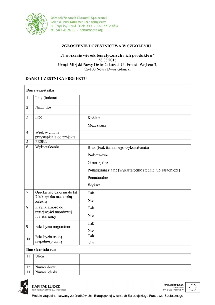 ZGŁOSZENIE UCZESTNICTWA W SZKOLENIU „Tworzenie wiosek tematycznych i ich produktów” 28.03.2015 Urząd Miejski Nowy Dwór Gdański, Ul. Ernesta Wejhera 3, 82-100 Nowy Dwór Gdański DANE UCZESTNIKA PROJEKTU Dane uczestnika 1 Imię (imiona) 2 Nazwisko 3 Płeć Kobieta Mężczyzna 4 5 6 Wiek w chwili przystąpienia do projektu PESEL Wykształcenie Brak (brak formalnego wykształcenia) Podstawowe Gimnazjalne Ponadgimnazjalne (wykształcenie średnie lub zasadnicze) Pomaturalne Wyższe 7 8 9 10 Opieka nad dziećmi do lat 7 lub opieka nad osobą zależną Tak Przynależność do mniejszości narodowej lub etnicznej Tak Fakt bycia migrantem Fakt bycia osobą niepełnosprawną Nie Nie Tak Nie Tak Nie Dane kontaktowe 11 Ulica 12 13 Numer domu Numer lokalu Projekt współfinansowany ze środków Unii Europejskiej w ramach Europejskiego Funduszu Społecznego 14 Miejscowość 15 Obszar Obszar (teren) miejski Obszar (teren) wiejski 16 17 18 19 20 21 Kod pocztowy Województwo Powiat Telefon stacjonarny Telefon komórkowy Adres poczty elektronicznej (e-mail) DANE INSTYTUCJI 1 Nazwa instytucji 2 NIP 3 REGON 4 Typ instytucji Instytucje rynku pracy, w tym publiczne Służby Zatrudnienia Instytucja pomocy i integracji społecznej Służba więzienna Zakład poprawczy/schronisko dla nieletnich Przedsiębiorstwo Jednostka administracji rządowej Jednostka administracji samorządowej Organizacja pozarządowa Partnerzy społeczno-gospodarczy Inna 5 6 Polska Klasyfikacja Działalności (PKD) *w przypadku gdy w pkt. 4 zostanie zaznaczone przedsiębiorstwo Wielkość instytucji *w przypadku gdy w pkt. 4 zostanie zaznaczone przedsiębiorstwo Mikroprzedsiębiorstwo Małe lub średnie przedsiębiorstwo Duże przedsiębiorstwo Dane teleadresowe 7 Ulica Projekt współfinansowany ze środków Unii Europejskiej w ramach Europejskiego Funduszu Społecznego 8 9 10 Numer lokalu Miejscowość Obszar Obszar (teren) miejski Obszar (teren) wiejski 11 12 13 14 15 Kod pocztowy Województwo Powiat Telefon kontaktowy Adres poczty elektronicznej (e-mail) Wysyłając formularz zgłoszenia kandydat zobowiązuje się do pełnego uczestnictwa w szkoleniach w pełnym wymiarze godzin w terminie wskazanym w informacji o szkoleniu. W przypadku braku powiadomienia o rezygnacji z potwierdzonego udziału, organizator zastrzega sobie prawo obciążenia instytucji delegującej kosztami organizacji szkolenia i materiałów szkoleniowych. Organizatorzy zastrzegają sobie prawo do decyzji o zakwalifikowaniu uczestnika na szkolenie. W przypadku pytań prosimy kontaktować się z Pauliną Sieradzan [email protected]; +58 344 40 39 Zebrane dane będą przetwarzane i wykorzystane przez Ośrodek Wsparcia Ekonomii Społecznej w Gdańsku działający przy Gdańskim Obszarze Metropolitalnym, Regionalnym Centrum Informacji i Wspomagania Organizacji Pozarządowych, Caritas Archidiecezji Gdańskiej, Pomorską Specjalną Strefę Ekonomiczną Sp. z o. o., Pracodawców Pomorza oraz Instytucję Pośredniczącą POKL w Gdańsku w celu prowadzenia działań szkoleniowych, doradczych, animacyjnych i informacyjno-promocyjnych, rekrutacji, bieżącej działalności, w tym promocji działań, sprawozdawczości, monitoringu, kontroli oraz ewaluacji. Dane są przekazywane dobrowolnie, jednak ich nieprzekazanie uniemożliwia skorzystanie z usług Ośrodka Wsparcia Ekonomii Społecznej. Informujemy także o prawie do dostępu oraz możliwości poprawienia danych zgodnie z przepisami ustawy z dnia 29.08.1997 o ochronie danych osobowych (Dz. U. z 2002 r. Nr 101, poz. 926, ze zm.). Podpis Projekt współfinansowany ze środków Unii Europejskiej w ramach Europejskiego Funduszu Społecznego