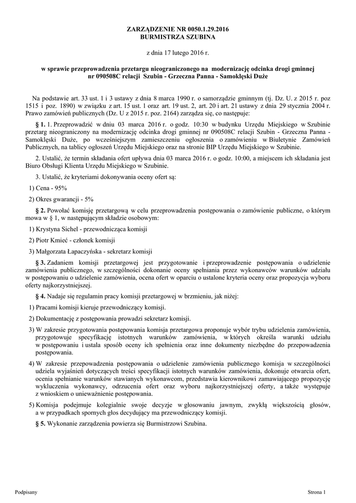 ZARZĄDZENIE NR 0050.1.29.2016 BURMISTRZA SZUBINA z dnia 17 lutego 2016 r. w sprawie przeprowadzenia przetargu nieograniczonego na modernizację odcinka drogi gminnej nr 090508C relacji Szubin - Grzeczna Panna - Samoklęski Duże Na podstawie art. 33 ust. 1 i 3 ustawy z dnia 8 marca 1990 r. o samorządzie gminnym (tj. Dz. U. z 2015 r. poz 1515 i poz. 1890) w związku z art. 15 ust. 1 oraz art. 19 ust. 2, art. 20 i art. 21 ustawy z dnia 29 stycznia 2004 r. Prawo zamówień publicznych (Dz. U z 2015 r. poz. 2164) zarządza się, co następuje: § 1. 1. Przeprowadzić w dniu 03 marca 2016 r. o godz. 10:30 w budynku Urzędu Miejskiego w Szubinie przetarg nieograniczony na modernizację odcinka drogi gminnej nr 090508C relacji Szubin - Grzeczna Panna Samoklęski Duże, po wcześniejszym zamieszczeniu ogłoszenia o zamówieniu w Biuletynie Zamówień Publicznych, na tablicy ogłoszeń Urzędu Miejskiego oraz na stronie BIP Urzędu Miejskiego w Szubinie. 2. Ustalić, że termin składania ofert upływa dnia 03 marca 2016 r. o godz. 10:00, a miejscem ich składania jest Biuro Obsługi Klienta Urzędu Miejskiego w Szubinie. 3. Ustalić, że kryteriami dokonywania oceny ofert są: 1) Cena - 95% 2) Okres gwarancji - 5% § 2. Powołać komisję przetargową w celu przeprowadzenia postępowania o zamówienie publiczne, o którym mowa w § 1, w następującym składzie osobowym: 1) Krystyna Sichel - przewodnicząca komisji 2) Piotr Kmieć - członek komisji 3) Małgorzata Łapaczyńska - sekretarz komisji § 3. Zadaniem komisji przetargowej jest przygotowanie i przeprowadzenie postępowania o udzielenie zamówienia publicznego, w szczególności dokonanie oceny spełniania przez wykonawców warunków udziału w postępowaniu o udzielenie zamówienia, ocena ofert w oparciu o ustalone kryteria oceny oraz propozycja wyboru oferty najkorzystniejszej. § 4. Nadaje się regulamin pracy komisji przetargowej w brzmieniu, jak niżej: 1) Pracami komisji kieruje przewodniczący komisji. 2) Dokumentację z postępowania prowadzi sekretarz komisji. 3) W zakresie przygotowania postępowania komisja przetargowa proponuje wybór trybu udzielenia zamówienia, przygotowuje specyfikację istotnych warunków zamówienia, w których określa warunki udziału w postępowaniu i ustala sposób oceny ich spełnienia oraz inne dokumenty niezbędne do przepowadzenia postępowania. 4) W zakresie przepowadzenia postępowania o udzielenie zamówienia publicznego komisja w szczególności udziela wyjaśnień dotyczących treści specyfikacji istotnych warunków zamówienia, dokonuje otwarcia ofert, ocenia spełnianie warunków stawianych wykonawcom, przedstawia kierownikowi zamawiającego propozycję wykluczenia wykonawcy, odrzucenia ofert oraz wyboru najkorzystniejszej oferty, a także występuje z wnioskiem o unieważnienie postępowania. 5) Komisja podejmuje kolegialnie swoje decyzje w głosowaniu jawnym, zwykłą większością głosów, a w przypadkach spornych głos decydujący ma przewodniczący komisji. § 5. Wykonanie zarządzenia powierza się Burmistrzowi Szubina. Podpisany Strona 1 § 6. Zarządzenie wchodzi w życie z dniem podpisania. Burmistrz Szubina Artur Michalak Podpisany Strona 2 Uzasadnienie Zgodnie z przepismi ustawy z dnia 29 stycznia 2004 r. Prawo zamówień publicznych, postępowanie o udzielenie zamówienia publicznego przygotowuje i przeprowadza zamawiający. Do zadań kierownika zamawiającego - Burmistrza Szubina - należy powołanie komisji przetargowej, stanowiącej zespół pomocniczy kierownika zamawiającego, wykonującej czynności w postępowaniu w zakresie oceny spełniania przez wykonawców warunków udziału w postępowaniu oraz badania i oceny ofert. Członków komisji przetargowej powołuje i odwołuje kierownik zamawiającego, a skład komisji wynosi co najmniej trzy osoby. Kierownik zamawiającego określa organizację, skład, tryb pracy oraz zakres obowiązków członków komisji przetargowej, mając na celu zapewnienie sprawności jej działania, indywidualnej odpowiedzialności jej członków za wykonywanie czynności oraz przejrzystości prac. Burmistrz Szubina Artur Michalak Podpisany Strona 1