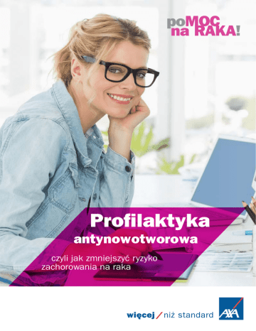 ! Profilaktyka antynowotworowa czyli jak zmniejszyć ryzyko zachorowania na raka ń o r Ch d e z r p ę si ! m e i k a r AXA - PROFILAKTYKA ANTYNOWOTWOROWA W Europejskim Kodeksie Walki z Rakiem szczegółowo wymieniono zbiór zasad, których przestrzeganie może pomóc uchronić się przed rakiem. Oto one: Nie pal Unikaj nadmiernej ekspozycji na promienie słoneczne Jeśli palisz, postaraj się jak najszybciej rzucić ten nałóg. Poza tym nie pal przy niepalących. Po rzuceniu palenia ryzyko rozwoju nowotworów szybko się zmniejsza. Korzyści zdrowotne obserwuje się już po 5 latach od zerwania z nałogiem. Szczególnie chroń dzieci i młodzież. Osoby mające skłonność do oparzeń słonecznych powinny przez całe życie stosować środki chroniące przed słońcem. Wystrzegaj się otyłości Stosuj się zawsze do instrukcji postępowania z substancjami rakotwórczymi. Przestrzegaj zaleceń krajowych ośrodków ochrony radiologicznej. W Europie Zachodniej i USA otyłość stanowi drugi po paleniu tytoniu czynnik ryzyka rozwoju chorób przewlekłych, zwłaszcza cukrzycy, chorób układu krążenia i nowotworów złośliwych. Przekonujące dane wskazują na związek otyłości z zachorowaniami na raka okrężnicy, piersi (po menopauzie), trzonu macicy, nerki i gruczolakoraka przełyku. Uprawiaj sport, ćwicz Aktywność fizyczna, związana z regularnym, umiarkowanym wysiłkiem może być wskazana dla utrzymania odpowiedniej masy ciała, szczególnie u osób prowadzących siedzący tryb życia. Zaleca się wykonanie gimnastyki 3 razy w tygodniu po pół godziny. Z punktu widzenia profilaktyki chorób nowotworowych korzystniejsze są jednak częstsze, bardziej forsowne ćwiczenia. Jedz więcej różnych warzyw i owoców Jedz co najmniej 5 porcji dziennie. Ogranicz spożycie produktów zawierających tłuszcze zwierzęce. Ogranicz alkohol Jeśli pijesz alkohol – piwo, wino lub trunki wysokoprocentowe – ogranicz jego spożycie. Mężczyźni powinni wypijać nie więcej niż dwie porcje dziennie (1 porcja to 0,5 litra piwa lub 100 g wódki), kobiety – nie więcej niż jedną porcję dziennie. Przestrzegaj przepisów dotyczących ochrony przed narażeniem na znane substancje rakotwórcze Program szczepień ochronnych Bierz udział w programach szczepień ochronnych, przede wszystkim przeciwko wirusowi zapalenia wątroby typu B. Po 25. roku życia Kobiety po 25. roku życia powinny uczestniczyć w badaniach przesiewowych w kierunku raka szyjki macicy. Po 50. roku życia Kobiety powyżej 50. roku życia powinny uczestniczyć w badaniach przesiewowych w kierunku raka piersi. Kobiety i mężczyźni po 50. roku życia Kobiety i mężczyźni po 50. roku życia powinni uczestniczyć w badaniach przesiewowych w kierunku raka jelita grubego. Więcej informacji: http://www.kodekswalkizrakiem.pl 2 j a d a B ! ę si AXA - PROFILAKTYKA ANTYNOWOTWOROWA W Polsce około 140 tysięcy ludzi rocznie dowiaduje się, że ma nowotwór. 90 tysięcy z powodu tej choroby umiera. Te statystyki mogłyby się obniżyć, gdybyśmy regularnie korzystali z badań profilaktycznych i co najmniej raz w roku badali krew. W naszym kraju wciąż u zbyt wielu pacjentów chorobę nowotworową diagnozuje się w jej zaawansowanym stadium, kiedy szanse na całkowite wyleczenie są już niewielkie – mówi dr Leszek Kraj z Kliniki Hematologii, Onkologii i Chorób Wewnętrznych Samodzielnego Publicznego Szpitala Klinicznego w Warszawie. Dlaczego tak późno? Przede wszystkim dlatego, że się nie badamy lub badamy się zbyt późno. Większość z nas uważa, że nowotwór to sprawa innych. A tymczasem mamy do dyspozycji stosunkowo proste narzędzia w postaci badań przesiewowych by znacznie zwiększyć swoje szanse na wczesne wykrycie nowotworu i całkowite wyleczenie. Ponadto, zapominamy na co dzień o podstawowych zasadach profilaktyki przeciwnowotworowej. Poznaj listę badań, których regularne wykonywanie zwiększy nasze szanse w walce z chorobą nowotworową. Zaś podstawowe zasady profilaktyki przeciwnowotworowej znacznie zmniejszą prawdopodobieństwo rozwoju nowotworu. Badania przesiewowe w onkologi Badania przesiewowe skierowane są do osób zdrowych (czyli bez objawów sugerujących chorobę nowotworową), ze standardowym ryzykiem zachorowania, w celu wczesnego wykrycia nowotworu albo stanu przedrakowego. Głównym celem badań przesiewowych jest zmniejszenie umieralności z powodu choroby nowotworowej. Współcześnie twarde dowody naukowe odnośnie skuteczności badań przesiewowych mamy w odniesieniu do raka piersi, raka szyjki macicy i raka jelita grubego. Odnośnie raka prostaty i wykonywania standardowo badania PSA istnieje wiele kontrowersji. W najbliższej przyszłości najpewniej dołączy do badań przesiewowych tzw. niskodawkowa tomografia komputerowa w odniesieniu do wczesnego wykrywania raka płuca u palaczy tytoniu. 4 AXA - PROFILAKTYKA ANTYNOWOTWOROWA Po pierwsze: mammografia Rak piersi jest w Polsce najczęstszym nowotworem u kobiet. Dane statystyczne mówią o ponad 16 500 zachorowaniach rocznie, z czego wciąż zbyt wiele pacjentek jest diagnozowanych w zaawansowanym stadium choroby. A tymczasem wcześnie wykryty nowotwór piersi daje ogromne szanse na całkowite wyleczenia. Problem w tym, że z bezpłatnej mammografii korzysta tylko 25% Polek. Jak często się badać i w jakim wieku? Realizowany w Polsce Program Wczesnego Wykrywania Raka Piersi adresowany jest do kobiet w wieku 50-69 lat, które nie korzystały z badania mammograficznego w ciągu ostatnich 24 miesięcy. Czyli mammografię powinno się wykonywać, przy standardowym ryzyku, co dwa lata. Kiedy wykryto u danej kobiety czynniki ryzyka, takie jak np.: rak piersi wśród członków rodziny (u matki, siostry lub córki) oraz mutacje w obrębie genów BRCA 1 lub/i BRCA 2 badanie wykonuje się co 12 miesięcy. Wtedy też rodzaj i zakres badań przesiewowych powinien być ustalany indywidualnie. Kobieta na badanie mammograficzne może si
