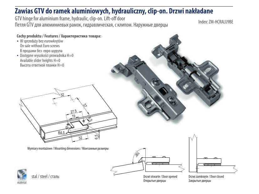 Zawias GTV do ramek aluminiowych, hydrauliczny, clip-on. Drzwi nakładane GTV hinge for aluminium frame, hydraulic, clip-on. Lift-off door Петля GTV для алюминиевых рамок, гидравлическая, с клипом. Наружные дверцы Index: ZM-HCRALU9BE Cechy produktu / Features / Характеристика товара: W sprzedaży bez eurowkrętów On sale without Euro screws В продажи без евро шурупа Dostępne wysokości prowadnika H=0 Available slider heights H=0 Высота ответной планки H=0 32 37 6.5 27.5 19 32 6.5 16 R4.5 Wymiary montażowe / Mounting dimensions / Монтажные размеры 100 o stal / steel / сталь material Drzwi otwarte / Door opened Открытые дверцы Drzwi zamknięte / Door closed Закрытые дверцы