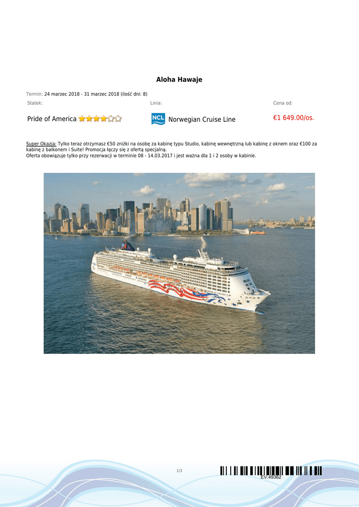 Aloha Hawaje Termin: 24 marzec 2018 - 31 marzec 2018 (ilość dni: 8) Statek: Pride of America Linia: Cena od: Norwegian Cruise Line €1 649.00/os. Super Okazja: Tylko teraz otrzymasz €50 zniżki na osobę za kabinę typu Studio, kabinę wewnętrzną lub kabinę z oknem oraz €100 za kabinę z balkonem i Suite! Promocja łączy się z ofertą specjalną. Oferta obowiązuje tylko przy rezerwacji w terminie 08 - 14.03.2017 i jest ważna dla 1 i 2 osoby w kabinie. 1/3 EV:49362 TRASA REJSU dzień 1 dzień 2 dzień 3 dzień 4 dzień 5 dzień 6 dzień 7 dzień 8 Data Port Wpłynięcie Wypłynięcie sobota 24.03.2018 Honolulu, Oahu, Hawaje --:-- 19:00 niedziela 25.03.2018 Kahului, Maui, Hawaje 08:00 --:-- poniedziałek 26.03.2018 Kahului, Maui, Hawaje --:-- 18:00 wtorek 27.03.2018 Hilo, Hawaii, Hawaje 08:00 18:00 środa 28.03.2018 Kona, Hawaii, Hawaje 07:00 17:30 czwartek 29.03.2018 Nawiliwili, Kauai, Hawaje 10:00 --:-- piątek 30.03.2018 Nawiliwili, Kauai, Hawaje --:-- 14:00 sobota 31.03.2018 Honolulu, Oahu, Hawaje 07:00 --:-- Legenda Stany Zjednoczone Stany Zjednoczone Stany Zjednoczone Stany Zjednoczone Stany Zjednoczone Stany Zjednoczone Stany Zjednoczone Stany Zjednoczone CENNIK Cena katalogowa Kabina wewnętrzna od €1 649.00 Kabina zewnętrzna z oknem od €1 949.00 Kabina zewnętrzna z balkonem od €2 439.00 Suite (apartament) od €3 539.00 Kabina jednoosobowa na zapytanie 3 i 4 osoba dorosła w kabinie na zapytanie dziecko od 2 do 17 lat jako 3 i 4 osoba w kabinie na zapytanie dziecko od 0 do 2 lat jako 3 i 4 osoba w kabinie na zapytanie Cena promocyjna 2/3 EV:49362 Opłaty portowe w cenie Uwaga! Ceny za osobę w kabinie dwuosobowej. Cena zawiera: zakwaterowanie w kabinie wybranej kategorii; wyżywienie - 3 główne posiłki, przekąski między posiłkami, bufet lub przekąski o północy; napoje serwowane do śniadania i w bufetach samoobsługowych; serwis bagażowy podczas wejścia i zejścia ze statku; serwis kabinowy; korzystanie ze wszystkich urządzeń sportowo - rekreacyjnych znajdujących się na pokładzie statku (basen, jacuzzi, sala fitness, itp.); udział we wszystkich imprezach organizowanych na statku (przedstawienia w teatrze, koncerty, programy animacyjne itp.). Cena nie zawiera: kosztów dojazdu do portu; ewentualnych noclegów w hotelu przed/po rejsie i transferów; wycieczek fakultatywnych w trakcie rejsu; korzystania z barów, mini baru w kabinie oraz napojów zamawianych w restauracji; korzystania z punktów usługowych (fryzjer, pralnia, fotograf, salon piękności i odnowy biologicznej, internet) i wydatków osobistych; napiwków dla obsługi na statku (kwota uzależniona od długości rejsu); ubezpieczenia KL, NNW i bagaż, kosztów wiz (tam gdzie wymagane). 3/3 EV:49362