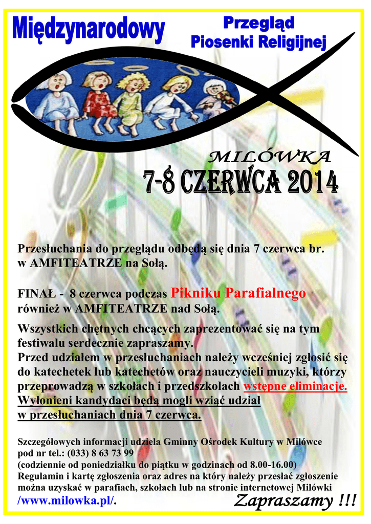 Przesłuchania do przeglądu odbędą się dnia 7 czerwca br. w AMFITEATRZE na Sołą. FINAŁ - 8 czerwca podczas Pikniku Parafialnego również w AMFITEATRZE nad Sołą. Wszystkich chętnych chcących zaprezentować się na tym festiwalu serdecznie zapraszamy. Przed udziałem w przesłuchaniach należy wcześniej zgłosić się do katechetek lub katechetów oraz nauczycieli muzyki, którzy przeprowadzą w szkołach i przedszkolach wstępne eliminacje. Wyłonieni kandydaci będą mogli wziąć udział w przesłuchaniach dnia 7 czerwca. Szczegółowych informacji udziela Gminny Ośrodek Kultury w Milówce pod nr tel.: (033) 8 63 73 99 (codziennie od poniedziałku do piątku w godzinach od 8.00-16.00) Regulamin i kartę zgłoszenia oraz adres na który należy przesłać zgłoszenie można uzyskać w parafiach, szkołach lub na stronie internetowej Milówki /www.milowka.pl/.