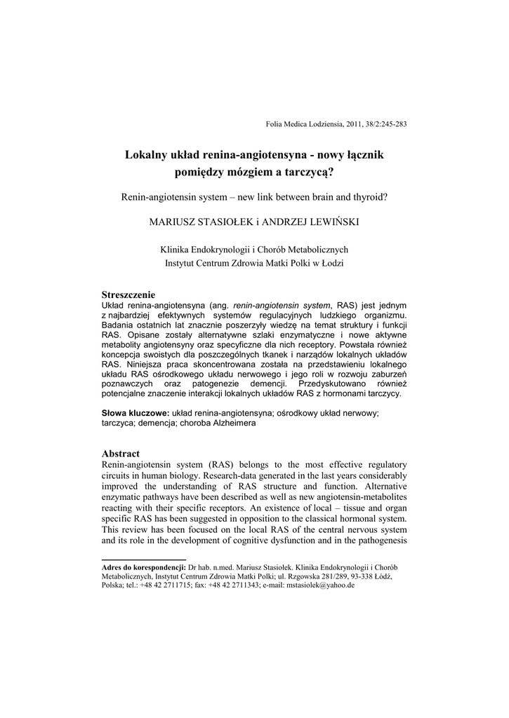 Folia Medica Lodziensia, 2011, 38/2:245-283 Lokalny układ renina-angiotensyna - nowy łącznik pomiędzy mózgiem a tarczycą? Renin-angiotensin system – new link between brain and thyroid? MARIUSZ STASIOŁEK i ANDRZEJ LEWIŃSKI Klinika Endokrynologii i Chorób Metabolicznych Instytut Centrum Zdrowia Matki Polki w Łodzi Streszczenie Układ renina-angiotensyna (ang. renin-angiotensin system, RAS) jest jednym z najbardziej efektywnych systemów regulacyjnych ludzkiego organizmu. Badania ostatnich lat znacznie poszerzyły wiedzę na temat struktury i funkcji RAS. Opisane zostały alternatywne szlaki enzymatyczne i nowe aktywne metabolity angiotensyny oraz specyficzne dla nich receptory. Powstała również koncepcja swoistych dla poszczególnych tkanek i narządów lokalnych układów RAS. Niniejsza praca skoncentrowana została na przedstawieniu lokalnego układu RAS ośrodkowego układu nerwowego i jego roli w rozwoju zaburzeń poznawczych oraz patogenezie demencji. Przedyskutowano również potencjalne znaczenie interakcji lokalnych układów RAS z hormonami tarczycy. Słowa kluczowe: układ renina-angiotensyna; ośrodkowy układ nerwowy; tarczyca; demencja; choroba Alzheimera Abstract Renin-angiotensin system (RAS) belongs to the most effective regulatory circuits in human biology. Research-data generated in the last years considerably improved the understanding of RAS structure and function. Alternative enzymatic pathways have been described as well as new angiotensin-metabolites reacting with their specific receptors. An existence of local – tissue and organ specific RAS has been suggested in opposition to the classical hormonal system. This review has been focused on the local RAS of the central nervous system and its role in the development of cognitive dysfunction and in the pathogenesis Adres do korespondencji: Dr hab. n.med. Mariusz Stasiołek. Klinika Endokrynologii i Chorób Metabolicznych, Instytut Centrum Zdrowia Matki Polki; ul. Rzgowska 281/289, 93-338 Łódź, Polska; tel.: +48 42 2711715; fax: +48 42 2711343; e-mail: [email protected] 246 Nowe aspekty układu renina-angiotensyna w mózgu of dementia. A potential interaction of local RAS and thyroid hormones was also discussed. Key words: renin-angiotensin system; central nervous system; thyroid; dementia; Alzheimer’s disease Wstęp W ostatnich latach wiele uwagi poświęca się układowi renina-angiotensyna (ang. renin-angiotensin-system; RAS) jako jednemu z najbardziej efektywnych układów regulacyjnych ludzkiego organizmu. W kaskadzie hormonalnej RAS angiotensynogen produkowany w wątrobie i wydzielany do krwi obwodowej jest przekształcany enzymatycznie przez reninę do dekapeptydu angiotensyny I. Angiotensyna I (ang. angiotensin - Ang) jest substratem dla związanej ze śródbłonkiem błonowej metalloproteazy – enzymu konwertującego angiotensynę (ang. angiotensin converting enzyme, ACE), który usuwa 2 aminokwasy z końca karboksylowego cząsteczki, powodując powstanie oktapeptydu Ang II – molekuły uważanej za najbardziej aktywną składową RAS. Angiotensyna II wywiera swoje efekty w różnych tkankach i organach poprzez interakcję z dwoma głównymi podtypami receptorów związanych z cząsteczką G: receptorem angiotensyny typu 1 i 2 (odpowiednio: AT1R i AT2R) [1]. Przeprowadzone do tej pory badania sugerują, że większość z „klasycznych” fizjologicznych efektów działania Ang II (regulacja ciśnienia tętniczego krwi i czynności serca oraz kontrola gospodarki wodnoelektrolitowej) odbywa się za pośrednictwem AT1R [2]. AT1R ze względu na swoją dobrze opisaną zdolność do stymulowania proliferacji komórkowej, oraz właściwości wazokonstryktywne, pro-zapalne, pro-apoptotyczne i oksydacyjne, został zaproponowany również jako główny mediator niekorzystnych efektów działania Ang II w warunkach patologicznych związanych z miażdżycą naczyń tętniczych, przerostem lewej komory serca, nefropatią, retinopatią i innymi chorobami [1, 3]. W zgodzie z danymi pochodzącymi z prac eksperymentalnych, M. Stasiołek i A. Lewiński 247 farmakologiczna modulacja aktywności Ang II za pomocą inhibitorów ACE (ang. ACE-inhibitors, ACE-I) lub antagonistów AT1R (ang. Angiotensin Receptor Blocker, ARB) okazała się bardzo skutecznym środkiem terapii w poważnych schorzeniach, takich jak nadciśnienie tętnicze, choroba niedokrwienna serca, niewydolność serca i nerek [4]. W odróżnieniu od AT1R, drugi z podstawowych receptorów Ang II – AT2R ulega wysokiej ekspresji w tkankach płodowych, podczas gdy jego ekspresja w dorosłym organizmie osiąga znacznie niższy poziom [5]. Jednakże wykazano, iż gęstość ekspresji AT2R wzrasta w przebiegu licznych procesów patologicznych, a aktywacja tego receptora wywiera przeciwne do AT1R działanie anty-proliferacyjne, wazorelaksacyjne, anty-oksydacyjne, przeciwzapalne i anty-apoptotyczne, bez istotnego wpływu na regulację ciśnienia tętniczego [6]. Przeciwstawna funkcja AT1R i AT2R została potwierdzona również poprzez charakteryzację zwierząt laboratoryjnych pozbawionych w wyniku manipulacji genetycznej ekspresji odpowiednich receptorów [7, 8]. Zrozumienie funkcji regulacyjnej RAS zostało w ostatnich latach znacznie skomplikowane poprzez odkrycie alternatywnych szlaków enzymatycznych i nowych metabolitów angiotensyny ze specyficznymi właściwościami biologicznymi, jak również nowych składników RAS pełniących funkcję receptorową. Niedawno opisany enzym homologiczny do ACE – ACE2 [9] może metabolizować Ang I do nonapetydu Ang (1-9), ale jego główną aktywnością jest bardzo wydajna przemiana enzymatyczna cząsteczki Ang II prowadząca do powstawania cząsteczki Ang (1-7) [10]. Wykazano, że Ang-(1-7) wiąże się ze specyficznym dla siebie receptorem - nazywanym Mas i wywiera efekty przeciwne do zależnych od aktywacji osi ACE - Ang II - AT1R [11]. Kolejny szlak metaboliczny - związany z aminopeptydazą A i amin