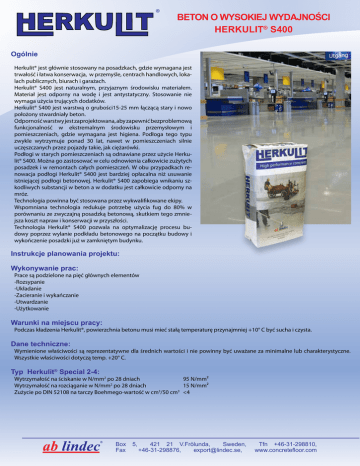 BETON O WYSOKIEJ WYDAJNOŚCI HERKULIT® S400 Ogólnie Herkulit® jest głównie stosowany na posadzkach, gdzie wymagana jest trwałość i łatwa konserwacja, w przemyśle, centrach handlowych, lokalach publicznych, biurach i garażach. Herkulit® S400 jest naturalnym, przyjaznym środowisku materiałem. Materiał jest odporny na wodę i jest antystatyczny. Stosowanie nie wymaga użycia trujących dodatków. Herkulit® S400 jest warstwą o grubości15-25 mm łączącą stary i nowo położony stwardniały beton. Odporność warstwy jest zaprojektowana, aby zapewnić bezproblemową funkcjonalność w ekstremalnym środowisku przemysłowym i pomieszczeniach, gdzie wymagana jest higiena. Podłoga tego typu zwykle wytrzymuje ponad 30 lat, nawet w pomieszczeniach silnie uczęszczanych przez pojazdy takie, jak ciężarówki. Podłogi w starych pomieszczeniach są odnawiane przez użycie Herkulit® S400. Można go zastosować w celu odnowienia całkowicie zużytych posadzek i w remontach całych pomieszczeń. W obu przypadkach renowacja podłogi Herkulit® S400 jest bardziej opłacalna niż usuwanie istniejącej podłogi betonowej. Herkulit® S400 zapobiega wnikaniu szkodliwych substancji w beton a w dodatku jest całkowicie odporny na mróz. Technologia powinna być stosowana przez wykwalifikowane ekipy. Wspomniana technologia redukuje potrzebę użycia fug do 80% w porównaniu ze zwyczajną posadzką betonową, skutkiem tego zmniejsza koszt napraw i konserwacji w przyszłości. Technologia Herkulit® S400 pozwala na optymalizację procesu budowy poprzez wylanie podkładu betonowego na początku budowy i wykończenie posadzki już w zamkniętym budynku. Instrukcje planowania projektu: Wykonywanie prac: Prace są podzielone na pięć głównych elementów -Rozsypanie -Układanie -Zacieranie i wykańczanie -Utwardzanie -Użytkowanie Warunki na miejscu pracy: Podczas kładzenia Herkulit®, powierzchnia betonu musi mieć stałą temperaturę przynajmniej +10° C być sucha i czysta. Dane techniczne: Wymienione właściwości są reprezentatywne dla średnich wartości i nie powinny być uważane za minimalne lub charakterystyczne. Wszystkie właściwości dotyczą temp. +20° C. Typ Herkulit® Special 2-4: Wytrzymałość na ściskanie w N/mm2 po 28 dniach 95 N/mm² Wytrzymałość na rozciąganie w N/mm2 po 28 dniach 15 N/mm² Zużycie po DIN 52108 na tarczy Boehmego-wartość w cm3/50 cm3<4 Box Fax 5, 421 21 V.Frölunda, Sweden, +46-31-298876, [email protected], Tfn +46-31-298810, www.concretefloor.com BETON O WYSOKIEJ WYDAJNOŚCI HERKULIT® S400 Opis: W celu osiągnięcia satysfakcjonującego rezultatu przy kładzeniu Herkulit® S400, trzeba zwrócić uwagę, aby podkład betonowy był dobrej jakości. Powierzchnia i struktura betonu jest kluczowa dla przyczepności warstwy wierzchniej. Jeżeli istnieje wątpliwość co do spełnienia wymagań, powinien zostać przeprowadzony test terenowy lub jeśli to konieczne, powinny zostać pobrane próbki do bliższej analizy. Wymagania: Do zapewnienia optymalnego działania Herkulit® S400, podkład betonowy musi spełniać następujące wymagania: Przyczepność: Wytrzymałość na rozciąganie powinno wynosić 1.5 MPa (15 kg/cm2) podczas kładzenia Herkulit® S400. Powierzchnia: Powierzchnia powinna mieć strukturę równą do minimum 2 mm/max 30% grubości warstwy wierzchniej. Powierzchnia powinna być czysta. Równość: Podkład betonowy powinien być wystarczająco równy, tak aby grubość Herkulit® S400 mogła być utrzymana w podanych wymiarach (1525mm). Porady: Jeżeli podkład betonowy ma wytrzymałość na rozciąganie równą przynajmniej 35 N/mm2 i jest dobrej jakości i bez zanieczyszczeń, można spodziewać się, że po zacieraniu lub szlifowaniu i czyszczeniu powierzchni, przyczepność będzie przekraczała wymagane wartości. Dla nowych posadzek: Połóż podkład betonowy tak aby otrzymać równą i jednorodną powierzchnię. Powierzchnia musi być na tyle równa, aby otrzymać warstwę Herkulit® S400 o grubości od 15 do 25mm. Nigdy nie używaj utwardzacza na bazie wosku lub rozpuszczalnika. Podkład betonowy musi być kładziony na równej i stabilnej powierzchni, aby mogły wytrzymać ładunek obciążający go. Box Fax 5, 421 21 V.Frölunda, Sweden, +46-31-298876, [email protected], Tfn +46-31-298810, www.concretefloor.com BETON O WYSOKIEJ WYDAJNOŚCI HERKULIT® S400 Fugi: Podłogi Herkulit® S400 łączą się z podkładem betonowym i nie wymagają fug. Fugi w podkładzie betonowym: Rekomendujemy wykonanie szczelin w nowej powierzchni nad starymi fugami, które się przemieszczają. Frezowanie/Piaskowanie: Powierzchnia musi być wyfrezowana. Grubość podkłądu musi wynosić minimum 2mm lub maximum 30% warstwy Herkulit® S400. Powierzchnia powinna być bez zanieczyszczeń i luźnych zanieczyszczeń. Frezowanie powinno zostać przeprowadzone na całej powierzchni, tak samo na pobliskich ścianach, filarach itp. Czyszczenie powierzchni: Po frezowaniu, beton powinien być dokładnie wyczyszczony. Stosowanie wody i okrywanie: Jeżeli podkład betonowy nie jest nasycony wodą po czyszczeniu, woda powinna być zaaplikowana w czasie od 8 do 24 godzin przed kładzeniem gruntu. Jednocześnie należy powierzchnię odsłonić. Jeżeli pozostaje jakaś wolno stojąca woda, musi ona być usunięta. Kolor: Kolor podstawowy: szary. Pigmenty są dodawane dla uzyskania innych kolorów. Fugi, szczeliny: Mogą być nacinane i wypełniane wedle życzenia. Ochrona ukończonych powierzchni: Powierzchnie Herkulit® S400 wykonane przed zakończeniem budowy budynku, powinny być osłaniane w celu ochrony do zakończenia robót. Wykończenie powierzchni: Naturalne wykwity występujące podczas początkowego okresu użytkowania skutkują matową powierzchnią. Aby temu zaradzić, natychmiast po usunięciu folii należy użyć na powierzchni Lithurin® I i II Wash przy pomocy maszyny czyszczącej. Box Fax 5, 421 21 V.Frölunda, Sweden, +46-31-298876, [