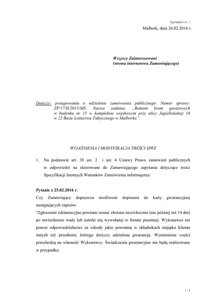 Egzemplarz nr 1 Malbork, dnia 26.02.2016 r. Wszyscy Zainteresowani (strona internetowa Zamawiającego) Dotyczy: postępowania o udzielenie zamówienia publicznego. Numer sprawy: ZP/17/II/2015/MS. Nazwa zadania: „Remont bram garażowych w budynku nr 15 w kompleksie wojskowym przy ulicy Jagiellońskiej 16 w 22 Bazie Lotnictwa Taktycznego w Malborku”. WYJAŚNIENIA I MODYFIKACJA TREŚCI SIWZ 1. Na podstawie art. 38 ust. 2 i ust. 4 Ustawy Prawo zamówień publicznych w odpowiedzi na skierowane do Zamawiającego zapytania dotyczące treści Specyfikacji Istotnych Warunków Zamówienia informujemy: Pytanie z 25.02.2016 r. Czy Zamawiający dopuszcza możliwość dopisania do karty gwarancyjnej następujących zapisów: "Zgłoszenie reklamacyjne powinno zostać złożone niezwłocznie (nie później niż 14 dni) po stwierdzeniu wady lub usterki nią wywołanej w formie pisemnej. Wykonawca nie ponosi odpowiedzialności za szkody jakie powstaną w składnikach majątku klienta innych niż przedmiot, którego dotyczy udzielona gwarancja. Wymienione części przechodzą na własność Wykonawcy. Świadczenia gwarancyjne nie będą realizowane w przypadku: 1/5 Uszkodzeń mechanicznych powstałych w czasie magazynowania, instalowania oraz użytkowania wyrobów niezgodnie z przeznaczeniem Obsługi nieodpowiedniej i niezgodnej z Instrukcją Instalowania i Obsługi produktu lub użytkowania niesprawnego produktu Działania czynników zewnętrznych takich jak: ogień, woda, sole, ługi, kwasy, organiczne rozpuszczalniki zawierające estry, alkohole, aromaty, eter glikolowy lub chlorowane materiały węglowodorowe oraz inne agresywnie działające substancje chemiczne (np. cement, wapno, środki ścierające i czyszczące powodujące ubytki materiałowe lub rysy) lub anormalnych warunków pogodowych, klęsk żywiołowych oraz zdarzeń losowych Przeróbek lub zmian konstrukcyjnych dokonanych przez użytkownika lub osoby trzecie nieupoważnione do takich zmian przez Wykonawcę Napraw przeprowadzonych przez osoby niekompetentne (osoba kompetentna osoba zaopatrzona w niezbędne instrukcje, odpowiednio wyszkolona, o kwalifikacjach wynikających z wiedzy i praktycznego doświadczenia, zapewniająca wykonanie montażu w sposób prawidłowy i bezpieczny) lub nieupoważnione przez Wykonawcę Zastosowania części zamiennych lub dodatkowych urządzeń innych producentów niż części oryginalne Producenta bramy, bez pisemnej zgody Producenta lub Wykonawcy Deformacji paneli bramy segmentowej na skutek ich ugięcia pod wpływem różnicy temperatury wewnątrz i na zewnątrz pomieszczenia." Wyjaśnienie: Zamawiający dopuszcza częściowe zmiany do zapisów karty gwarancyjnej stanowiącej załącznik nr 12 do SIWZ. Dopuszczone zmiany przedstawione są w poniższej tabeli: ZAPISY PROPONOWANE ZAPISY DOPUSZCZONE PRZEZ WYKONAWCĘ PRZEZ ZAMAWIAJĄCEGO Zgłoszenie reklamacyjne powinno zostać złożone niezwłocznie (nie później niż 14 Zamawiający wprowadza dni) po stwierdzeniu wady lub usterki nią w całości proponowany zapis wywołanej w formie pisemnej 2/5 ZAPISY PROPONOWANE PRZEZ WYKONAWCĘ Wykonawca nie ponosi odpowiedzialności za szkody jakie powstaną w składnikach majątku klienta innych niż przedmiot, którego dotyczy udzielona gwarancja. Wymienione części przechodzą na własność Wykonawcy. Świadczenia gwarancyjne nie będą realizowane w przypadku: ZAPISY DOPUSZCZONE PRZEZ ZAMAWIAJĄCEGO Zamawiający wprowadza w części proponowany zapis, poprzez nadanie mu brzmienia: Wykonawca ponosi pełną odpowiedzialności za szkody jakie powstaną w składnikach majątku Zamawiającego innych niż przedmiot, którego dotyczy udzielona gwarancja, a powstałe w wyniku niewłaściwie wykonanej usługi montażu, naprawy gwarancyjnej i przeglądu technicznego. Zamawiający wprowadza w całości proponowany zapis Zamawiający wprowadza w części proponowany zapis, poprzez nadanie mu brzmienia: Uszkodzeń mechanicznych powstałych w czasie użytkowania wyrobów niezgodnie z przeznaczeniem. Uszkodzeń mechanicznych powstałych w czasie magazynowania, instalowania oraz użytkowania wyrobów niezgodnie z przeznaczeniem Obsługi nieodpowiedniej i niezgodnej z Instrukcją Instalowania i Obsługi Zamawiający wprowadza produktu lub użytkowania niesprawnego w całości proponowany zapis. produktu Zamawiający wprowadza w części proponowany zapis, poprzez nadanie mu Działania czynników zewnętrznych brzmienia: takich jak: ogień, woda, sole, ługi, Działania czynników zewnętrznych takich kwasy, organiczne rozpuszczalniki jak: ogień, woda, sole, ługi, kwasy, zawierające estry, alkohole, aromaty, eter organiczne rozpuszczalniki zawierające estry, glikolowy lub chlorowane materiały alkohole, aromaty, eter glikolowy lub węglowodorowe oraz inne agresywnie chlorowane materiały węglowodorowe oraz działające substancje chemiczne (np. inne agresywnie działające substancje cement, wapno, środki ścierające i chemiczne (np. cement, wapno, środki czyszczące powodujące ubytki ścierające i czyszczące powodujące ubytki materiałowe lub rysy) lub anormalnych materiałowe lub rysy) lub anormalnych warunków pogodowych, klęsk warunków pogodowych, klęsk żywiołowych żywiołowych oraz zdarzeń losowych oraz zdarzeń losowych powstałych podczas użytkowania. Przeróbek lub zmian konstrukcyjnych dokonanych przez użytkownika lub Zamawiający wprowadza osoby trzecie nieupoważnione do takich w całości proponowany zapis zmian przez Wykonawcę 3/5 ZAPISY PROPONOWANE PRZEZ WYKONAWCĘ 2. ZAPISY DOPUSZCZONE PRZEZ ZAMAWIAJĄCEGO Napraw przeprowadzonych przez osoby niekompetentne (osoba kompetentna osoba zaopatrzona w niezbędne instrukcje, odpowiednio wyszkolona, o kwalifikacjach wynikających z wiedzy i praktycznego doświadczenia, zapewniająca wykonanie montażu w sposób prawidłowy i bezpieczny) lub nieupoważnione przez Wykonawcę Zastosowania części zamiennych lub dodatkowych urządzeń innych producent