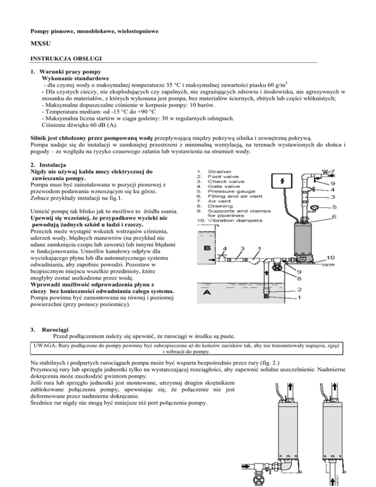 Pompy pionowe, monoblokowe, wielostopniowe MXSU INSTRUKCJA OBSŁUGI 1. Warunki pracy pompy Wykonanie standardowe - dla czystej wody o maksymalnej temperaturze 35 °C i maksymalnej zawartości piasku 60 g/m3 - Dla czystych cieczy, nie eksplodujących czy zapalnych, nie zagrażających zdrowiu i środowisku, nie agresywnych w stosunku do materiałów, z których wykonana jest pompa, bez materiałów ściernych, zbitych lub części włóknistych; - Maksymalne dopuszczalne ciśnienie w korpusie pompy: 10 barów. - Temperatura medium: od -15 °C do +90 °C - Maksymalna liczna startów w ciągu godziny: 30 w regularnych odstępach. Ciśnienie dźwięku 60 dB (A). Silnik jest chłodzony przez pompowaną wodę przepływającą między pokrywą silnika i zewnętrzną pokrywą. Pompa nadaje się do instalacji w zamkniętej przestrzeni z minimalną wentylacją, na terenach wystawionych do słońca i pogody – ze względu na ryzyko czasowego zalania lub wystawienia na strumień wody. 2. Instalacja Nigdy nie używaj kabla mocy elektrycznej do zawieszania pompy. Pompa musi być zainstalowana w pozycji pionowej z przewodem podawania wznoszącym się ku górze. Zobacz przykłady instalacji na fig.1. Umieść pompę tak blisko jak to możliwe to źródła ssania. Upewnij się wcześniej, że przypadkowe wycieki nie powodują żadnych szkód u ludzi i rzeczy. Przeciek może wystąpić wskutek wstrząsów ciśnienia, uderzeń wody, błędnych manewrów (na przykład nie udane zamknięcia czopu lub zaworu) lub innymi błędami w funkcjonowaniu. Umożliw kanałowy odpływ dla wyciekającego płynu lub dla automatycznego systemu odwadniania, aby zapobiec powodzi. Pozostaw w bezpiecznym miejscu wszelkie przedmioty, które mogłyby zostać uszkodzone przez wodę. Wprowadź możliwość odprowadzenia płynu z cieczy bez konieczności odwadniania całego systemu. Pompa powinna być zamontowana na równej i poziomej powierzchni (przy pomocy poziomicy). 3. Rurociągi Przed podłączeniem należy się upewnić, że rurociągi w środku są puste. UWAGA: Rury podłączone do pompy powinny być zabezpieczone aż do końców zacisków tak, aby nie transmitowały napięcia, zgięć i wibracji do pompy. Na stabilnych i podpartych rurociągach pompa może być wsparta bezpośrednio przez rury (fig. 2.) Przymocuj rury lub sprzęgła jednostki tylko na wystarczającej rozciągłości, aby zapewnić solidne uszczelnienie. Nadmierne dokręcenia może zaszkodzić gwintom pompy. Jeśli rura lub sprzęgło jednostki jest montowane, utrzymuj drugim skrętnikiem zablokowane połączenia pompy, upewniając się, że połączenie nie jest deformowane przez nadmierne dokręcanie. Średnice rur nigdy nie mogą być mniejsze niż port połączenia pompy. Fig. 2. Pompa wsparta przez rury. 3.1. Przewód ssania Jeśli przewód ssania jest dłuższy niż 10 m, użyj rury o większej wewnętrznej średnicy niż połączenie pompy z przewodem ssania. Rurka ssąca musi być doskonale nieprzepuszczająca powietrza i być prowadzona ku górze w celu zapobieżenia zapowietrzeniu. Przy instalacji pompy ponad lustrem wody (działanie ssania, fig. 1 A) należy zamontować zawór stopowy z filtrem, który zawsze musi pozostawać zanurzony. Kiedy poziom płynu na stronie ssania jest ponad pompą (dopływ pod pozytywna wysokością ssania, fig. 1B), zamontuj wlot zaworu zasuwowego. Dla ssania ze zbiornika zasobnikowego zamontuj zawór przepływu antywstecznego. Postępuj zgodnie z lokalnymi wymogami w przypadku zwiększania ciśnienia sieciowego. Zainstaluj filtr na stronie ssania pompy, aby zapobiec dostawania się części obcych do pompy. 3.2. Przewód podawania Instaluj zawór zasuwowy w rurce podawania, aby regulować przepływ, jego wysokość i absorbowana moc. Zainstaluj manometr między pompą a zaworem zasuwowym. UWAGA: Zainstaluj zawór zwrotny miedzy pompą i zaworem zasuwowym w celu uniknięcia zawracania przepływu po wyłączeniu urządzenia i ochrony pompy przed młotowaniem wody. Z serwosterowanymi odciętymi urządzeniami, wprowadź powietrznik lub inne ochronne urządzenie przed gwałtownymi zmianami ciśnienia w przypadku nagłych zmian w ilości przepływu. 4. Połączenie elektryczne Połączenie elektryczne musi być przeprowadzone tylko przez wykwalifikowanego elektryka, zgodnie z miejscowymi regulacjami. Należy przestrzegać wszystkich standardów bezpieczeństwa. Jednostka musi być poprawnie uziemiona. Upewnij się, że częstotliwość i zawory główne korespondują z danymi na tabliczce znamionowej. Silniki z zasilaniem bieżącym, bezpośrednio włączane przez włączniki wrażliwe na ciepło, mogą uruchamiać automatycznie. Zainstaluj urządzenie do rozłączania od przewodów głównych (wyłącznik) z zachowaniem odległości minimum 3 mm we wszystkich polach. 4.1. Pompy jednofazowe MXSUM Zaopatrzone we wprowadzoną ochronę cieplną. Silnik przestanie pracować, jeśli wykryte zostanie przegrzanie. Jeśli uzwojenie ochłodzi (po 2 do 4 minutach), ochrona cieplna umożliwia ponowne uruchomienie. Skrzynka kontrolna z kondensatorem załączana jest na żądanie. Diagram elektryczny 4.2. Pompy trójfazowe MXSU Zainstaluj urządzenie chroniące przed przeładowaniem w skrzynce kontrolnej zgodnie z napięciem prądu wykazanym na tabliczce znamionowej. 5. Uruchamianie UWAGA: nigdy nie uruchamiaj pompy na sucho, nawet na krótką próbę działania. Uruchamiaj pompę po całkowitym napełnieniu jej płynem. Kiedy pompa jest umieszczona ponad poziomem wody (praca na wysokości podnoszenia, fig. 1A) lub z pozytywną wysokością ssania, która jest za niska (mniejsza niż 1 m) aby otworzyć zawór jednokierunkowy, napełnij rurkę ssania i pompę poprzez otwór zalewania (ref. 6, fig. 1). Jeśli poziom płynu na stronie ssania jest ponad pompą (dopływ pod pozytywną wysokością ssania, fig. 1B), napełnij pompę poprzez powolne i całkowite otwarcie zaworu dopływu podczas utrzymywania otworu podawania i otworu wentyla