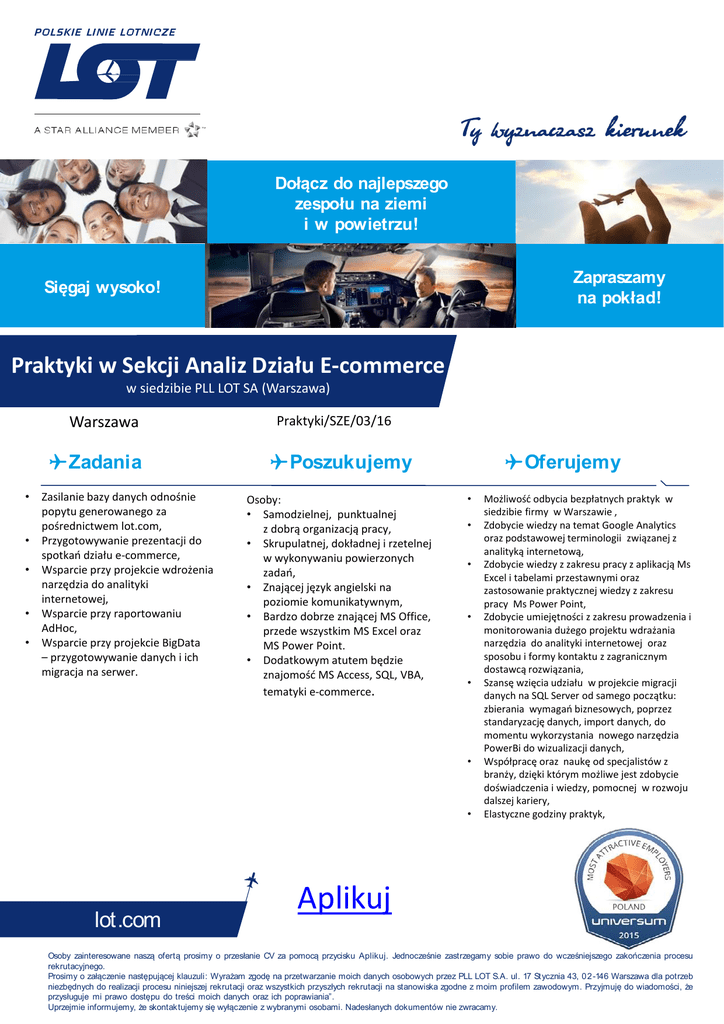 Dołącz do najlepszego zespołu na ziemi i w powietrzu! Zapraszamy na pokład! Sięgaj wysoko! Praktyki w Sekcji Analiz Działu E-commerce w siedzibie PLL LOT SA (Warszawa) Warszawa ✈ Zadania • • • • • Zasilanie bazy danych odnośnie popytu generowanego za pośrednictwem lot.com, Przygotowywanie prezentacji do spotkań działu e-commerce, Wsparcie przy projekcie wdrożenia narzędzia do analityki internetowej, Wsparcie przy raportowaniu AdHoc, Wsparcie przy projekcie BigData – przygotowywanie danych i ich migracja na serwer. Praktyki/SZE/03/16 ✈ Poszukujemy Osoby: • Samodzielnej, punktualnej z dobrą organizacją pracy, • Skrupulatnej, dokładnej i rzetelnej w wykonywaniu powierzonych zadań, • Znającej język angielski na poziomie komunikatywnym, • Bardzo dobrze znającej MS Office, przede wszystkim MS Excel oraz MS Power Point. • Dodatkowym atutem będzie znajomość MS Access, SQL, VBA, tematyki e-commerce. ✈ Oferujemy • • • • • • • lot.com Możliwość odbycia bezpłatnych praktyk w siedzibie firmy w Warszawie , Zdobycie wiedzy na temat Google Analytics oraz podstawowej terminologii związanej z analityką internetową, Zdobycie wiedzy z zakresu pracy z aplikacją Ms Excel i tabelami przestawnymi oraz zastosowanie praktycznej wiedzy z zakresu pracy Ms Power Point, Zdobycie umiejętności z zakresu prowadzenia i monitorowania dużego projektu wdrażania narzędzia do analityki internetowej oraz sposobu i formy kontaktu z zagranicznym dostawcą rozwiązania, Szansę wzięcia udziału w projekcie migracji danych na SQL Server od samego początku: zbierania wymagań biznesowych, poprzez standaryzację danych, import danych, do momentu wykorzystania nowego narzędzia PowerBi do wizualizacji danych, Współpracę oraz naukę od specjalistów z branży, dzięki którym możliwe jest zdobycie doświadczenia i wiedzy, pomocnej w rozwoju dalszej kariery, Elastyczne godziny praktyk, Aplikuj Osoby zainteresowane naszą ofertą prosimy o przesłanie CV za pomocą przycisku Aplikuj. Jednocześnie zastrzegamy sobie prawo do wcześniejszego zakończenia procesu rekrutacyjnego. Prosimy o załączenie następującej klauzuli: Wyrażam zgodę na przetwarzanie moich danych osobowych przez PLL LOT S.A. ul. 17 St ycznia 43, 0 2-146 Warszawa dla potrzeb niezbędnych do realizacji procesu niniejszej rekrutacji oraz wszystkich przyszłych rekrutacji na stanowiska zgodne z moim profilem zawodowym. Przyjmuję do wiadomości, że przysługuje mi prawo dostępu do treści moich danych oraz ich poprawiania”. Uprzejmie informujemy, że skontaktujemy się wyłączenie z wybranymi osobami. Nadesłanych dokumentów nie zwracamy.