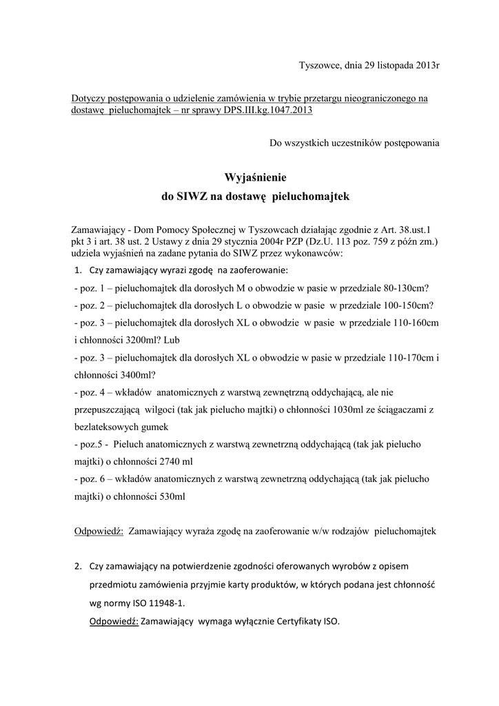 Tyszowce, dnia 29 listopada 2013r Dotyczy postępowania o udzielenie zamówienia w trybie przetargu nieograniczonego na dostawę pieluchomajtek – nr sprawy DPS.III.kg.1047.2013 Do wszystkich uczestników postępowania Wyjaśnienie do SIWZ na dostawę pieluchomajtek Zamawiający - Dom Pomocy Społecznej w Tyszowcach działając zgodnie z Art. 38.ust.1 pkt 3 i art. 38 ust. 2 Ustawy z dnia 29 stycznia 2004r PZP (Dz.U. 113 poz. 759 z późn zm.) udziela wyjaśnień na zadane pytania do SIWZ przez wykonawców: 1. Czy zamawiający wyrazi zgodę na zaoferowanie: - poz. 1 – pieluchomajtek dla dorosłych M o obwodzie w pasie w przedziale 80-130cm? - poz. 2 – pieluchomajtek dla dorosłych L o obwodzie w pasie w przedziale 100-150cm? - poz. 3 – pieluchomajtek dla dorosłych XL o obwodzie w pasie w przedziale 110-160cm i chłonności 3200ml? Lub - poz. 3 – pieluchomajtek dla dorosłych XL o obwodzie w pasie w przedziale 110-170cm i chłonności 3400ml? - poz. 4 – wkładów anatomicznych z warstwą zewnętrzną oddychającą, ale nie przepuszczającą wilgoci (tak jak pielucho majtki) o chłonności 1030ml ze ściągaczami z bezlateksowych gumek - poz.5 - Pieluch anatomicznych z warstwą zewnetrzną oddychającą (tak jak pielucho majtki) o chłonności 2740 ml - poz. 6 – wkładów anatomicznych z warstwą zewnetrzną oddychającą (tak jak pielucho majtki) o chłonności 530ml Odpowiedź: Zamawiający wyraŜa zgodę na zaoferowanie w/w rodzajów pieluchomajtek 2. Czy zamawiający na potwierdzenie zgodności oferowanych wyrobów z opisem przedmiotu zamówienia przyjmie karty produktów, w których podana jest chłonność wg normy ISO 11948-1. Odpowiedź: Zamawiający wymaga wyłącznie Certyfikaty ISO. Pozycja 1. 1. Czy zamawiający wyrazi zgodę na zaoferowanie pieluchomajtek o obwodzie pasa 70110cm? Odpowiedź: Zamawiający dopuszcza proponowany obwód pasa pieluchomajtek Pozycja 2 1. Czy zamawiający wyrazi zgodę na zaoferowanie pieluchomajtek o obwodzie pasa 100-150cm! Odpowiedź: Zamawiający dopuszcza proponowany obwód pasa pieluchomajtek Pozycja 3 1. Czy zamawiający wyrazi zgodę na zaoferowanie pieluchomajtek o obwodzie w pasie 110-170 cm? 2. Odpowiedź: Zamawiający dopuszcza proponowany obwód pasa pieluchomajtek Pozycja 4 i 6 1. Zwracamy się do zamawiającego z prośbą o wyjaśnienie co Zamawiający miał na myśli pisząc ściągacze piankowe? Jednocześnie prosimy o odstąpienie od owych ściągaczy. Odpowiedź: Zamawiający wymaga ściągacze piankowe uwzględniając potrzeby i wymagania mieszkańców. Pozycja 1-3 1. Czy zamawiający wyrazi zgodę na zaoferowanie pieluchomajtek nie posiadających ściągaczy taliowych? Uzasadnienie: Producenci pieluchomajtek stosują róŜne rozwiązania dotyczące lepszego dopasowania się pielucho majtki do ciała min. Pojedynczy ściągacz, rozciągające się przylepcorzepy itp. Badania prowadzone na grupie pacjentów przez naszego producenta ukazały, iŜ ściągacz taliowy umiejscowiony z tyłu u pacjentów leŜących powodował odgniecenia oraz odparzenia w części krzyŜowej. Jednocześnie informujemy, Ŝe ściągacze taliowe nie mają Ŝadnego wpływu na zasadniczą funkcję pieluchomajtek jaką jest wchłanianie moczu. Odpowiedź: Zamawiający wymaga pieluchomajtki ze ściągaczami taliowymi. Jest to podyktowane róŜnym stopniem niepełnosprawności mieszkańców.