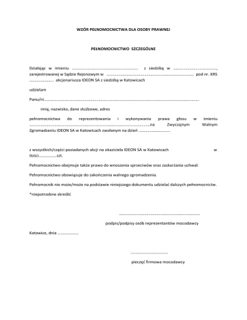 WZÓR PEŁNOMOCNICTWA DLA OSOBY PRAWNEJ PEŁNOMOCNICTWO SZCZEGÓLNE Działając w imieniu ……………………………………………………… z siedzibą w …………………………..………, zarejestrowanej w Sądzie Rejonowym w ……………………………………………………………………….. pod nr. KRS ………………….. akcjonariusza IDEON SA z siedzibą w Katowicach udzielam Panu/ni…………………………………………………………………………………………………………………………………. imię, nazwisko, dane służbowe, adres pełnomocnictwa do reprezentowania i wykonywania prawa głosu w …………………………………………………………………………………………………….na Zwyczajnym Zgromadzeniu IDEON SA w Katowicach zwołanym na dzień ………………………... z wszystkich/części posiadanych akcji na okaziciela IDEON SA w Katowicach ilości……………..szt. imieniu Walnym w Pełnomocnictwo obejmuje także prawo do wnoszenia sprzeciwów oraz zaskarżania uchwał. Pełnomocnictwo obowiązuje do zakończenia walnego zgromadzenia. Pełnomocnik nie może/może na podstawie niniejszego dokumentu udzielać dalszych pełnomocnictw. *niepotrzebne skreślić ……………………….…………………………………………. podpis/podpisy osób reprezentantów mocodawcy Katowice, dnia ……………….. ……………………………… pieczęć firmowa mocodawcy