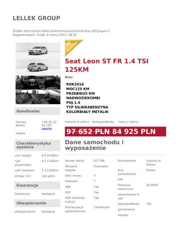 LELLEK GROUP Źródło: http://portal.lellek.pl/lel/komis/auto14318,Seat.pdf?grupa=3 Wygenerowano: Środa, 8 marca 2017, 08:18 sprzedany Seat Leon ST FR 1.4 TSI 125KM Nowy ROK2016 MOC125 KM PRZEBIEG5 KM NADWOZIEKOMBI POJ.1.4 TYP SILNIKABENZYNA KOLORBIAŁY METALIK Handlowiec Tomasz Nowos +48 32 33 59 230 zapytaj mobile Charakterystyka spalania kupiony w polsce bezwypadkowy 97 652 PLN 84 925 PLN Dane samochodu i wyposażenie cykl miejski 6.8 l/100km cykl pozamiejski 4.5 l/100km Numer oferty 027786 manualna cykl mieszany 5.3 l/100km Skrzynia biegów emisja CO2 124 g/km Ilość miejsc 5 Poduszki 7 ABS Tak ESP Tak ASR (kontrola trakcji) Tak Klimatyzacja automatyczna Climatronic Gwarancja Gwarancja dostępna Ubezpieczenie Ubezpieczenie dostępne nowy z salonu Pochodzenie kupiony w Polsce Kraj pochodzenia Polska VIN Pierwsza rejestracja 00-0000 serwisowany w aso bezwypadkowy garażowany książka Tak Elektryczne szyby Kredyt Kredyt dostępny serwisowa I właściciel kupiony w salonie tunning homologacja stan idealny właściciel niepalący Zeskanuj kod, aby zobaczyć ofertę online Tak Elektryczne lusterka Tak Wspomaganie kierownicy Tak Komputer Tak Radioodtwarza cz Tak Immobilizer Tak Centralny zamek Tak Światła przeciwmgieln e Tak Czujnik deszczu Tak Czujniki parkowania Tak Kierownica wielofunkcyjna Tak Podgrzewane fotele Tak Tempomat Tak Asystent pasa ruchu Tak Kamera cofania Tak Bluetooth Tak Czujniki parkowania przód Tak Światła LED Tak Alufelgi 17" Miejsce postoju Gliwice ul. Portowa 2 Opis dodatkowy Samochód fabrycznie NOWY Samochód dealera LELLEK GLIWICE, nr: 027786 Pojazd dostępny fizycznie w salonie Seat Auto Centrum Gliwice przy ul. Portowej 2 Pojazd posiada 4 letnią gwarancję fabryczną. SEAT LEON 1.4 TSI 125 KM FR (Formula Racing) Wybrane elementy standardowego wyposażenia: - 7 poduszek powietrznych - System automatycznego hamowania po kolizji - ASR + ABS + ESC i system kontroli ciśnienia powietrza w oponach - XDS i Asystent Podjazdu - 17-calowe felgi aluminiowe typu Dynamic 30/2 - Zawieszenie typu FR - Przyciemniane szyby cz. tylnej - Pełne światła LED2 + światła dzienne LED + światło tylne LED - Elektrycznie sterowane szyby boczne z przodu i z tyłu - Elektryczne, podgrzewane i składane lusterka boczne - Komputer pokładowy - Centralny zamek ze zdalnym sterowaniem, dwa składane kluczyki - Tempomat - 3,5-calowy monochromatyczny wyświetlacz komputera - Zestaw Media System Colour z 5-calowym, kolorowym ekranem dotykowym:MP3/WMA, Złącza:USB/karta SD/Bluetooth®/CD/AUX-in z 8 głośnikami - Automatyczna klimatyzacja dwustrefowa (Climatronic) - SEAT Drive Profile: 4 profile jazdy - Fotel kierowcy i pasażera z regulacją podparcia odcinka lędźwiowego i wysokości - Sportowe przednie fotele z obiciem z tkaniny i skóry - Składane i dzielone oparcie tylnej kanapy - Kierownica wielofunkcyjna i rączka hamulca ręcznego obszyte skórą - Czujniki parkowania z tyłu Dodatkowo Pakiet Techno+ zawierający: - Media System Plus z dotykowym ekranem kolorowym 6,5 cala, MP3/WMA, łącza:USB/karta SD/Bluetooth® (strumieniowe przesyłanie muzyki i prowadzenie rozmów telefonicznych)/CD/AUX-in z 8 głośnikami, funkcja rozpoznawania mowy i sterowania głosem; - Kamera cofania - Pakiet praktyczny: Czujnik deszczu, Czujnik zmierzchu (automatyczne światła), Automatyczna funkcja opóźnionego wyłączania świateł Coming and Leaving Home, Automatycznie ściemniające się lusterko wsteczne - Pakiet wspomagania jazdy: Asystent świateł drogowych oraz Asystent pasa ruchu. Dodatkowo Pakiet Comfort+: - Czujniki parkowania z przodu i z tyłu - Aktywny tempomat z Systemem kontroli odstępu - Pakiet zimowy: podgrzewane przednie fotele, spryskiwacze reflektorów z podgrzewaniem płynu w spryskiwaczach CENA KATALOGOWA: 97 652 PLN PLN KORZYŚĆ: 12 727 PLN PLN CENA PROMOCYJNA: 84 925 PLN DOSTĘPNE FORMY FINANSOWANIA ZAKUPU: KREDYT 3,99% LEASING 101,99% PRZYJMUJEMY W ROZLICZENIU AUTA UŻYWANE WSZYSTKICH MAREK W RAZIE PYTAŃ PROSIMY O KONTAKT Z DZIAŁEM HANDLOWYM 32 335 92 31 wew. 0233 * ZDJĘCIA POGLĄDOWE Nota prawna Informacja nie stanowi oferty w rozumieniu art. 66 Kodeksu Cywilnego. Podane dane mają charakter wyłącznie informacyjny. Pełna informacja dostępna jest u handlowca. Sprzedający nie odpowiada za ewentualne błędy lub nieaktualność ogłoszenia.