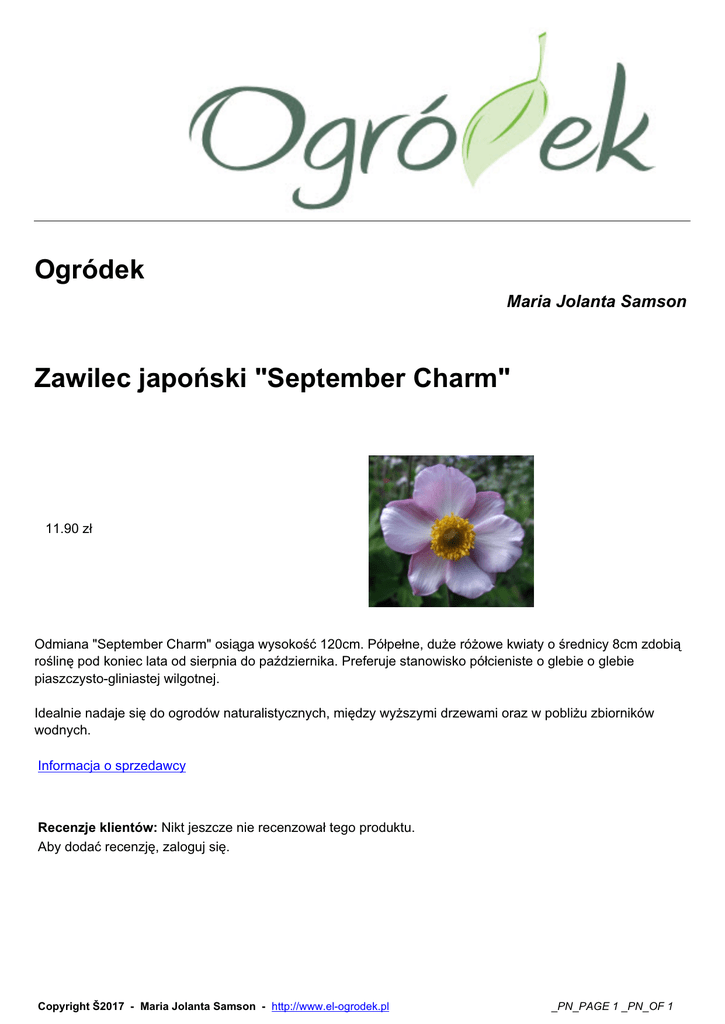 Ogródek Maria Jolanta Samson Zawilec japoński "September Charm" 11.90 zł Odmiana "September Charm" osiąga wysokość 120cm. Półpełne, duże różowe kwiaty o średnicy 8cm zdobią roślinę pod koniec lata od sierpnia do października. Preferuje stanowisko półcieniste o glebie o glebie piaszczysto-gliniastej wilgotnej. Idealnie nadaje się do ogrodów naturalistycznych, między wyższymi drzewami oraz w pobliżu zbiorników wodnych. Informacja o sprzedawcy Recenzje klientów: Nikt jeszcze nie recenzował tego produktu. Aby dodać recenzję, zaloguj się. Copyright Š2017 - Maria Jolanta Samson - http://www.el-ogrodek.pl _PN_PAGE 1 _PN_OF 1