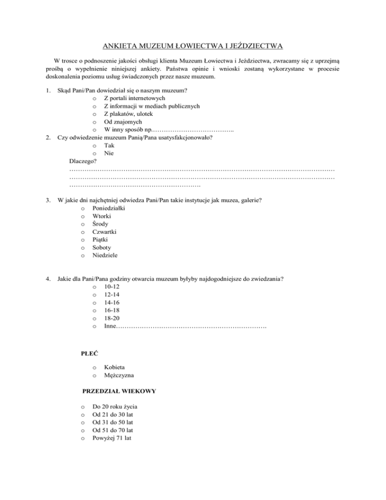 ANKIETA MUZEUM ŁOWIECTWA I JEŹDZIECTWA W trosce o podnoszenie jakości obsługi klienta Muzeum Łowiectwa i Jeździectwa, zwracamy się z uprzejmą prośbą o wypełnienie niniejszej ankiety. Państwa opinie i wnioski zostaną wykorzystane w procesie doskonalenia poziomu usług świadczonych przez nasze muzeum. 1. 2. Skąd Pani/Pan dowiedział się o naszym muzeum? o Z portali internetowych o Z informacji w mediach publicznych o Z plakatów, ulotek o Od znajomych o W inny sposób np.……………………………….. Czy odwiedzenie muzeum Panią/Pana usatysfakcjonowało? o Tak o Nie Dlaczego? …………………………………………………………………………………………………………… …………………………………………………………………………………………………………… ……………………………………………………. 3. W jakie dni najchętniej odwiedza Pani/Pan takie instytucje jak muzea, galerie? o Poniedziałki o Wtorki o Środy o Czwartki o Piątki o Soboty o Niedziele 4. Jakie dla Pani/Pana godziny otwarcia muzeum byłyby najdogodniejsze do zwiedzania? o 10-12 o 12-14 o 14-16 o 16-18 o 18-20 o Inne……………………………………………………………. PŁEĆ o o Kobieta Mężczyzna PRZEDZIAŁ WIEKOWY o o o o o Do 20 roku życia Od 21 do 30 lat Od 31 do 50 lat Od 51 do 70 lat Powyżej 71 lat