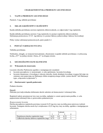 CHARAKTERYSTYKA PRODUKTU LECZNICZEGO 1. NAZWA PRODUKTU LECZNICZEGO Parnirol, 5 mg, tabletki powlekane 2. SKŁAD JAKOŚCIOWY I ILOŚCIOWY Każda tabletka powlekana zawiera ropinirolu chlorowodorek, co odpowiada 5 mg ropinirolu. Każda tabletka powlekana zawiera 5 mg ropinirolu (w postaci ropinirolu chlorowodorku). Substancja pomocnicza: 67,55 mg laktozy (w postaci laktozy jednowodnej i laktozy bezwodnej) Pełny wykaz substancji pomocniczych, patrz punkt 6.1. 3. POSTAĆ FARMACEUTYCZNA Tabletka powlekana. Niebieskie, okrągłe, ze ściętymi krawędziami, obustronnie wypukłe tabletki powlekane z wytłoczoną liczbą „257” na jednej stronie i literą „G” na drugiej stronie. 4. SZCZEGÓŁOWE DANE KLINICZNE 4.1 Wskazania do stosowania Leczenie choroby Parkinsona zgodnie z następującymi zasadami: leczenie początkowe w monoterapii, w celu opóźnienia leczenia lewodopą. leczenie skojarzone z lewodopą w okresie choroby, kiedy działanie lewodopy wygasa lub staje się zmienne oraz pojawiają się fluktuacje efektu terapeutycznego (efekt „końca dawki” lub fluktuacje typu „włączenie-wyłączenie”). 4.2 Dawkowanie i sposób podawania Podanie doustne. Dorośli Zalecane jest indywidualne dobieranie dawki zależnie od skuteczności i tolerancji leku. Ropinirol należy przyjmować trzy razy na dobę, najlepiej w czasie spożywania posiłku, w celu poprawienia tolerancji leku w przewodzie pokarmowym. Rozpoczynanie leczenia Dawka początkowa ropinirolu powinna wynosić 0,25 mg trzy razy na dobę przez pierwszy tydzień leczenia. Następnie dawka może być zwiększana o 0,25 mg trzy razy na dobę, zgodnie z następującym schematem. Pojedyncza dawka ropinirolu (mg) Całkowita dawka dobowa ropinirolu (mg) 1 1 0,25 0,75 Tydzień 2 3 0,5 0,75 1,5 2,25 4 1 3 Schemat leczenia Po początkowym okresie zwiększania dawek, można dalej zwiększać dawki, co tydzień o 0,5 do 1 mg ropinirolu trzy razy na dobę (1,5 do 3 mg/dobę). Reakcja na leczenie może być widoczna podczas stosowania dawek leku od 3 do 9 mg ropinirolu na dobę. Jeśli nie osiągnięto wystarczającej kontroli objawów, dawka ropinirolu może być zwiększana aż do 24 mg na dobę. Stosowanie dawek ropinirolu powyżej 24 mg na dobę nie było badane. Jeżeli leczenie zostało przerwane na dobę lub dłużej, należy rozważyć ponowne rozpoczęcie leczenia opartego na stopniowym zwiększaniu dawek (patrz wyżej). W przypadku stosowania produktu leczniczego Parnirol w leczeniu skojarzonym z lewodopą, może zaistnieć możliwość stopniowego zmniejszenia dawki lewodopy. W badaniach klinicznych dawkę lewodopy zmniejszono stopniowo o około 20% u pacjentów, którym podawano produkt leczniczy Parnirol w leczeniu skojarzonym. U pacjentów z zaawansowaną chorobą Parkinsona, stosujących ropinirol w skojarzeniu z lewodopą, w trakcie początkowego zwiększania dawki ropinirolu mogą wystąpić dyskinezy. W badaniach klinicznych wykazano, że zmniejszenie dawki lewodopy może złagodzić dyskinezy (patrz punkt 4.8). W przypadku zmiany leczenia innym lekiem z grupy agonistów dopaminy na leczenie ropinirolem, należy przed wprowadzeniem ropinirolu zastosować się do zaleceń producenta dotyczących sposobu odstawiania danego leku. Podobnie jak w przypadku innych agonistów dopaminy, ropinirol należy koniecznie odstawiać stopniowo, poprzez zmniejszanie liczby podawanych w ciągu doby dawek leku przez okres jednego tygodnia. Dzieci i młodzież Nie zaleca się stosowania produktu leczniczego Parnirol u dzieci w wieku poniżej 18 lat z uwagi na brak danych dotyczących bezpieczeństwa i skuteczności. Pacjenci w podeszłym wieku U pacjentów w wieku powyżej 65 lat klirens ropinirolu jest zmniejszony. Należy stopniowo zwiększać dawki w zależności od reakcji na leczenie. Niewydolność nerek U pacjentów z łagodną do umiarkowanej niewydolnością nerek (klirens kreatyniny od 30 do50 ml/min), nie ma konieczności dostosowania dawek leku w tej grupie pacjentów. 4.3 Przeciwwskazania Nadwrażliwość na substancję czynną lub na którykolwiek ze składników produktu leczniczego. Ciężka niewydolność nerek (klirens kreatyniny < 30 ml/min). Niewydolność wątroby. 4.4 Specjalne ostrzeżenia i środki ostrożności dotyczące stosowania Należy zachować ostrożność podczas stosowania ropinirolu u pacjentów z ciężkimi chorobami układu krążenia (szczególnie z niewydolnością naczyń wieńcowych), ze względu na farmakologiczne działanie ropinirolu oraz ryzyko obniżenia ciśnienia tętniczego. Zaleca się, aby pacjenci z ciężkimi chorobami układu krążenia (szczególnie z niewydolnością naczyń wieńcowych), mierzyli ciśnienie tętnicze, 2 szczególnie na początku leczenia. Nie badano jednoczesnego stosowania ropinirolu i leków stosowanych w leczeniu nadciśnienia tętniczego i leczeniu arytmii. Należy więc zachować ostrożność stosując jednocześnie leki na nadciśnienie i arytmię oraz ropinirol z powodu ryzyka spadku ciśnienia tętniczego, bradykardii lub innych arytmii. Nie należy stosować ropinirolu w leczeniu poneuroleptycznej akatyzji, tazykinezji (przymus chodzenia spowodowany neuroleptykiem) lub wtórnego zespołu niespokojnych nóg (na przykład spowodowanego niewydolnością nerek, niedokrwistością z niedoboru żelaza lub ciążą). Podczas leczenia ropinirolem może wystąpić paradoksalne nasilenie objawów zespołu niespokojnych nóg polegające na wcześniejszym wystąpieniu objawów (zwiększenie) i ponownym pojawieniu się objawów w godzinach wczesnoporannych (odbicie wczesnym rankiem). Jeśli wystąpi pogorszenie, należy ocenić leczenie ropinirolem i rozważyć dostosowanie dawki lub przerwanie leczenia. Stosowanie ropinirolu u pacjentów z chorobą Parkinsona, związane było z niezbyt częstym występowaniem senności i przypadków nagłego napadu snu (patrz punkt 4.8), jednakże u pacjentów z zespołem niespokojnych nóg objawy te występowały bardzo rzadko. Pacje