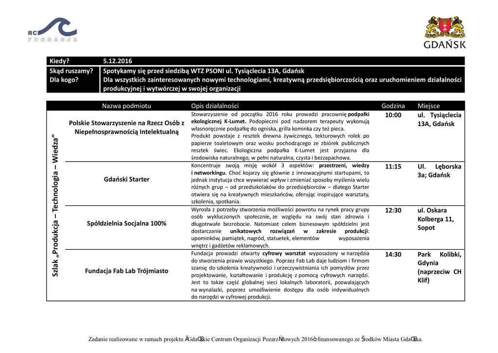 Kiedy? Skąd ruszamy? Dla kogo? 5.12.2016 Spotykamy się przed siedzibą WTZ PSONI ul. Tysiąclecia 13A, Gdańsk Dla wszystkich zainteresowanych nowymi technologiami, kreatywną przedsiębiorczością oraz uruchomieniem działalności produkcyjnej i wytwórczej w swojej organizacji Szlak „Produkcja – Technologia – Wiedza” Nazwa podmiotu Polskie Stowarzyszenie na Rzecz Osób z Niepełnosprawnością Intelektualną Gdański Starter Spółdzielnia Socjalna 100% Fundacja Fab Lab Trójmiasto Opis działalności Stowarzyszenie od początku 2016 roku prowadzi pracownię podpałki ekologicznej K-Lumet. Podopieczni pod nadzorem terapeuty wykonują własnoręcznie podpałkę do ogniska, grilla kominka czy też pieca. Produkt powstaje z resztek drewna żywicznego, tekturowych rolek po papierze toaletowym oraz wosku pochodzącego ze zbiórek publicznych resztek świec. Ekologiczna podpałka K-Lumet jest przyjazna dla środowiska naturalnego, w pełni naturalna, czysta i bezzapachowa. Koncentruje swoją misję wokół 3 aspektów: przestrzeni, wiedzy i networkingu. Choć kojarzy się głownie z innowacyjnymi startupami, to jednak instytucja chce wywierać wpływ i zmieniać sposoby myślenia wielu różnych grup – od przedszkolaków do przedsiębiorców – dlatego Starter otwiera się na kreatywnych mieszkańców, oferując inspirujące warsztaty, szkolenia, spotkania. Wyrosła z potrzeby stworzenia możliwości powrotu na rynek pracy grupy osób wykluczonych społecznie, ze względu na swój stan zdrowia i długotrwałe bezrobocie. Natomiast celem biznesowym spółdzielni jest dostarczanie unikatowych rozwiązań w zakresie produkcji: upominków, pamiątek, nagród, statuetek, elementów wyposażenia wnętrz i gadżetów reklamowych. Fundacja prowadzi otwarty cyfrowy warsztat wyposażony w narzędzia do stworzenia prawie wszystkiego. Poprzez Fab Lab daje ludziom i firmom szansę do szkolenia kreatywności i urzeczywistniania ich pomysłów przez projektowanie, kształtowanie i produkcję z pomocą cyfrowych narzędzi. Jest to także część globalnej sieci lokalnych laboratorii, pozwalających na wynalazki, poprzez umożliwienie dostępu dla osób indywidualnych do narzędzi w cyfrowej produkcji. Godzina 10:00 Miejsce ul. Tysiąclecia 13A, Gdańsk 11:15 Ul. Lęborska 3a; Gdańsk 12:30 ul. Oskara Kolberga 11, Sopot 14:30 Park Kolibki, Gdynia (naprzeciw CH Klif) Zadanie realizowane w ramach projektu „Gdańskie Centrum Organizacji Pozarządowych 2016” finansowanego ze środków Miasta Gdańska.