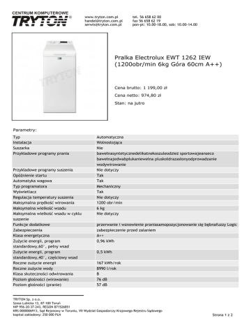 www.tryton.com.pl [email protected] [email protected] tel. 56 658 62 00 fax 56 658 62 19 pon-pt: 10.00-18.00, sob: 10.00-14.00 Pralka Electrolux EWT 1262 IEW (1200obr/min 6kg Góra 60cm A++) Cena brutto: 1 199,00 zł Cena netto: 974,80 zł Stan: na jutro Parametry: Typ Instalacja Suszarka Przykładowe programy prania Przykładowe programy suszenia Opóźnienie startu Automatyka wagowa Typ programatora Wyświetlacz Regulacja temperatury suszenia Maksymalna prędkość wirowania Maksymalna wielkość wsadu Maksymalna wielkość wsadu w cyklu suszenie Funkcje dodatkowe Zabezpieczenia Klasa energetyczna Zużycie energii, program standardowy,60°, pełny wsad Zużycie energii, program standardowy,40°, częściowy wsad Roczne zużycie energii Roczne zużycie wody Klasa skuteczności odwirowania Poziom głośności (wirowanie) Poziom głośności (pranie) Automatyczna Wolnostojąca Nie bawełnasyntetycznedelikatnekoszuleodzież sportowajeanseco bawełnajedwabpłukaniewełna pluskołdrazasłonyodprowadzanie wodywirowanie Nie dotyczy Tak Tak Mechaniczny Tak Nie dotyczy 1200 obr/min 6 kg Nie dotyczy przerwanie i wznowienie praniasamopozycjonowanie się bębnafuzzy Logic zabezpieczenie przed zalaniem A++ 0,96 kWh 0,5 kWh 167 kWh/rok 8990 l/rok B 76 dB 57 dB TRYTON Sp. z o.o. Szosa Lubicka 13, 87-100 Toruń NIP 956-20-37-243, REGON 871526851 KRS 0000006913, Sąd Rejonowy w Toruniu, VII Wydział Gospodarczy Krajowego Rejestru Sądowego kapitał zakładowy: 250 000 PLN Strona 1 z 2 www.tryton.com.pl [email protected] [email protected] Sposób załadunku Kierunek otwierania drzwi Kolor obudowy Moc przyłączeniowa Maks. napięcie zasilania Wysokość Szerokość Głębokość Certyfikaty Strona www produktu tel. 56 658 62 00 fax 56 658 62 19 pon-pt: 10.00-18.00, sob: 10.00-14.00 Góra W górę Biały 2200 W 230 V 89 cm 40 cm 60 cm Woolmark Blue https://www.electrolux.pl/laundry/laundry/washing-machines/top-loade r-washing-machine/ewt1262iew/ Mimo dołożenia wszelkich starań nie gwarantujemy, że publikowane dane techniczne nie zawierają uchybień lub błędów. W przypadku jakichkolwiek wątpliwości prosimy przed podjęciem decyzji o kontakt z handlowcem. Przedstawiona oferta cenowa ma charakter informacyjny, nie stanowi oferty handlowej w rozumieniu Art.66 par.1 Kodeksu Cywilnego oraz innych właściwych przepisów prawnych. TRYTON Sp. z o.o. Szosa Lubicka 13, 87-100 Toruń NIP 956-20-37-243, REGON 871526851 KRS 0000006913, Sąd Rejonowy w Toruniu, VII Wydział Gospodarczy Krajowego Rejestru Sądowego kapitał zakładowy: 250 000 PLN Strona 2 z 2
