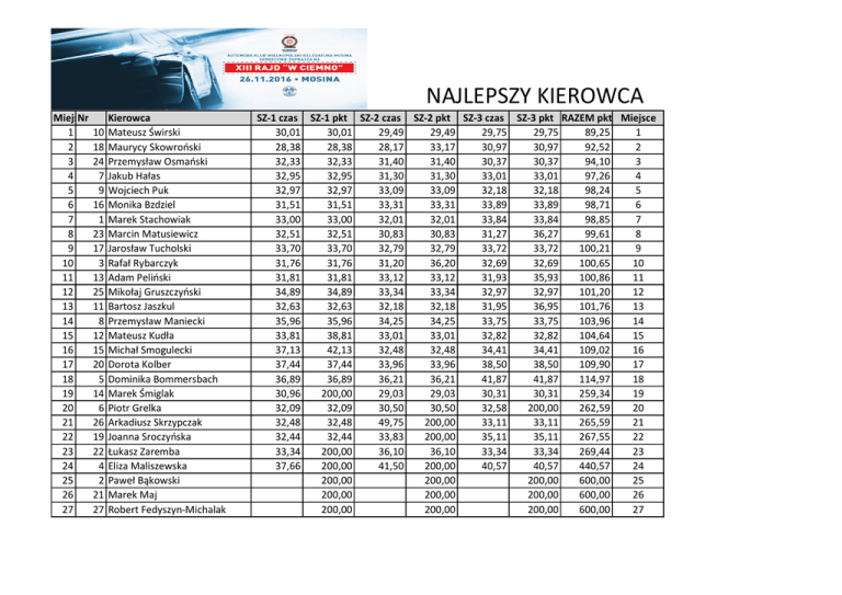 NAJLEPSZY KIEROWCA Miejsce Nr 1 2 3 4 5 6 7 8 9 10 11 12 13 14 15 16 17 18 19 20 21 22 23 24 25 26 27 10 18 24 7 9 16 1 23 17 3 13 25 11 8 12 15 20 5 14 6 26 19 22 4 2 21 27 Kierowca Mateusz Świrski Maurycy Skowroński Przemysław Osmański Jakub Hałas Wojciech Puk Monika Bzdziel Marek Stachowiak Marcin Matusiewicz Jarosław Tucholski Rafał Rybarczyk Adam Peliński Mikołaj Gruszczyński Bartosz Jaszkul Przemysław Maniecki Mateusz Kudła Michał Smogulecki Dorota Kolber Dominika Bommersbach Marek Śmiglak Piotr Grelka Arkadiusz Skrzypczak Joanna Sroczyńska Łukasz Zaremba Eliza Maliszewska Paweł Bąkowski Marek Maj Robert Fedyszyn-Michalak SZ-1 czas SZ-1 pkt SZ-2 czas SZ-2 pkt SZ-3 czas SZ-3 pkt RAZEM pkt Miejsce 30,01 30,01 29,49 29,49 29,75 29,75 89,25 1 28,38 28,38 28,17 33,17 30,97 30,97 92,52 2 32,33 32,33 31,40 31,40 30,37 30,37 94,10 3 32,95 32,95 31,30 31,30 33,01 33,01 97,26 4 32,97 32,97 33,09 33,09 32,18 32,18 98,24 5 31,51 31,51 33,31 33,31 33,89 33,89 98,71 6 33,00 33,00 32,01 32,01 33,84 33,84 98,85 7 32,51 32,51 30,83 30,83 31,27 36,27 99,61 8 33,70 33,70 32,79 32,79 33,72 33,72 100,21 9 31,76 31,76 31,20 36,20 32,69 32,69 100,65 10 31,81 31,81 33,12 33,12 31,93 35,93 100,86 11 34,89 34,89 33,34 33,34 32,97 32,97 101,20 12 32,63 32,63 32,18 32,18 31,95 36,95 101,76 13 35,96 35,96 34,25 34,25 33,75 33,75 103,96 14 33,81 38,81 33,01 33,01 32,82 32,82 104,64 15 37,13 42,13 32,48 32,48 34,41 34,41 109,02 16 37,44 37,44 33,96 33,96 38,50 38,50 109,90 17 36,89 36,89 36,21 36,21 41,87 41,87 114,97 18 30,96 200,00 29,03 29,03 30,31 30,31 259,34 19 32,09 32,09 30,50 30,50 32,58 200,00 262,59 20 32,48 32,48 49,75 200,00 33,11 33,11 265,59 21 32,44 32,44 33,83 200,00 35,11 35,11 267,55 22 33,34 200,00 36,10 36,10 33,34 33,34 269,44 23 37,66 200,00 41,50 200,00 40,57 40,57 440,57 24 200,00 200,00 200,00 600,00 25 200,00 200,00 200,00 600,00 26 200,00 200,00 200,00 600,00 27