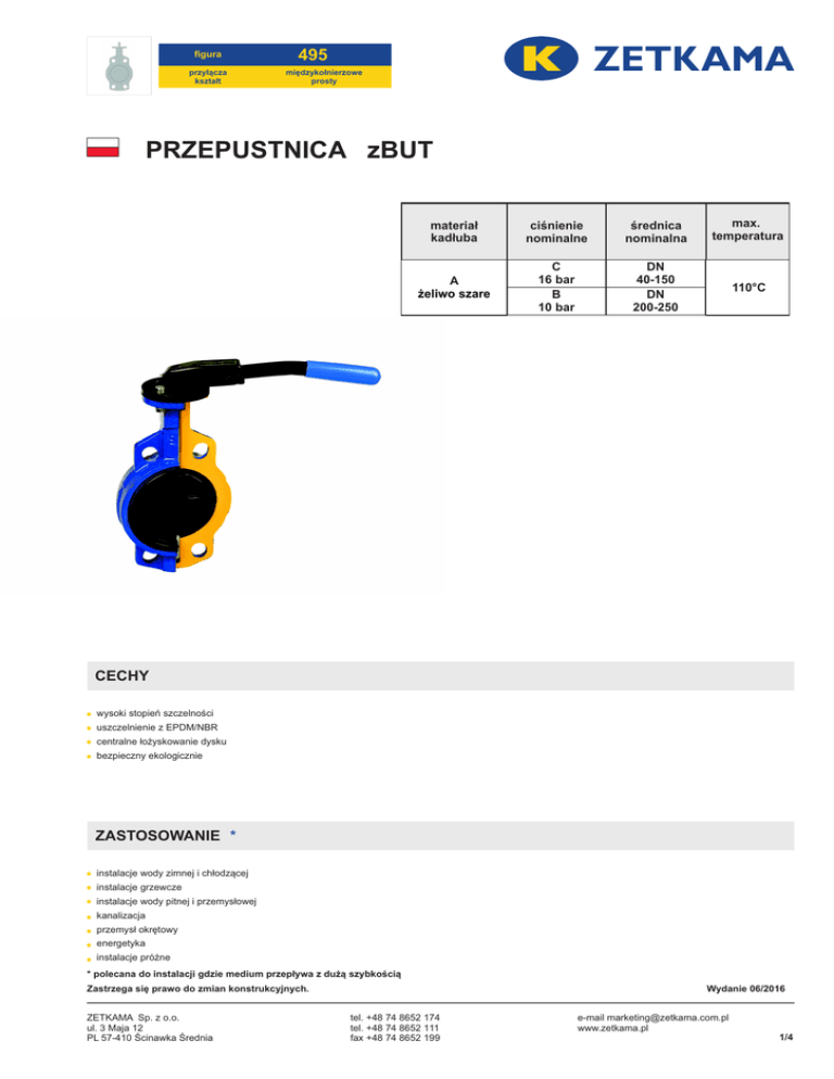 figura przyłącza kształt 495 międzykołnierzowe prosty PRZEPUSTNICA zBUT materiał kadłuba ciśnienie nominalne średnica nominalna max. temperatura A żeliwo szare C 16 bar B 10 bar DN 40-150 DN 200-250 110°C CECHY wysoki stopień szczelności uszczelnienie z EPDM/NBR centralne łożyskowanie dysku bezpieczny ekologicznie ZASTOSOWANIE * instalacje wody zimnej i chłodzącej instalacje grzewcze instalacje wody pitnej i przemysłowej kanalizacja przemysł okrętowy energetyka instalacje próżne * polecana do instalacji gdzie medium przepływa z dużą szybkością Zastrzega się prawo do zmian konstrukcyjnych. ZETKAMA Sp. z o.o. ul. 3 Maja 12 PL 57-410 Ścinawka Średnia Wydanie 06/2016 tel. +48 74 8652 174 tel. +48 74 8652 111 fax +48 74 8652 199 e-mail [email protected] www.zetkama.pl 1/4 495 figura przyłącza kształt międzykołnierzowe prosty MATERIAŁY 4 1 2 3 A materiał kadłuba wykonanie 66 EN-GJL-250 5.1301 (ex.JL 1040) + EPOXY 1 kadłub 2 dysk 3 gniazdo EPDM 4 trzpień AISI 420 EN-GJS-400-15 5.3106 (ex.JS 1030) + EPOXY max. temperatura o 110 C Zastrzega się prawo do zmian konstrukcyjnych. ZETKAMA Sp. z o.o. ul. 3 Maja 12 PL 57-410 Ścinawka Średnia Wydanie 06/2016 tel. +48 74 8652 174 tel. +48 74 8652 111 fax +48 74 8652 199 e-mail [email protected] www.zetkama.pl 2/4 495 figura przyłącza kształt międzykołnierzowe prosty WYMIARY DN A B C D E mm inch 40 1 1/2” 132 63 33 76 30 50 2” 140 80 43 108 30 65 2 1/2” 154 90,5 46 123 80 3” 160 100 46 100 4” 180 113 125 5” 197 150 6” 200 250 F G H J K L Q R ISO kg mm 90 225 110 94 10 70 4x9 2,12 F-07 11 90 250 125 120,7 10 70 4x9 3,25 F-07 30 11 90 274,5 145 139,7 10 70 4x9 3,5 F-07 137 30 11 90 290 160 162,5 10 70 4x9 3,8 F-07 52 165 30 11 90 323 190,5 180 10 70 4x9 4,8 F-07 129 56 191 33 14 90 359 215,9 210 12 70 4x9 6,1 F-07 210 144,5 56 218 33 14 90 387,5 241,3 240 12 70 4x9 7,4 F-07 8” 240 172 60 265 33 14 90 445 298,5 295 12 70 4x9 10,5 F-07 10” 282,5 210 68 324 23 22 130 515,5 362 335 14 102 4x12 20,8 F-10 11 Zastrzega się prawo do zmian konstrukcyjnych. ZETKAMA Sp. z o.o. ul. 3 Maja 12 PL 57-410 Ścinawka Średnia Wydanie 06/2016 tel. +48 74 8652 174 tel. +48 74 8652 111 fax +48 74 8652 199 e-mail [email protected] www.zetkama.pl 3/4 495 figura przyłącza kształt międzykołnierzowe prosty WYKONANIA figura 495 materiał kadłuba średnica nominalna DN A 40-150 C żeliwo szare EN-GJL-250 mm 16bar ciśnienie nominalne PN wykonanie 66 Tmax 110 °C dysk - żeliwo sferoidalne epoksydowane dźwignia zapadkowa uszczelnienie EPDM 66 200-250 B mm 10bar Tmax 110 °C dysk - żeliwo sferoidalne epoksydowane dźwignia zapadkowa uszczelnienie EPDM ZAMAWIANIE Uprasza się o zamawianie produktu wg indeksu figura materiał kadłuba średnica nominalna DN ciśnienie nominalne PN wykonanie 495 A 040 C 66 495 PRZYKŁAD ZAMÓWIENIA 040 C 66 495 przepustnica, przyłącze międzykołnierzowe, kształt prosty A żeliwo szare EN-GJL-250 040 średnica nominalna DN40 C ciśnienie nominalne PN16 dysk - żeliwo sferoidalne epoksydowane dźwignia zapadkowa uszczelnienie EPDM Zastrzega się prawo do zmian konstrukcyjnych. ZETKAMA Sp. z o.o. ul. 3 Maja 12 PL 57-410 Ścinawka Średnia A 66 Wydanie 06/2016 tel. +48 74 8652 174 tel. +48 74 8652 111 fax +48 74 8652 199 e-mail [email protected] www.zetkama.pl 4/4