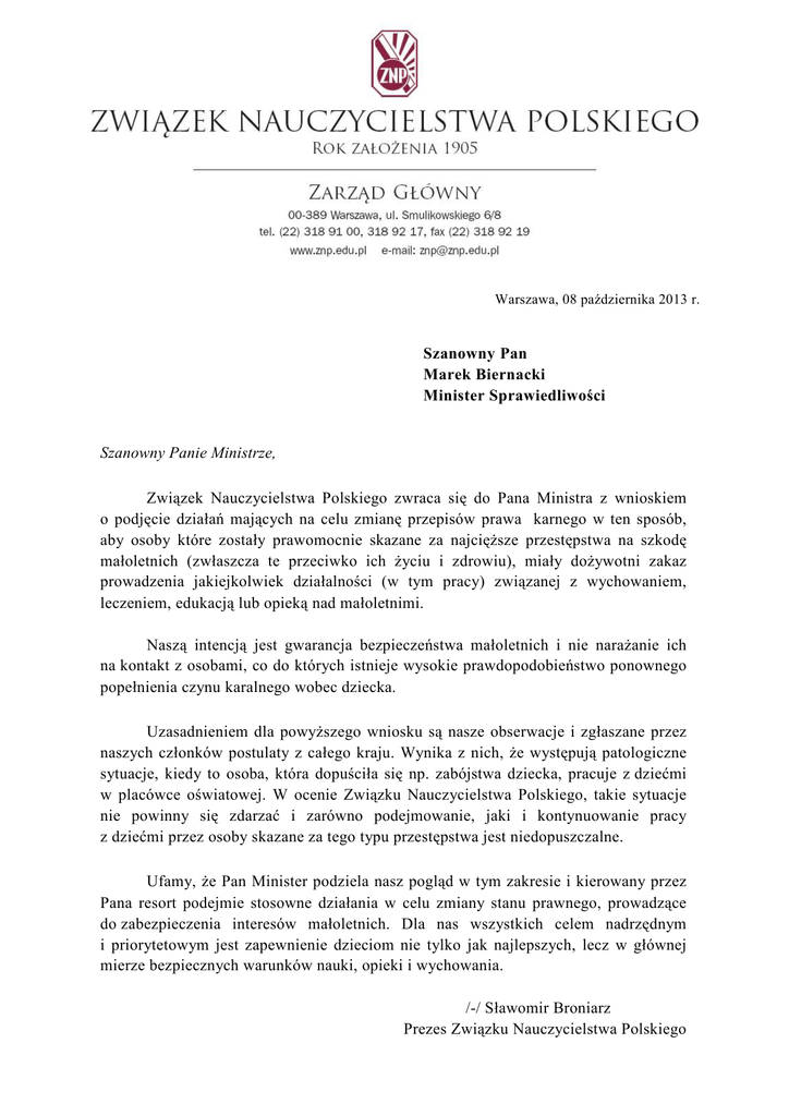 Warszawa, 08 paêdziernika 2013 r. Szanowny Pan Marek Biernacki Minister Sprawiedliwoœci Szanowny Panie Ministrze, Zwi¹zek Nauczycielstwa Polskiego zwraca siê do Pana Ministra z wnioskiem o podjêcie dziaùañ maj¹cych na celu zmianê przepisów prawa karnego w ten sposób, aby osoby które zostaùy prawomocnie skazane za najciê¿sze przestêpstwa na szkodê maùoletnich (zwùaszcza te przeciwko ich ¿yciu i zdrowiu), miaùy do¿ywotni zakaz prowadzenia jakiejkolwiek dziaùalnoœci (w tym pracy) zwi¹zanej z wychowaniem, leczeniem, edukacj¹ lub opiek¹ nad maùoletnimi. Nasz¹ intencj¹ jest gwarancja bezpieczeñstwa maùoletnich i nie nara¿anie ich na kontakt z osobami, co do których istnieje wysokie prawdopodobieñstwo ponownego popeùnienia czynu karalnego wobec dziecka. Uzasadnieniem dla powy¿szego wniosku s¹ nasze obserwacje i zgùaszane przez naszych czùonków postulaty z caùego kraju. Wynika z nich, ¿e wystêpuj¹ patologiczne sytuacje, kiedy to osoba, która dopuœciùa siê np. zabójstwa dziecka, pracuje z dzieãmi w placówce oœwiatowej. W ocenie Zwi¹zku Nauczycielstwa Polskiego, takie sytuacje nie powinny siê zdarzaã i zarówno podejmowanie, jaki i kontynuowanie pracy z dzieãmi przez osoby skazane za tego typu przestêpstwa jest niedopuszczalne. Ufamy, ¿e Pan Minister podziela nasz pogl¹d w tym zakresie i kierowany przez Pana resort podejmie stosowne dziaùania w celu zmiany stanu prawnego, prowadz¹ce do zabezpieczenia interesów maùoletnich. Dla nas wszystkich celem nadrzêdnym i priorytetowym jest zapewnienie dzieciom nie tylko jak najlepszych, lecz w gùównej mierze bezpiecznych warunków nauki, opieki i wychowania. /-/ Sùawomir Broniarz Prezes Zwi¹zku Nauczycielstwa Polskiego