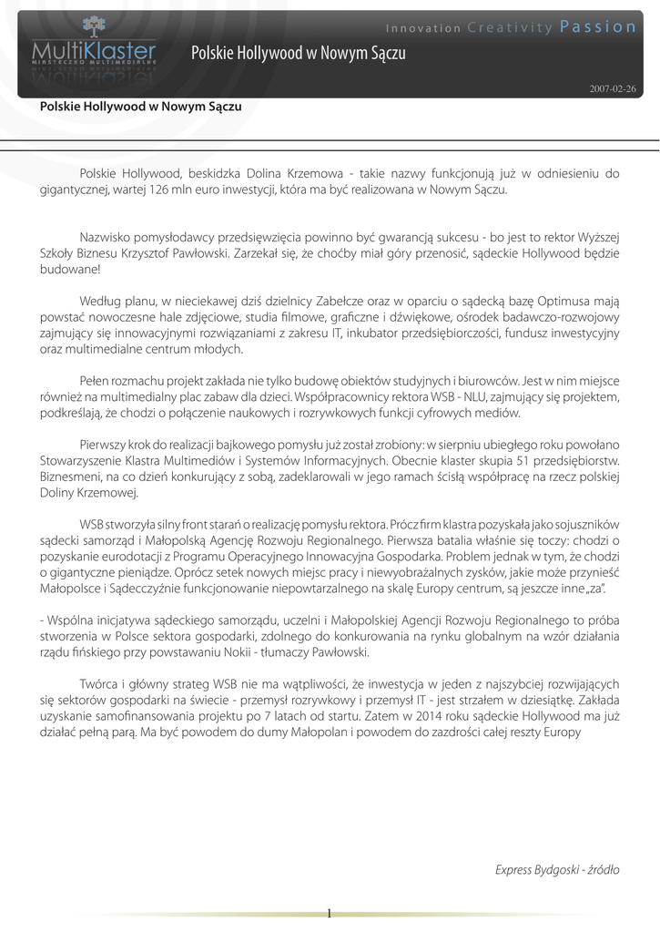 Polskie Hollywood w Nowym Sączu 2007-02-26 Polskie Hollywood w Nowym Sączu Polskie Hollywood, beskidzka Dolina Krzemowa - takie nazwy funkcjonują już w odniesieniu do gigantycznej, wartej 126 mln euro inwestycji, która ma być realizowana w Nowym Sączu. Nazwisko pomysłodawcy przedsięwzięcia powinno być gwarancją sukcesu - bo jest to rektor Wyższej Szkoły Biznesu Krzysztof Pawłowski. Zarzekał się, że choćby miał góry przenosić, sądeckie Hollywood będzie budowane! Według planu, w nieciekawej dziś dzielnicy Zabełcze oraz w oparciu o sądecką bazę Optimusa mają powstać nowoczesne hale zdjęciowe, studia filmowe, graficzne i dźwiękowe, ośrodek badawczo-rozwojowy zajmujący się innowacyjnymi rozwiązaniami z zakresu IT, inkubator przedsiębiorczości, fundusz inwestycyjny oraz multimedialne centrum młodych. Pełen rozmachu projekt zakłada nie tylko budowę obiektów studyjnych i biurowców. Jest w nim miejsce również na multimedialny plac zabaw dla dzieci. Współpracownicy rektora WSB - NLU, zajmujący się projektem, podkreślają, że chodzi o połączenie naukowych i rozrywkowych funkcji cyfrowych mediów. Pierwszy krok do realizacji bajkowego pomysłu już został zrobiony: w sierpniu ubiegłego roku powołano Stowarzyszenie Klastra Multimediów i Systemów Informacyjnych. Obecnie klaster skupia 51 przedsiębiorstw. Biznesmeni, na co dzień konkurujący z sobą, zadeklarowali w jego ramach ścisłą współpracę na rzecz polskiej Doliny Krzemowej. WSB stworzyła silny front starań o realizację pomysłu rektora. Prócz firm klastra pozyskała jako sojuszników sądecki samorząd i Małopolską Agencję Rozwoju Regionalnego. Pierwsza batalia właśnie się toczy: chodzi o pozyskanie eurodotacji z Programu Operacyjnego Innowacyjna Gospodarka. Problem jednak w tym, że chodzi o gigantyczne pieniądze. Oprócz setek nowych miejsc pracy i niewyobrażalnych zysków, jakie może przynieść Małopolsce i Sądecczyźnie funkcjonowanie niepowtarzalnego na skalę Europy centrum, są jeszcze inne „za”. - Wspólna inicjatywa sądeckiego samorządu, uczelni i Małopolskiej Agencji Rozwoju Regionalnego to próba stworzenia w Polsce sektora gospodarki, zdolnego do konkurowania na rynku globalnym na wzór działania rządu fińskiego przy powstawaniu Nokii - tłumaczy Pawłowski. Twórca i główny strateg WSB nie ma wątpliwości, że inwestycja w jeden z najszybciej rozwijających się sektorów gospodarki na świecie - przemysł rozrywkowy i przemysł IT - jest strzałem w dziesiątkę. Zakłada uzyskanie samofinansowania projektu po 7 latach od startu. Zatem w 2014 roku sądeckie Hollywood ma już działać pełną parą. Ma być powodem do dumy Małopolan i powodem do zazdrości całej reszty Europy Express Bydgoski - źródło 1
